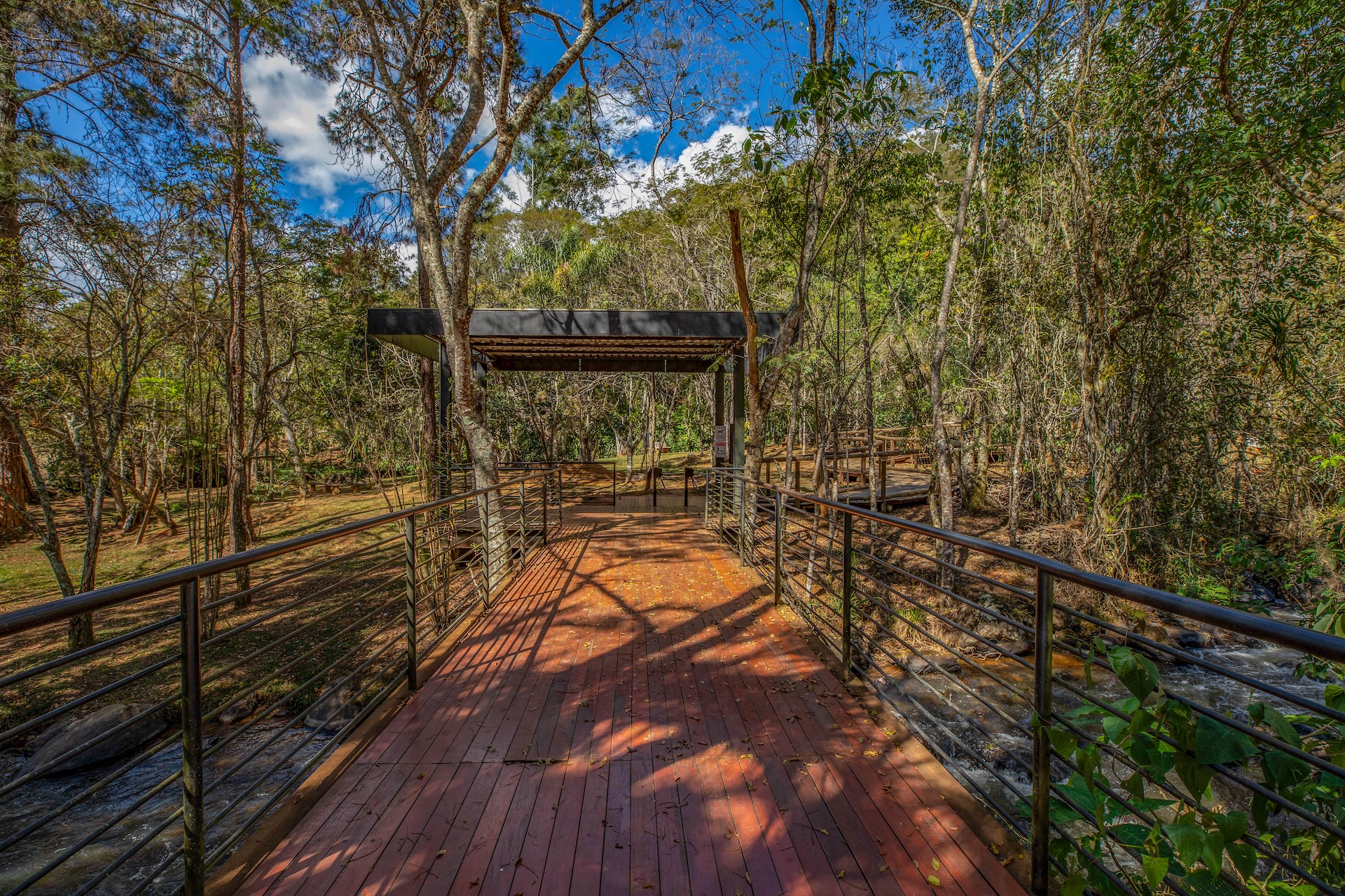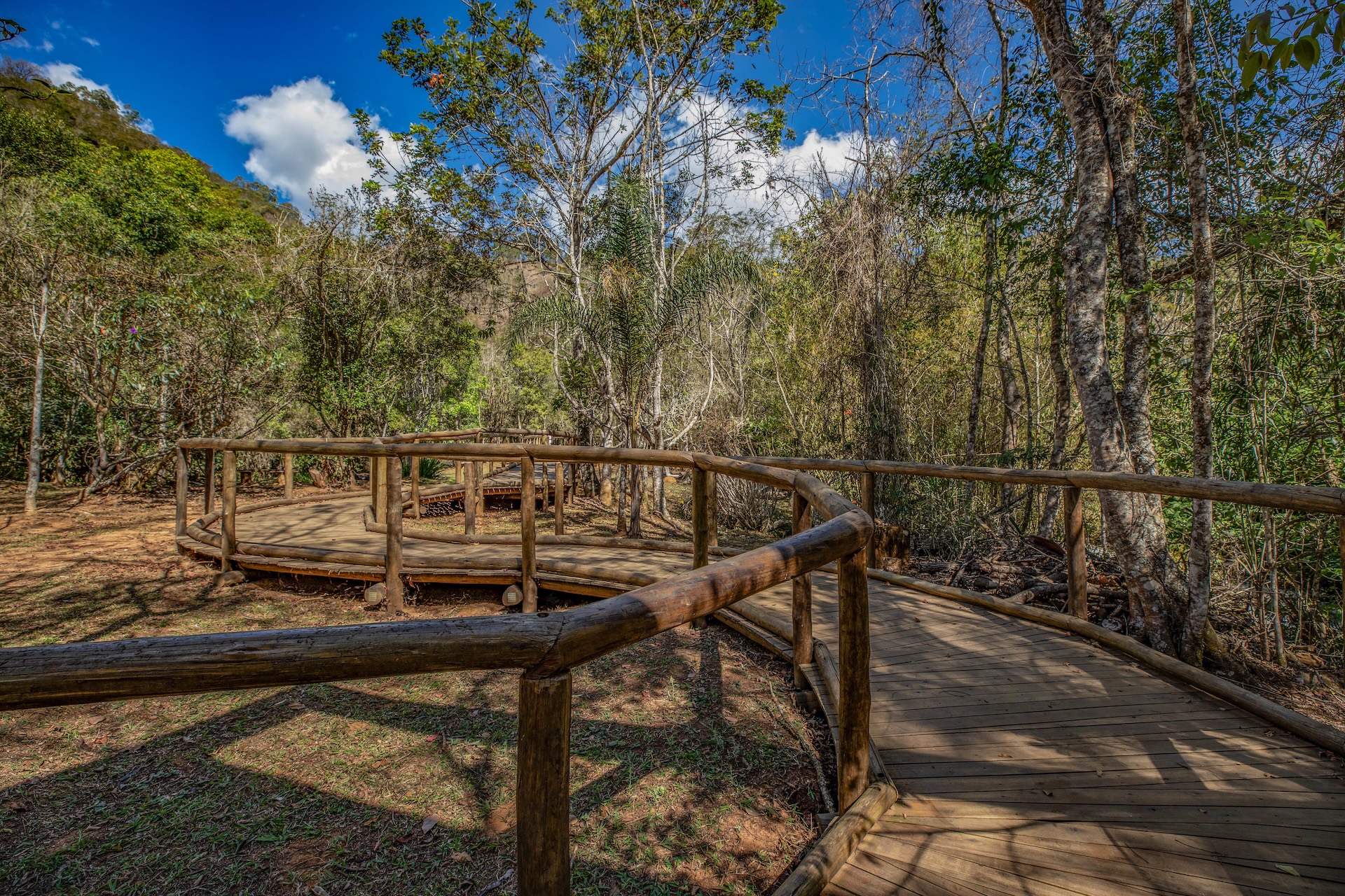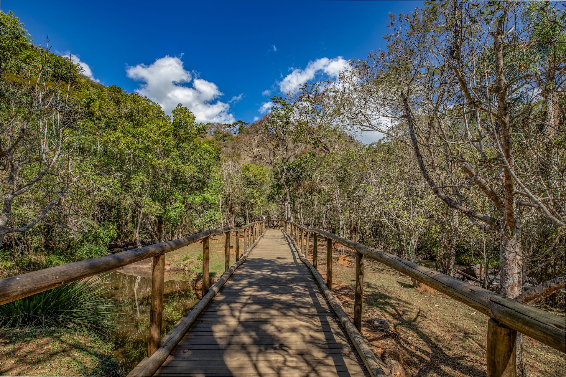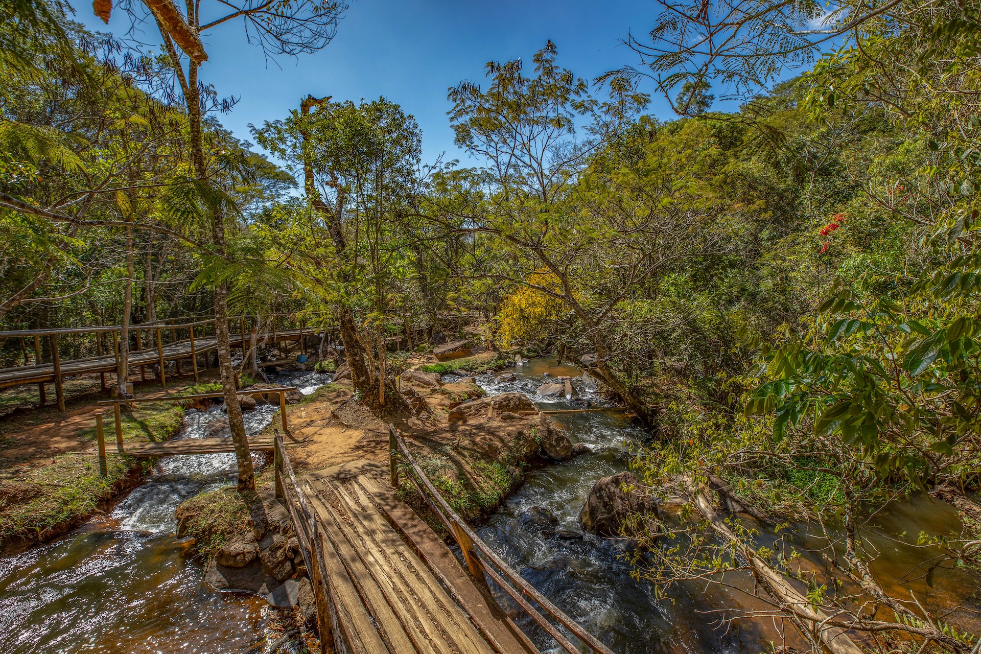 A 154-meter-high waterfall located in an Environmental Protection Area [Área de Proteção Ambiental – APA]. Access is provided by a boardwalk with handrails surrounded by vegetation.
