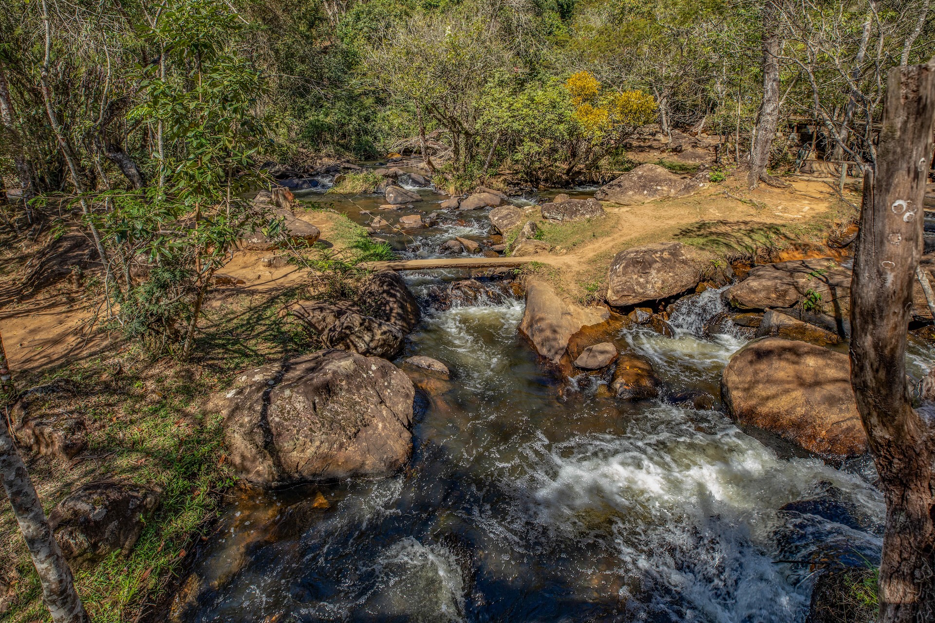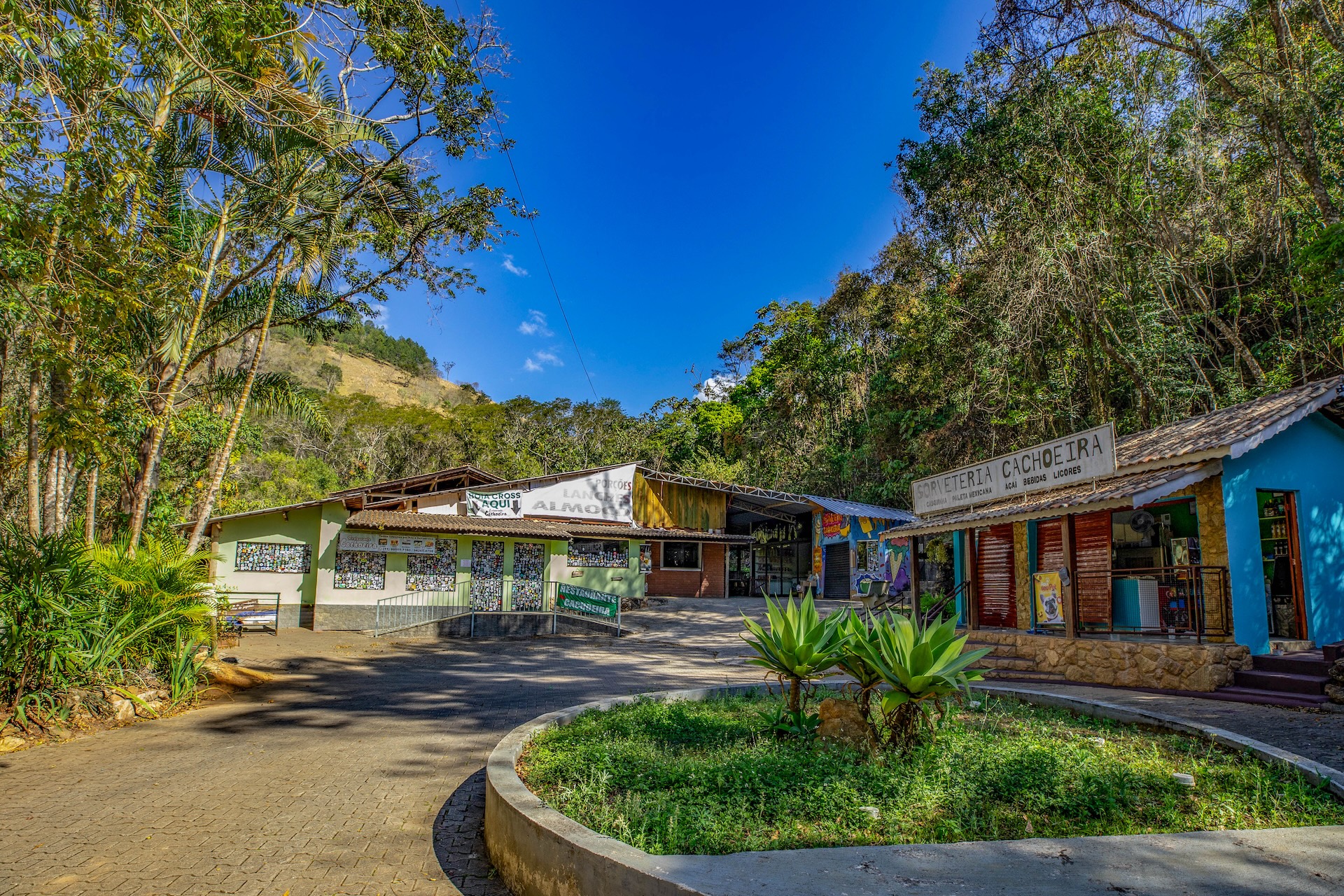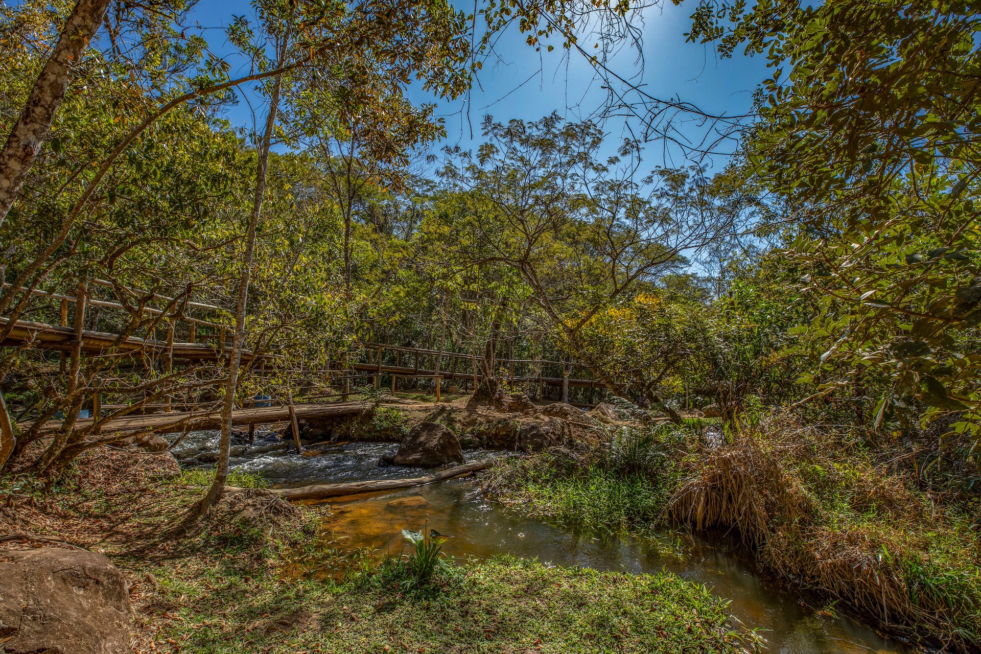 A 154-meter-high waterfall located in an Environmental Protection Area [Área de Proteção Ambiental – APA]. Access is provided by a boardwalk with handrails surrounded by vegetation.