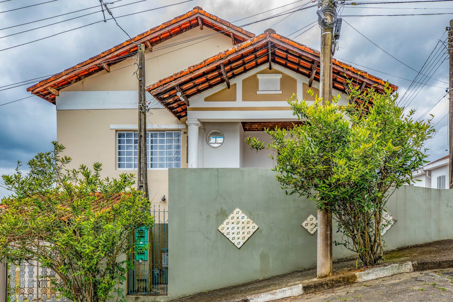 The building features a triangular façade and classical-style columns, complemented by a light beige-and-white color scheme. A frieze along the parapet, ornamental tiles, and an intricately designed veranda railing add to its decorative style.