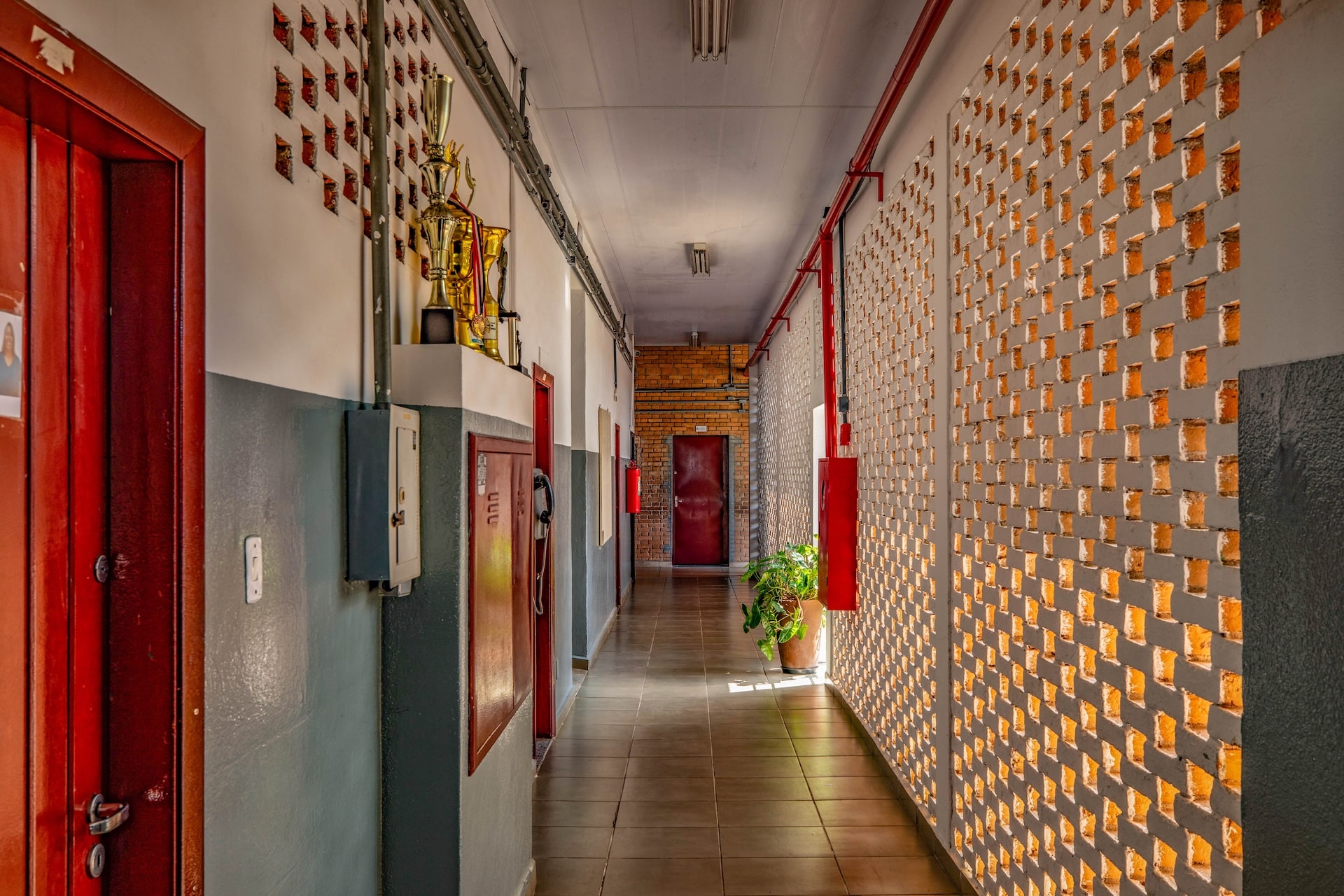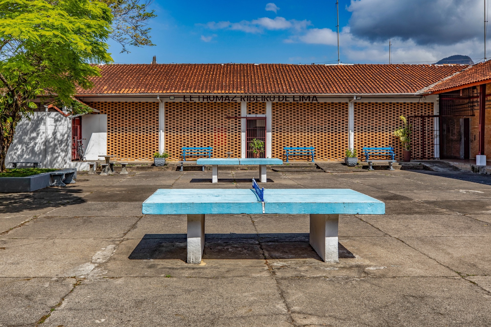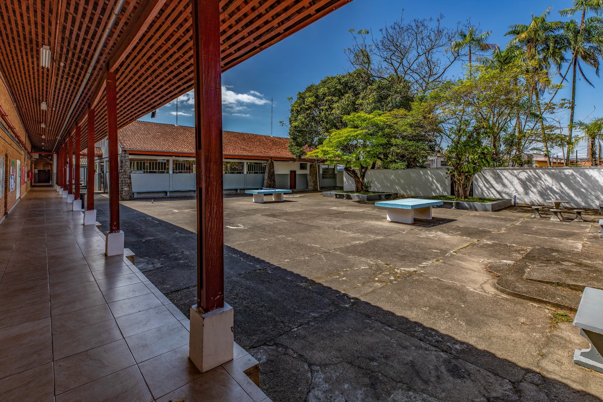 Building featuring terracotta-toned brickwork and a clay-tile roof. Inside, hallways with open brickwork walls open out onto a tree-shaded courtyard.