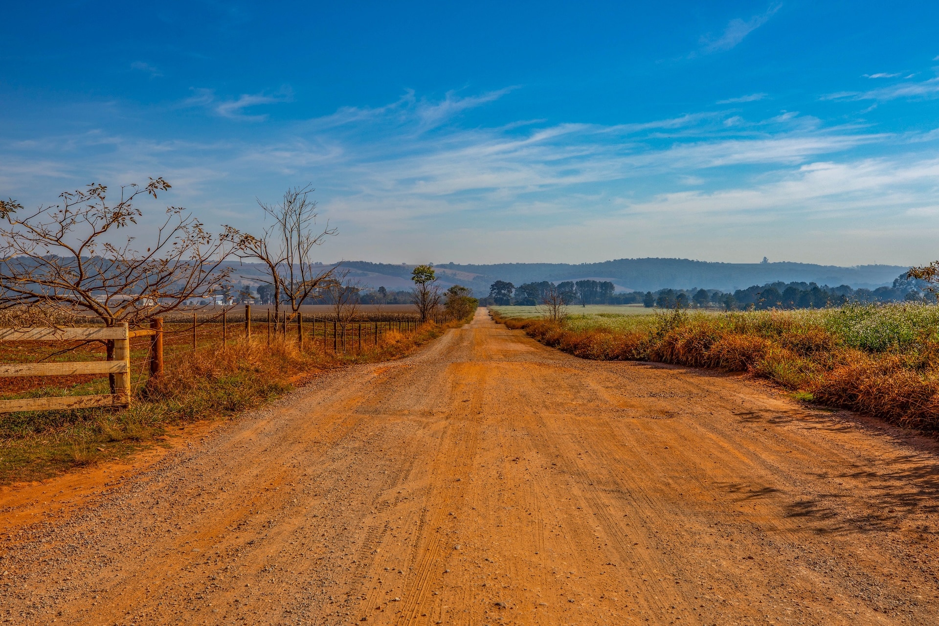 Dirt road cutting through a rural landscape of open fields, with rustic wire fences and distant mountains. Tall cypresses line the route, bordering crop fields and swaths of distinctively red soil.