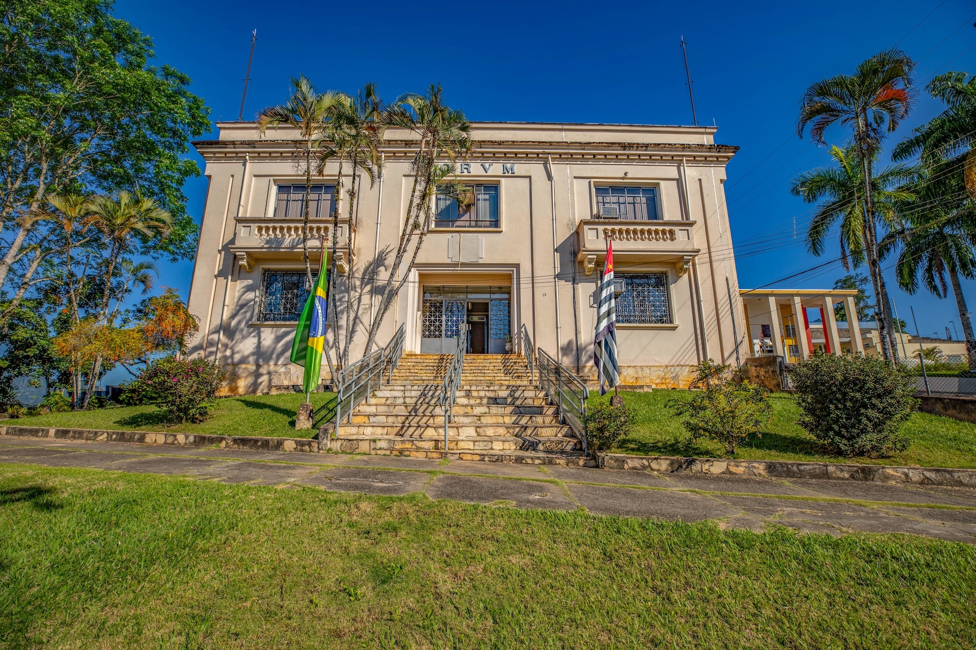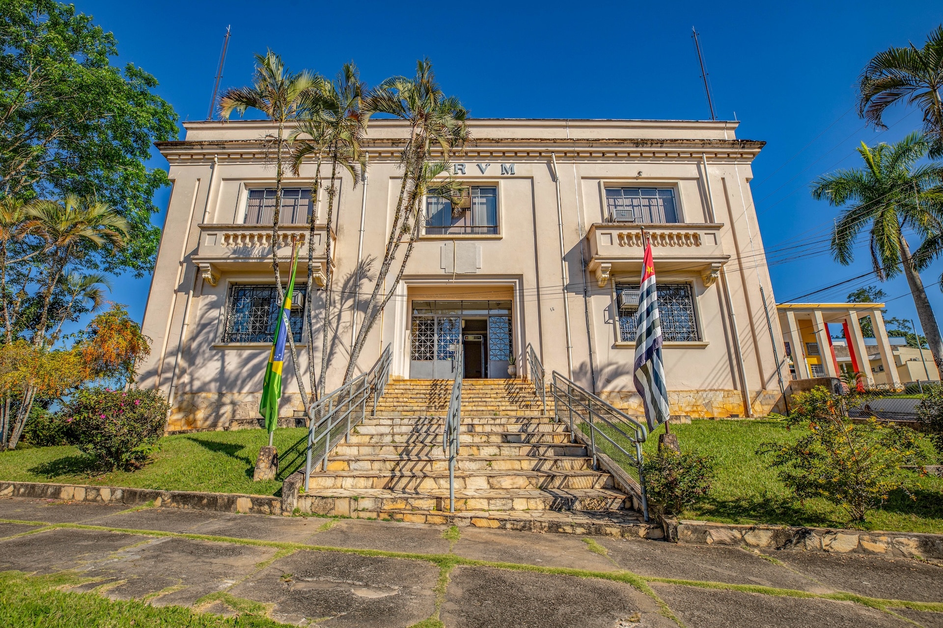 With a symmetrical façade and a central stone staircase, this building showcases simplified neoclassical elements. Its neutral color and understated design lend it a sense of institutional gravitas.