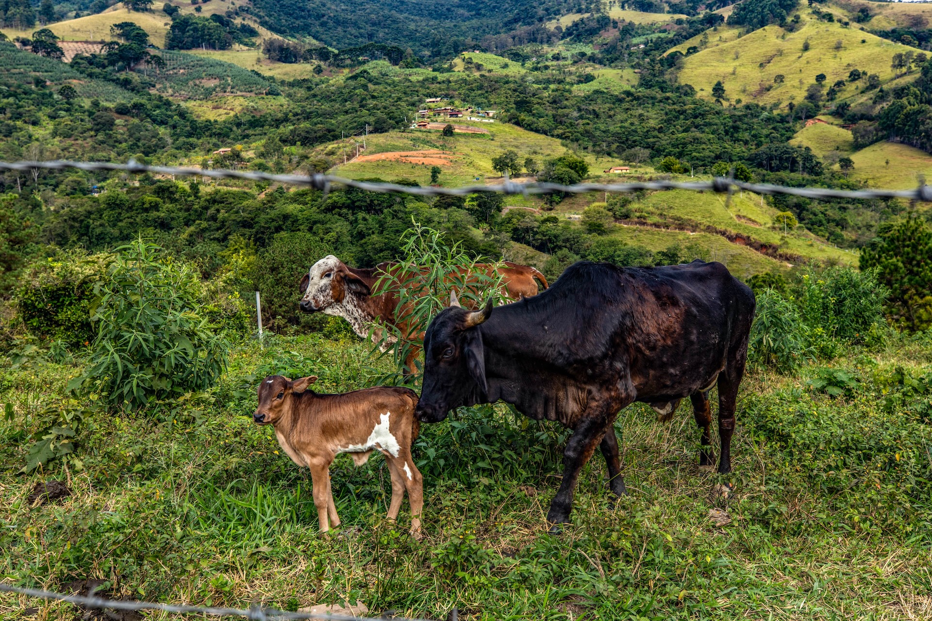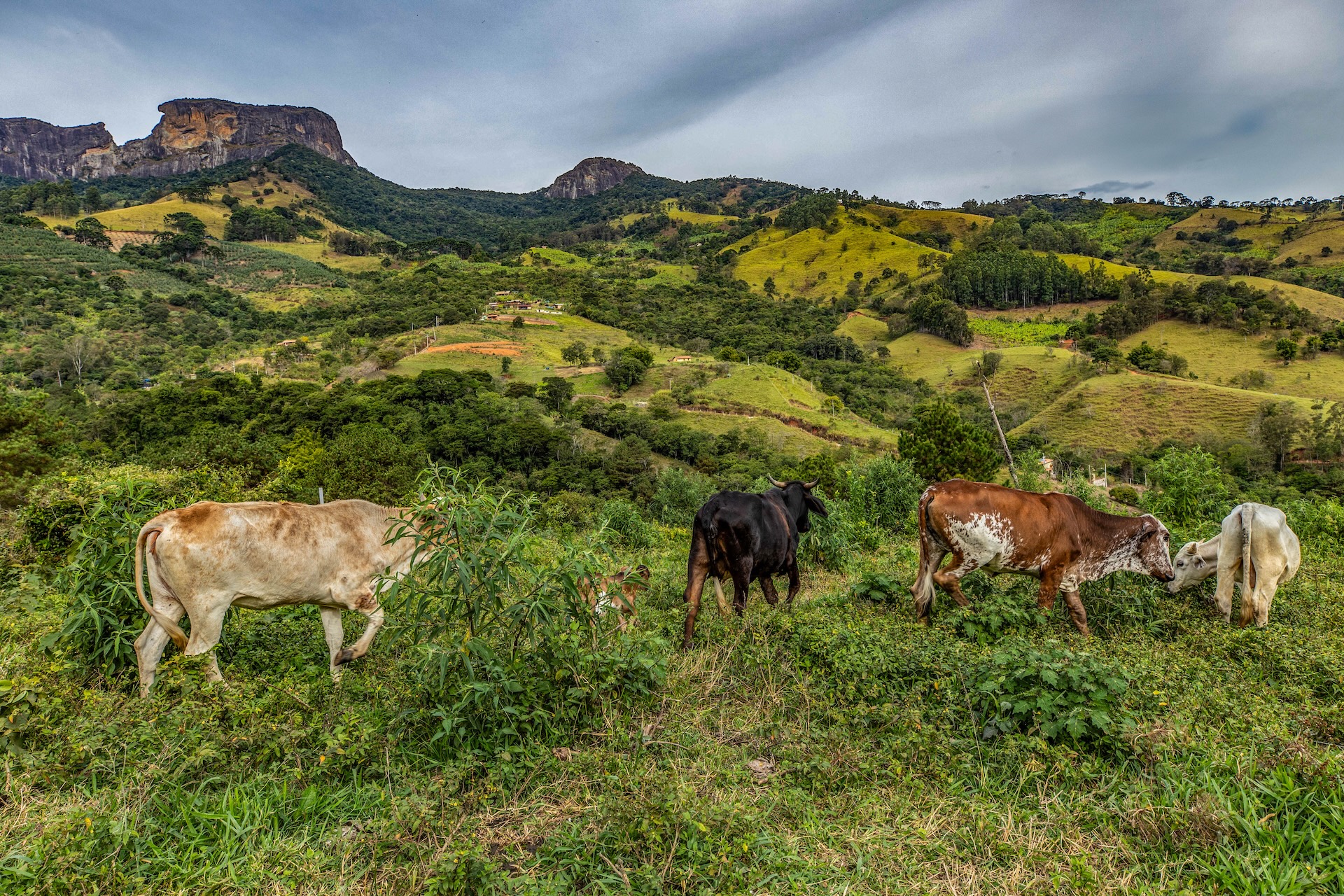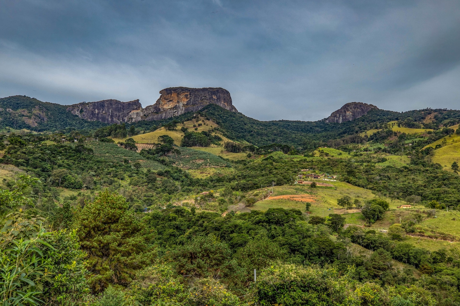 Panoramic view of Pedra do Baú rock formation and rural landscapes in the Serra da Mantiqueira mountain range.