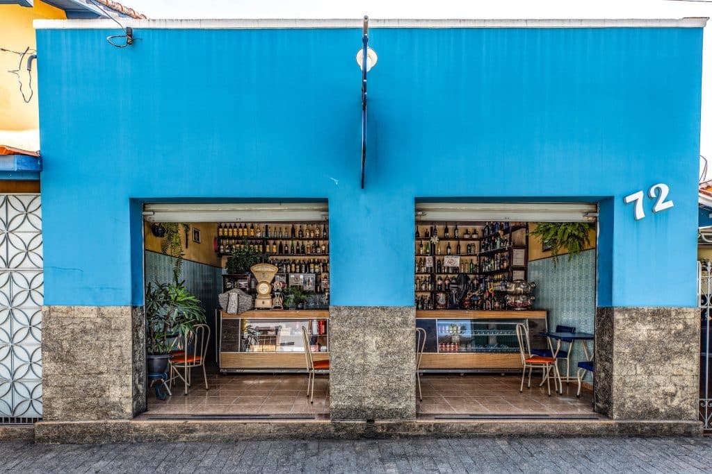 Botequim no centro histórico, situado em rua de paralelepípedo, com fachada azul.