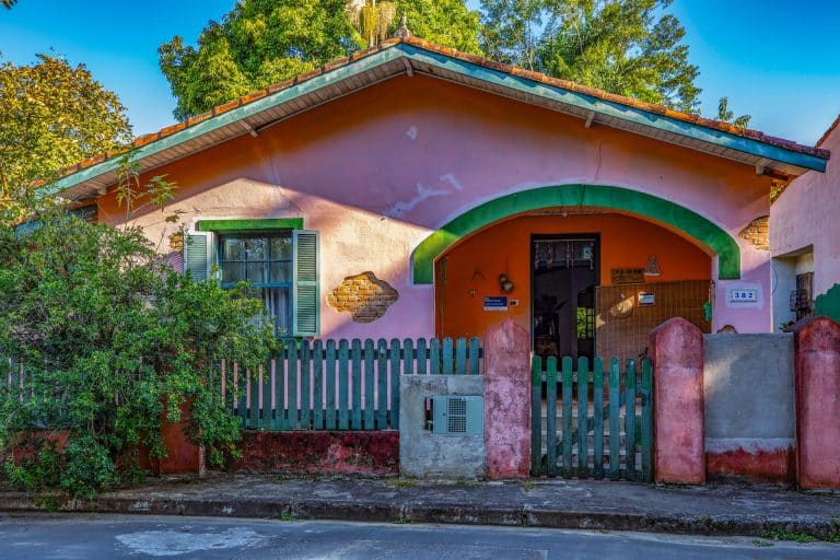 O local exibe um estilo arquitetônico inspirado nos chalés canadenses, com forte influência alpina. As coberturas inclinadas, em tons vibrantes de azul, vermelho e verde, são o principal destaque visual, conferindo personalidade à fachada. A estrutura em madeira off-white e a chaminé de pedra reforçam o estilo rústico e acolhedor, típico das regiões frias.