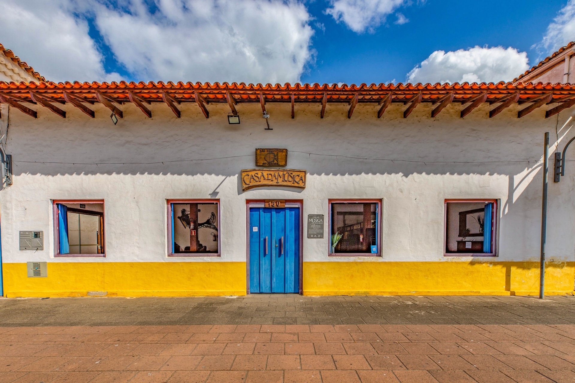 Casario de arquitetura colonial, com fachada plana, paredes brancas, faixa amarela na base, detalhes azuis e cobertura de telhas de barro.
