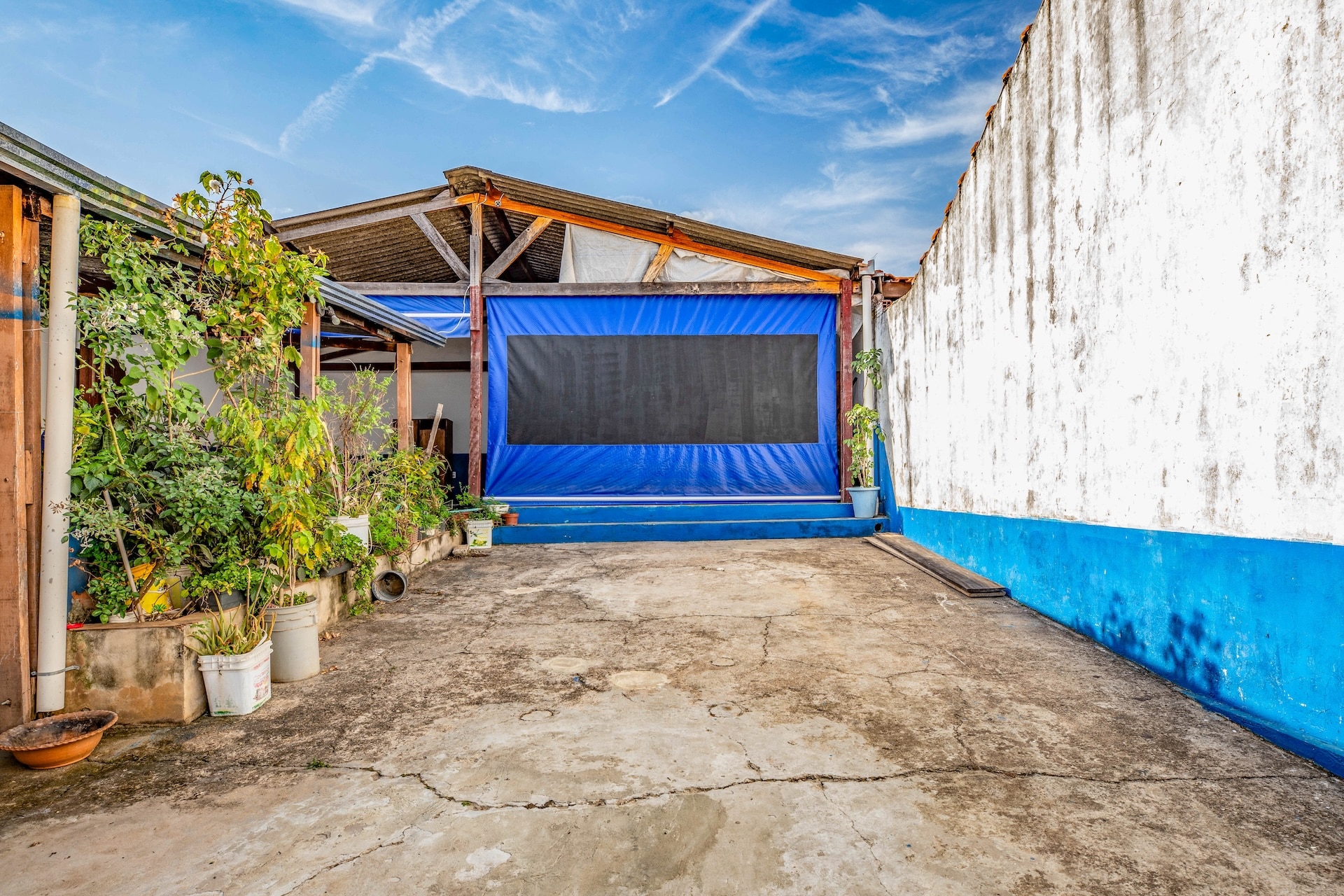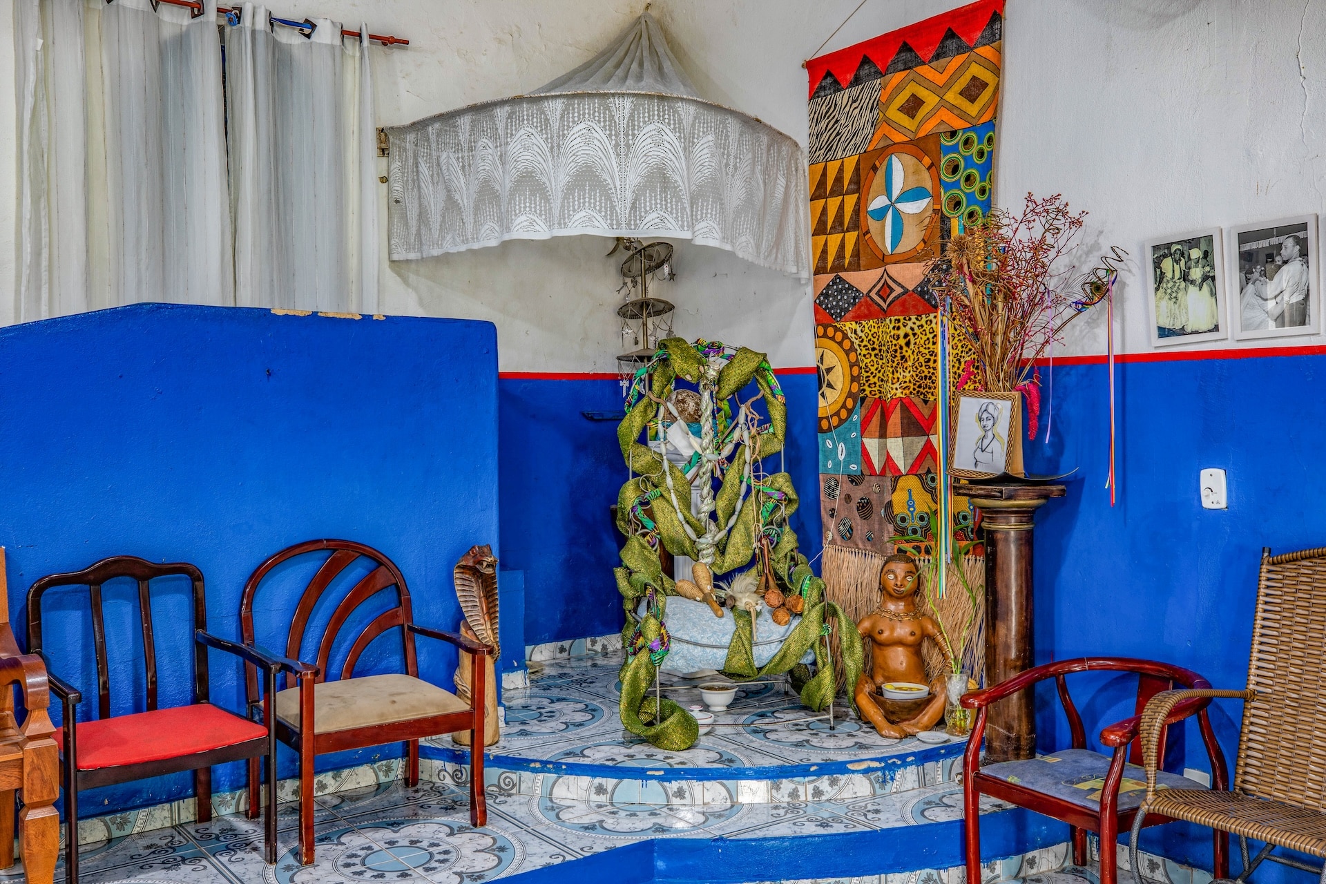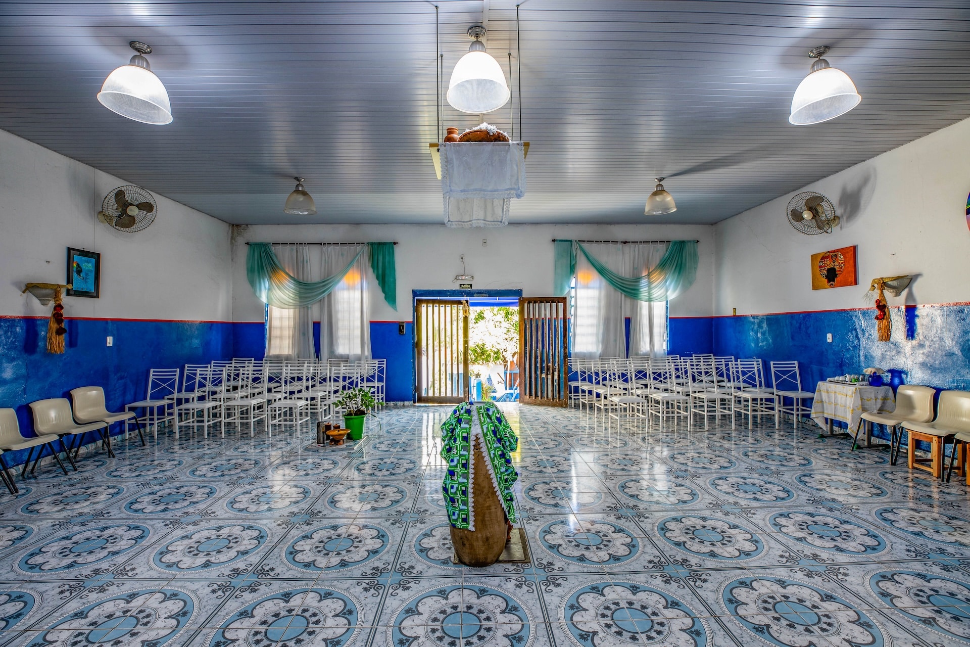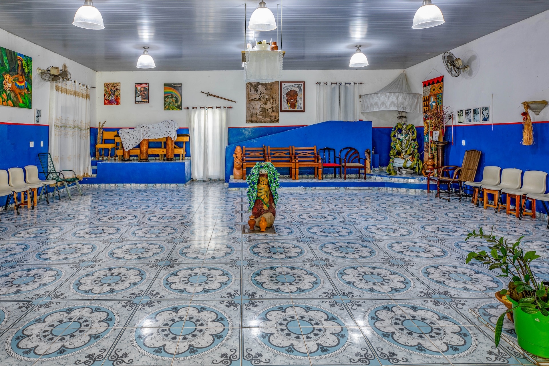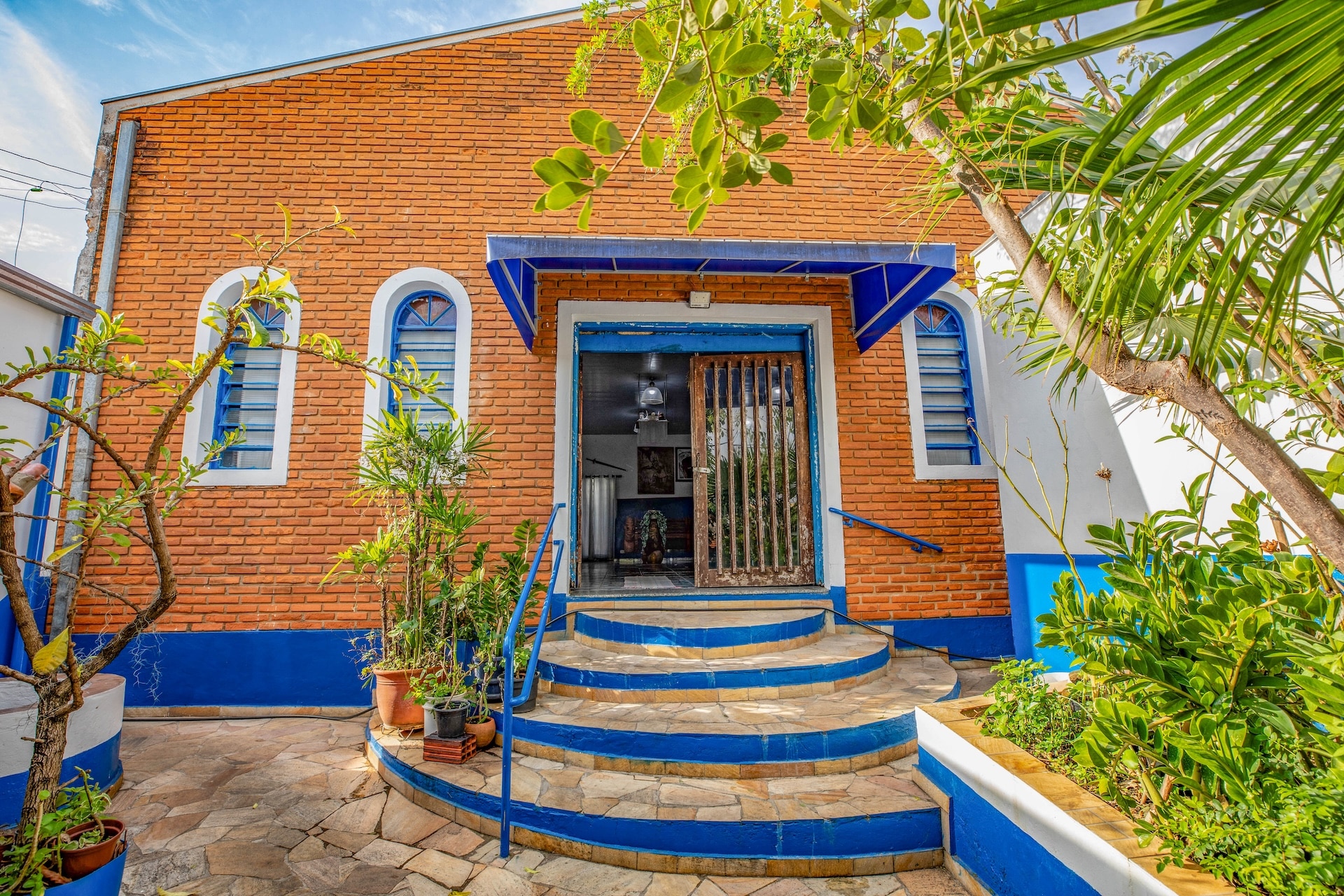 A construção principal destaca-se pela estrutura em tijolos em tom de terracota aparentes, que conferem uma textura rústica, enquanto os detalhes em azul e branco predominam, repetindo-se nos demais espaços decorados com pinturas coloridas que fazem referência aos orixás. A cozinha, com bancada e panelas metálicas à mostra, complementa a estética do conjunto.