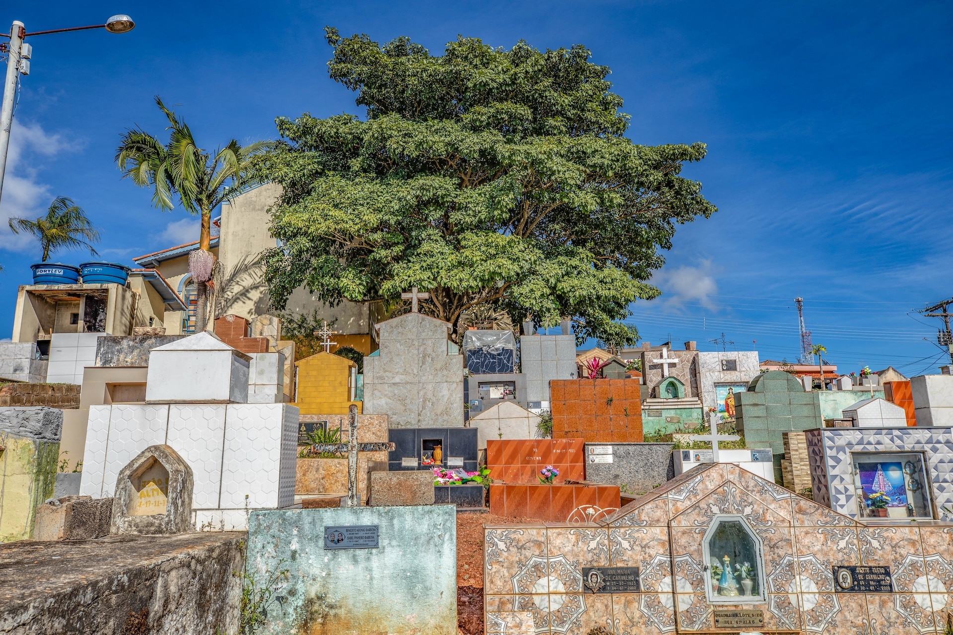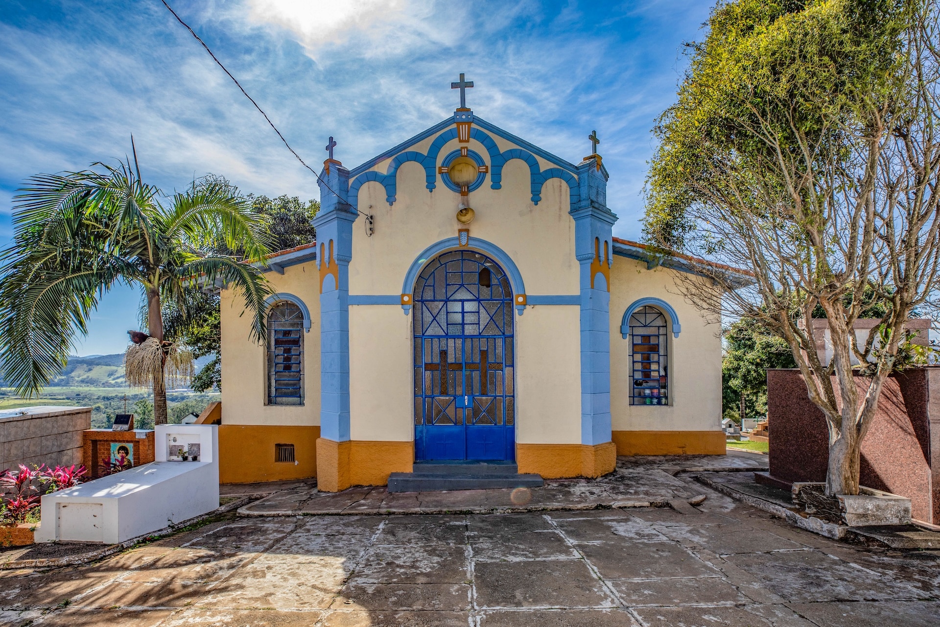 A fachada, em tons de azul, branco e ocre, apresenta estrutura simétrica com pilares robustos, portão de ferro trabalhado e detalhes ornamentais no topo da capela, como arcos, cruzes e elementos geométricos.