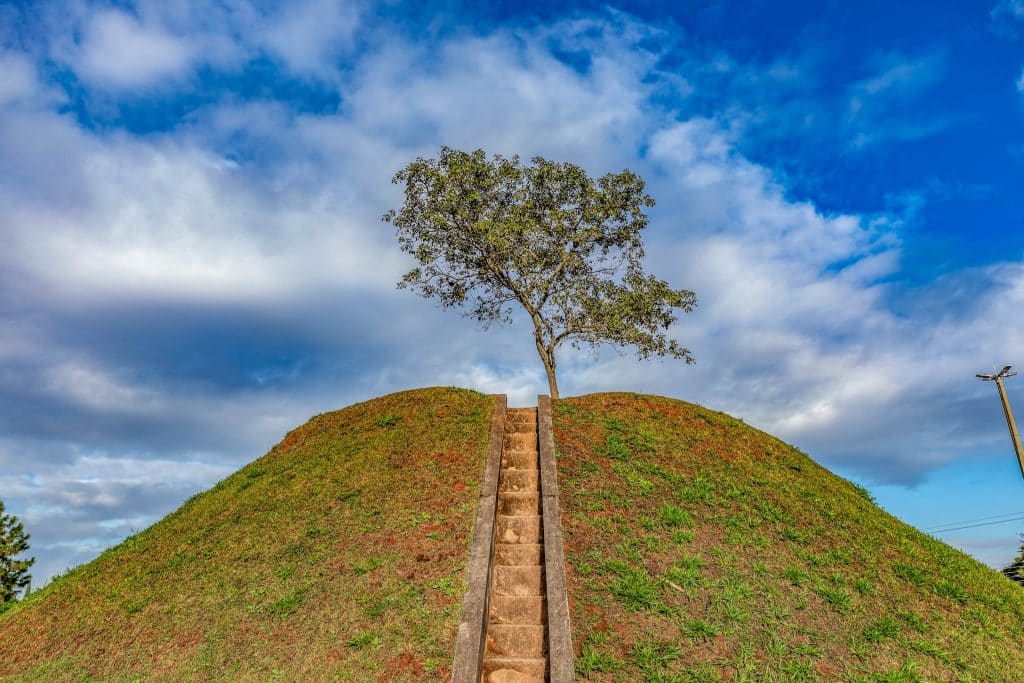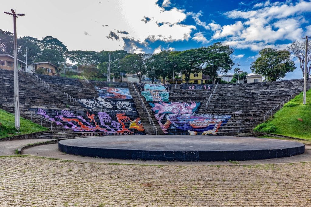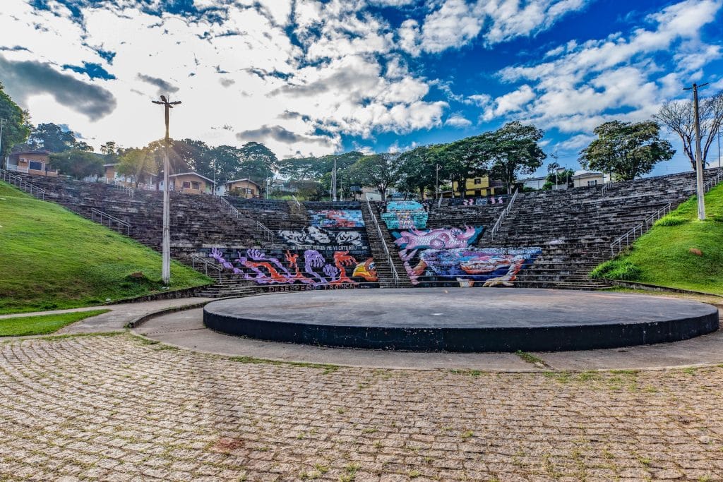 Complexo de arquitetura moderna, com fachada branca e acesso por uma escadaria principal. O entorno, pavimentado com paralelepípedos, abriga uma arena de chão circular elevado, onde grafites coloridos se destacam sobre as escadas pretas, criando um contraste vibrante e contemporâneo.