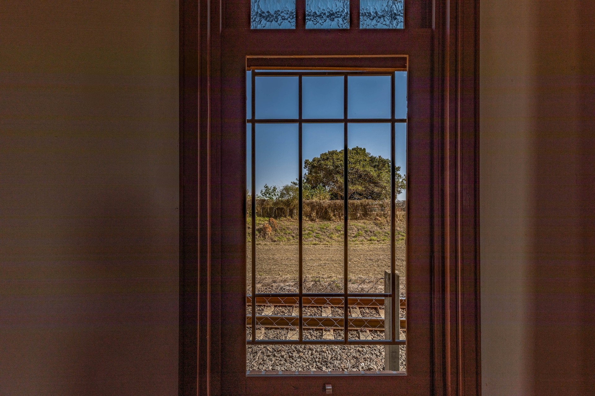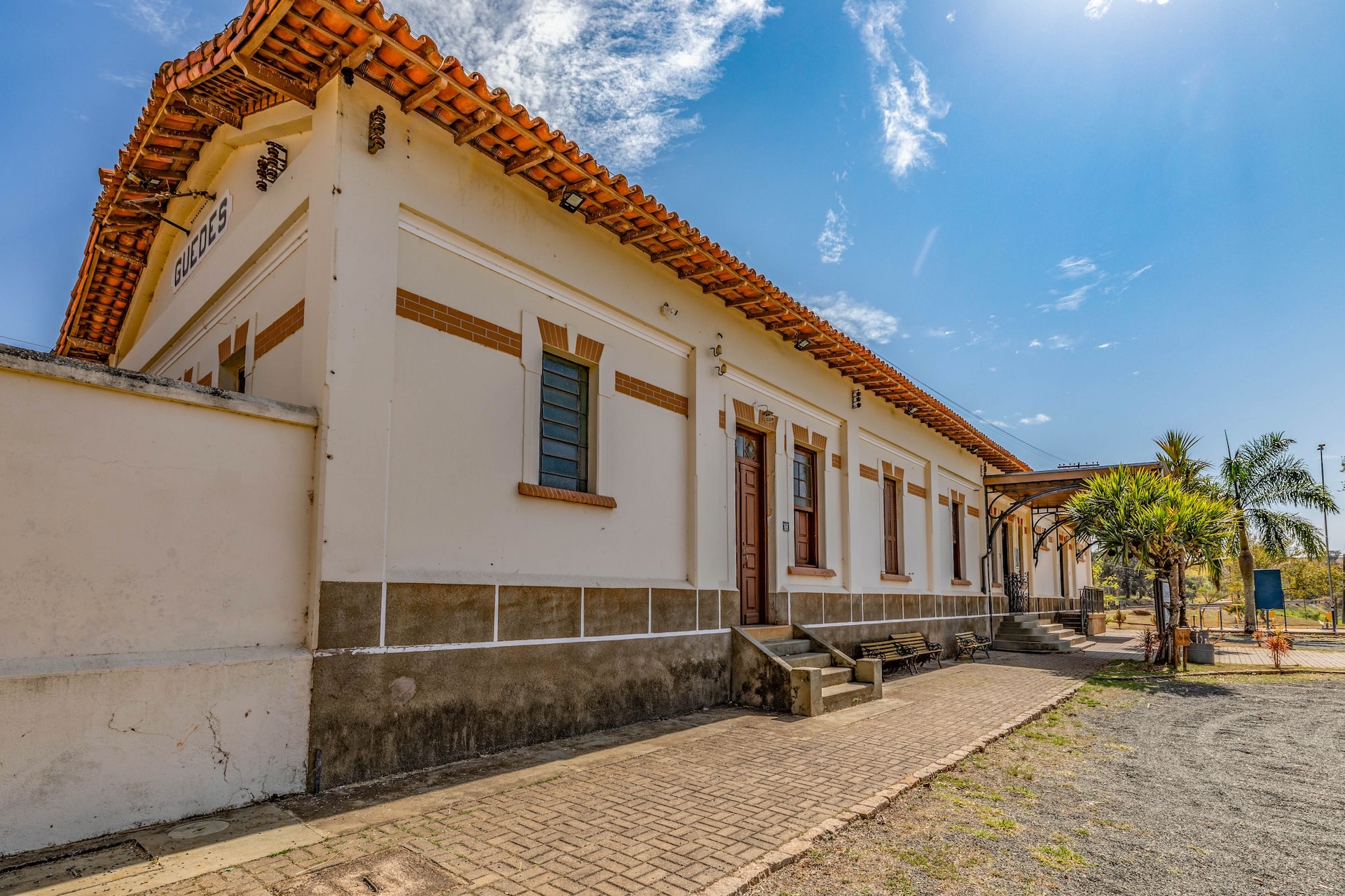 Inaugurada em 1945, a construção apresenta fachada bege com detalhes em marrom e telhado de duas águas coberto por telhas cerâmicas coloniais. A propriedade preserva um trilho de trem por onde ainda passa um trem de carga.