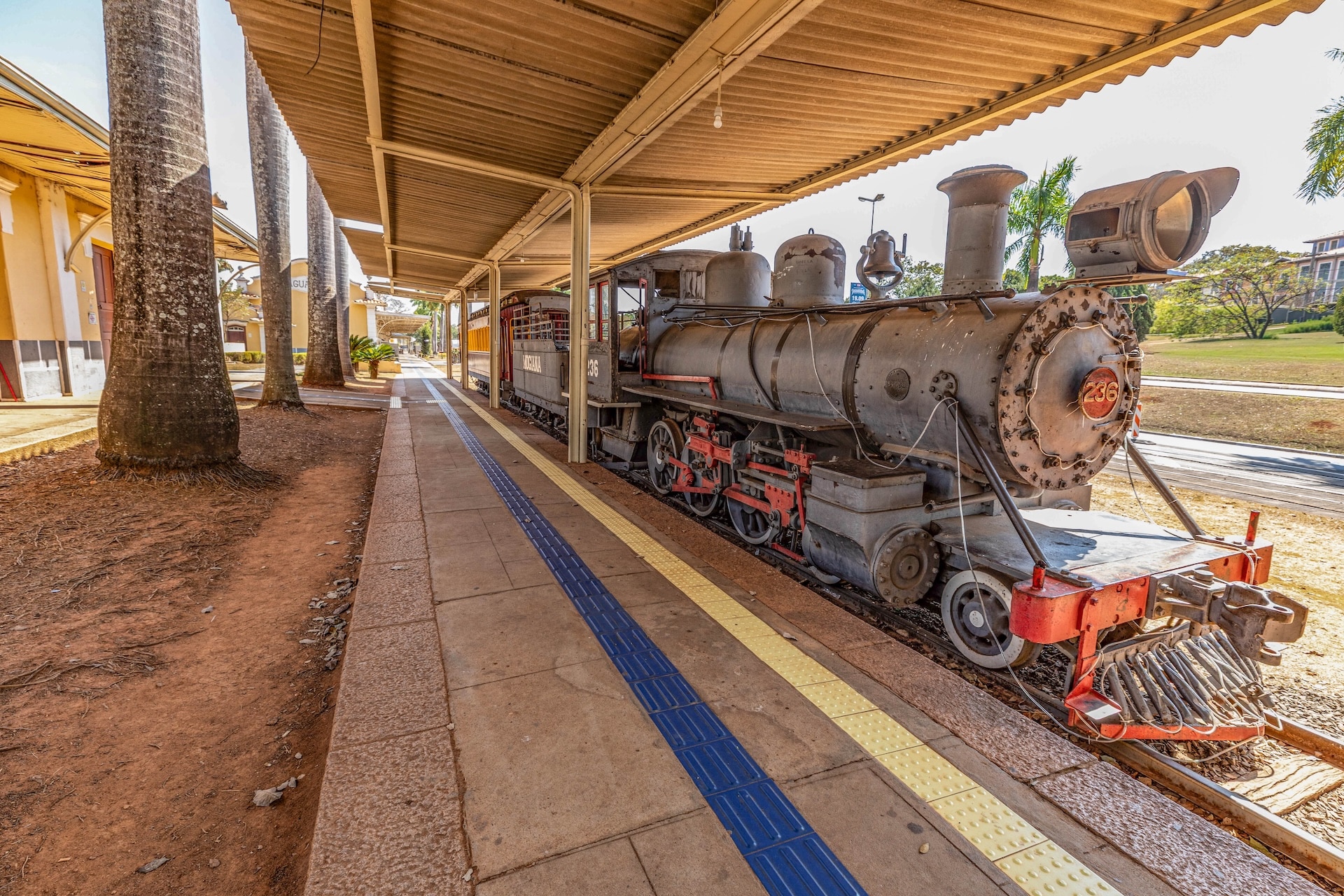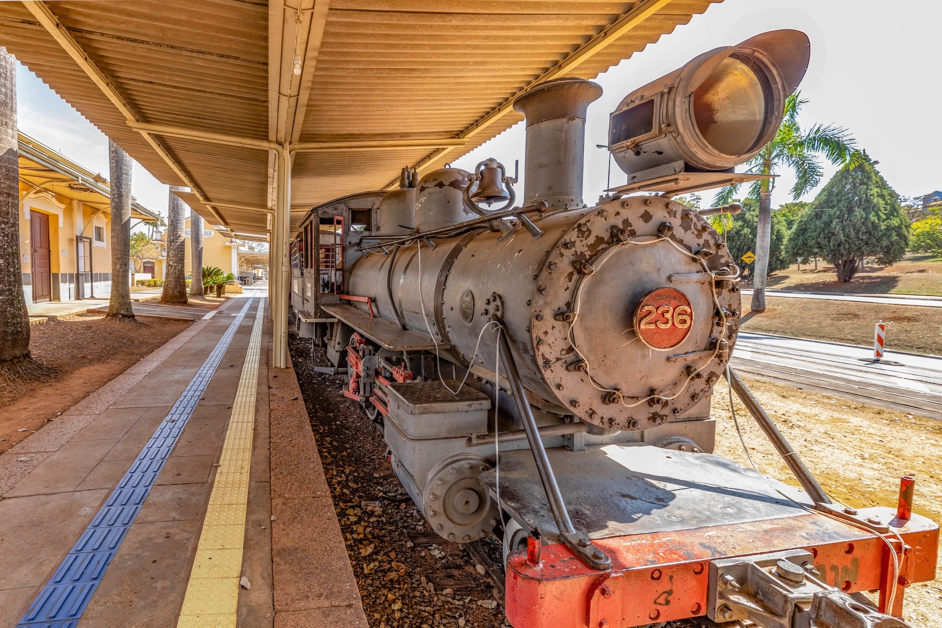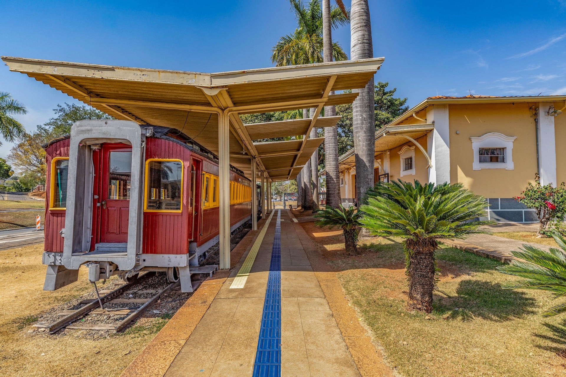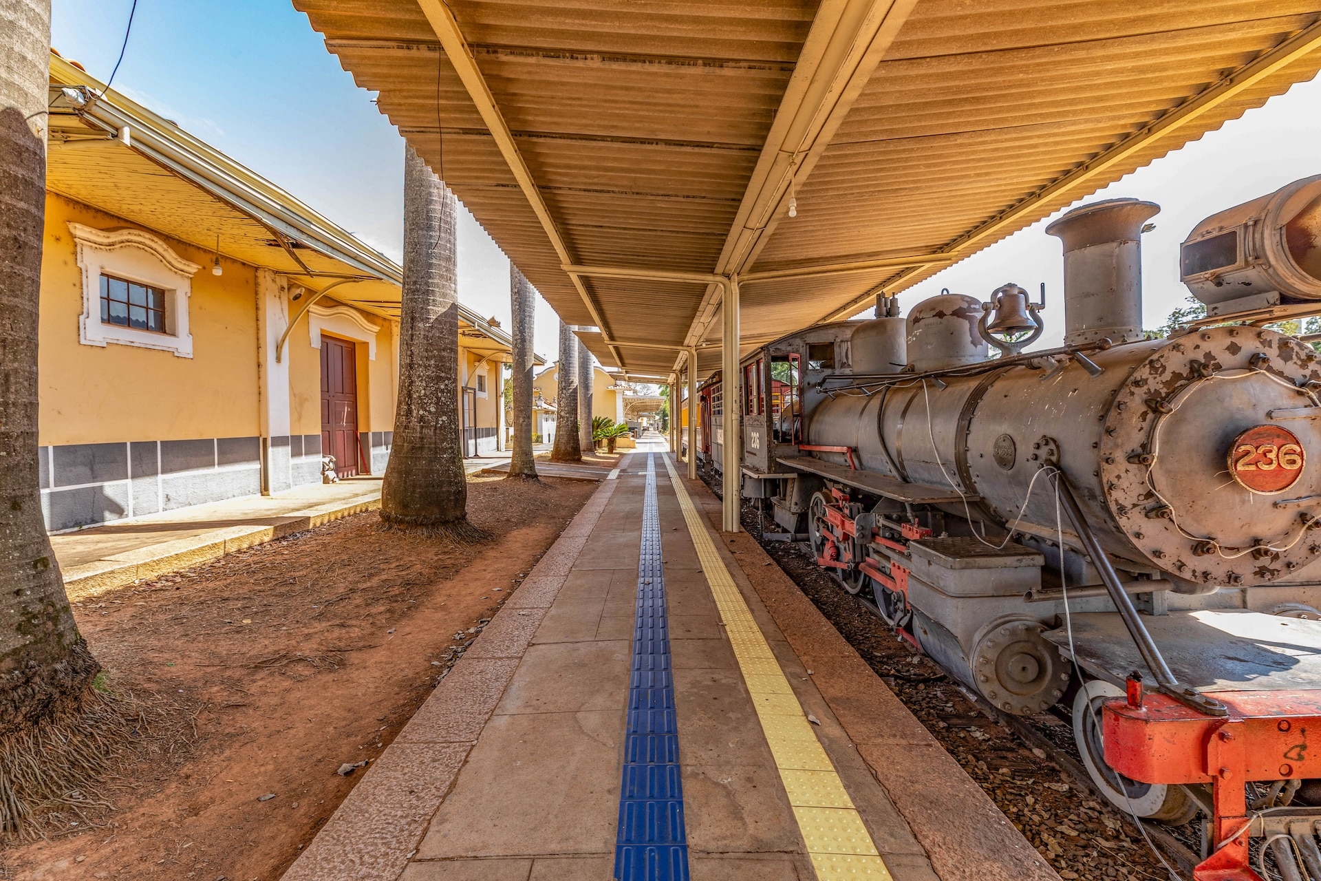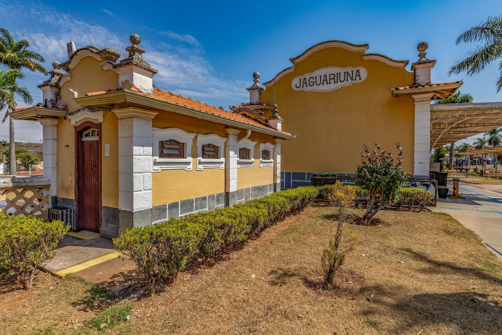 Construída em 1945 no estilo neocolonial, a fachada é composta por paredes em tons de amarelo e branco, com telhado de duas águas coberto por telhas cerâmicas. O edifício apresenta elementos como arcos, janelas com molduras e detalhes em madeira, enquanto, na plataforma, onde bancos de madeira estão distribuídos ao longo do espaço, circula uma maria-fumaça ainda em operação sobre o trilho preservado.