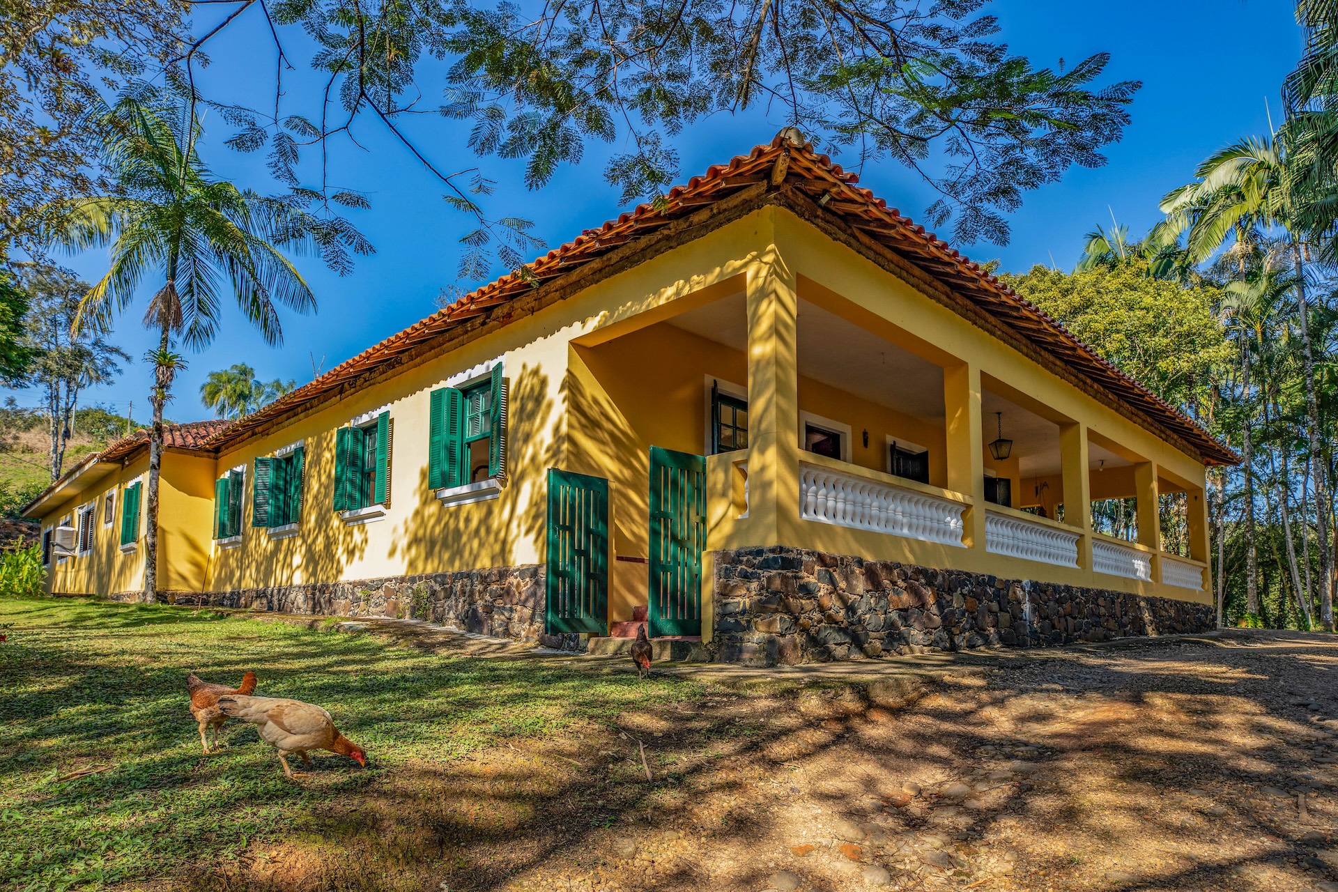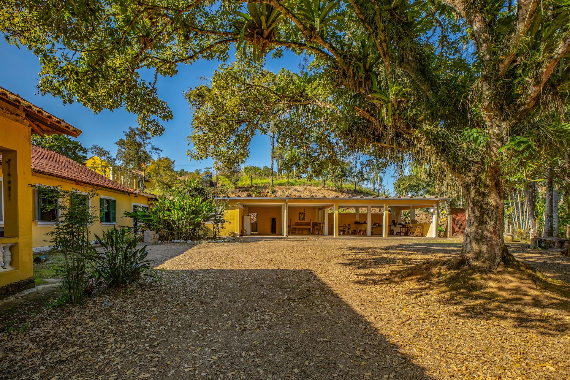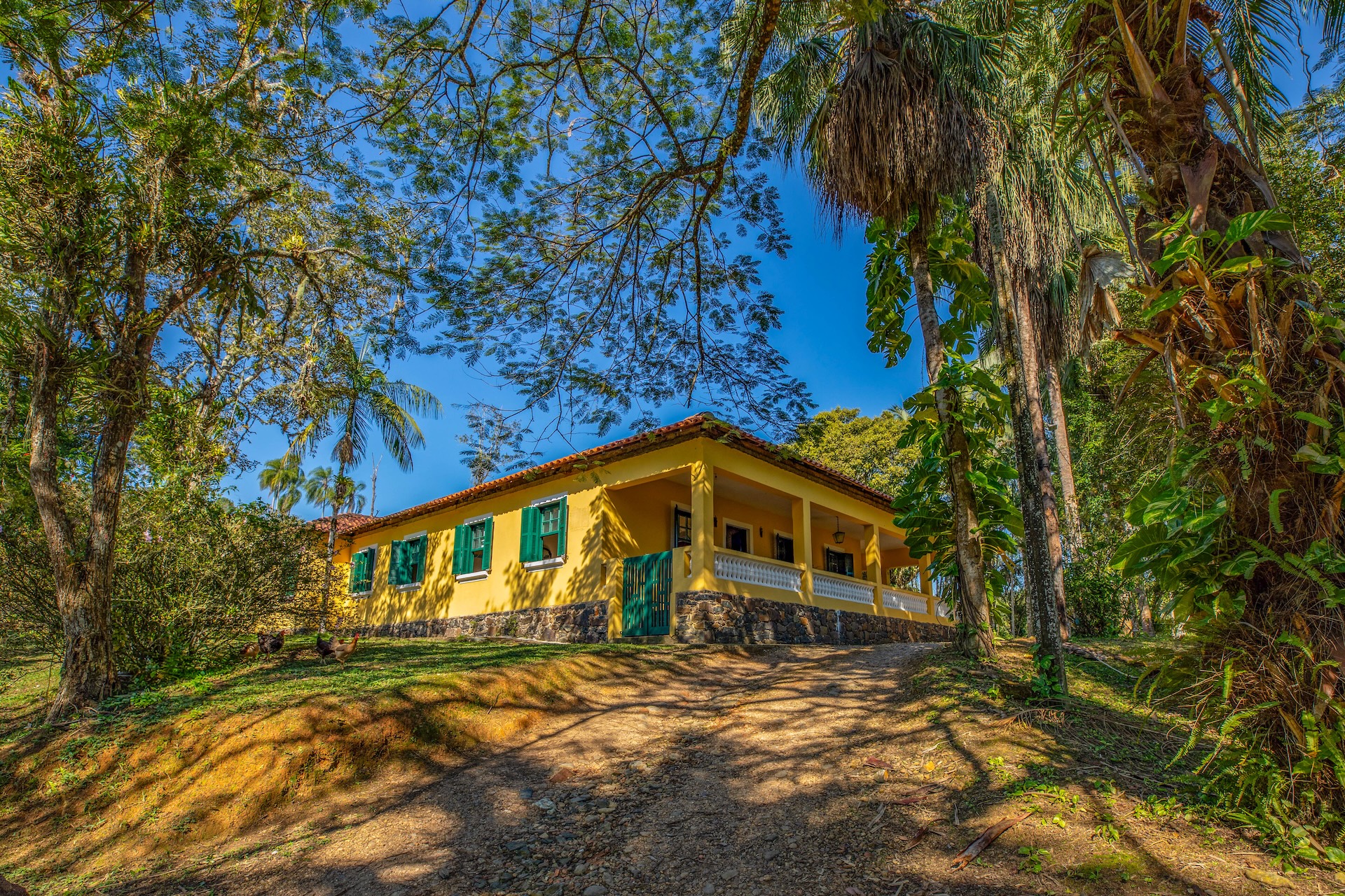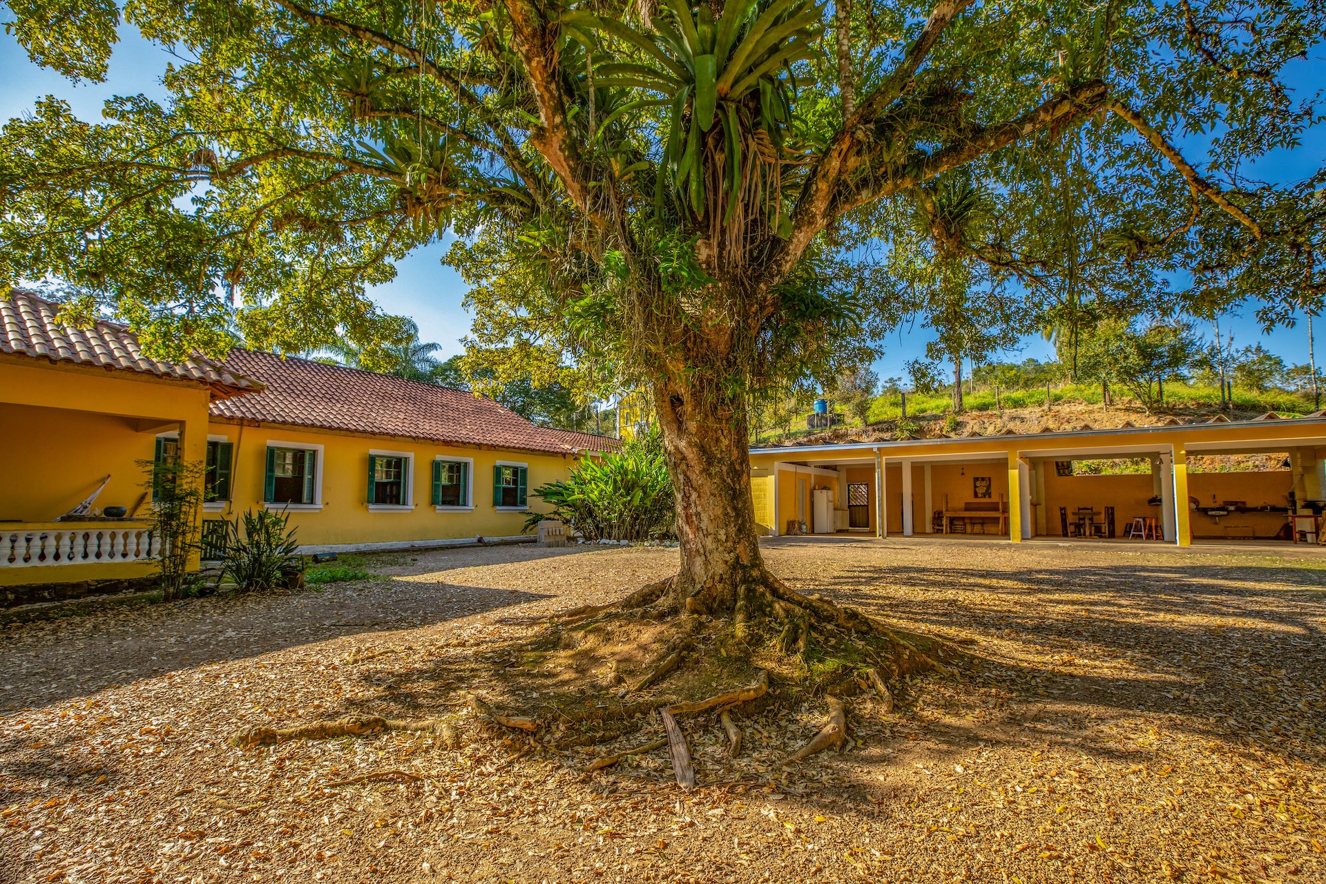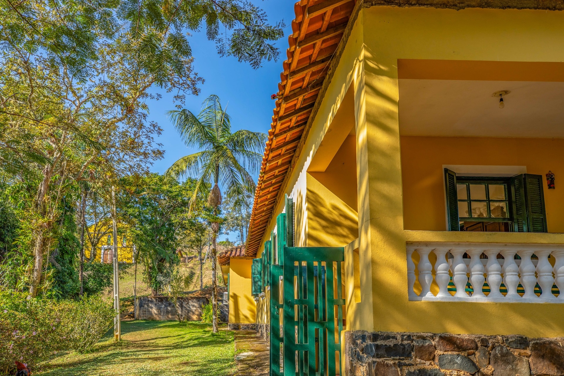 O espaço, remanescente do período colonial, reúne um imponente casarão pintado em tom amarelo com detalhes verdes e varanda que se abre para a paisagem natural. Próximo a ele, sobem as ruínas de uma antiga igreja, com fachada na mesma cor e arcos internos, destacando-se no alto de uma colina cercada por árvores. No terreno da fazenda, o lago acrescenta harmonia ao cenário.
