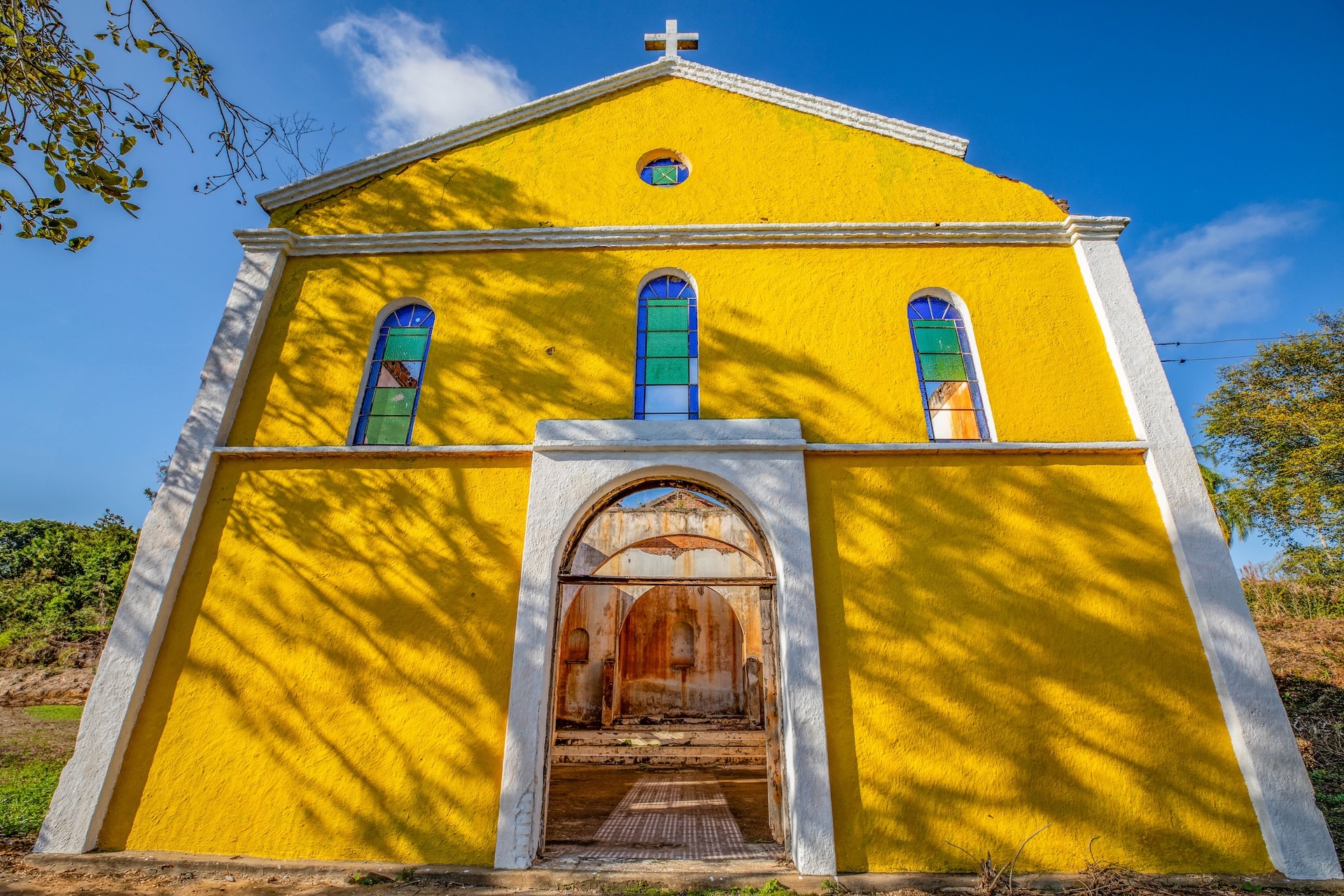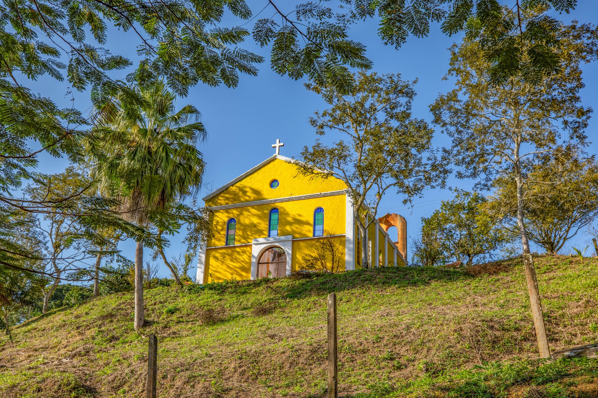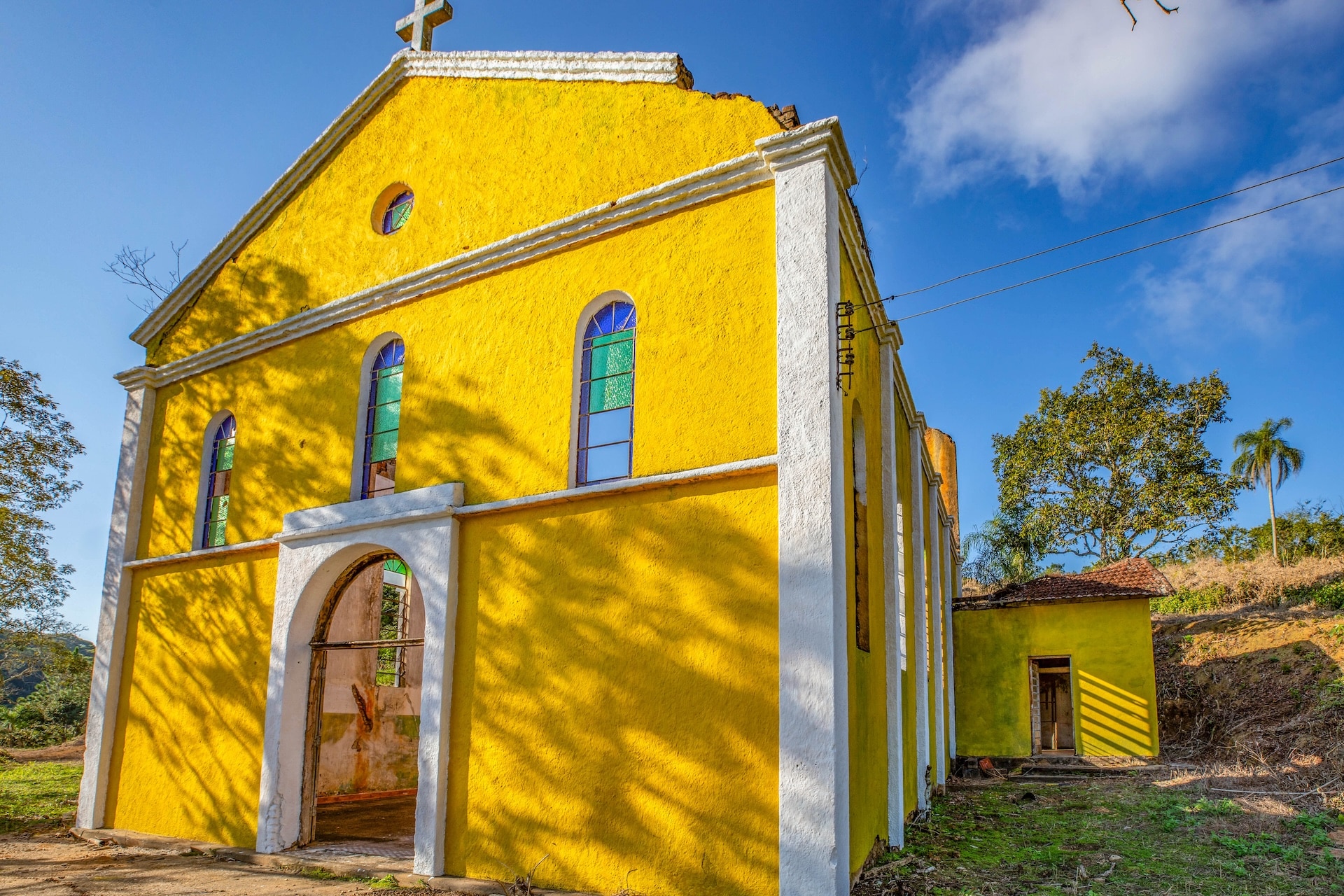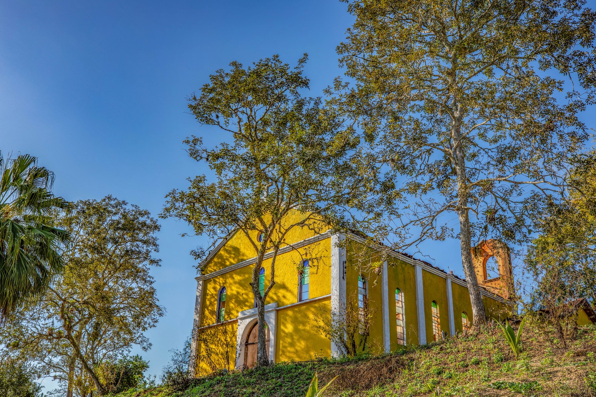 O espaço, remanescente do período colonial, reúne um imponente casarão pintado em tom amarelo com detalhes verdes e varanda que se abre para a paisagem natural. Próximo a ele, sobem as ruínas de uma antiga igreja, com fachada na mesma cor e arcos internos, destacando-se no alto de uma colina cercada por árvores. No terreno da fazenda, o lago acrescenta harmonia ao cenário.