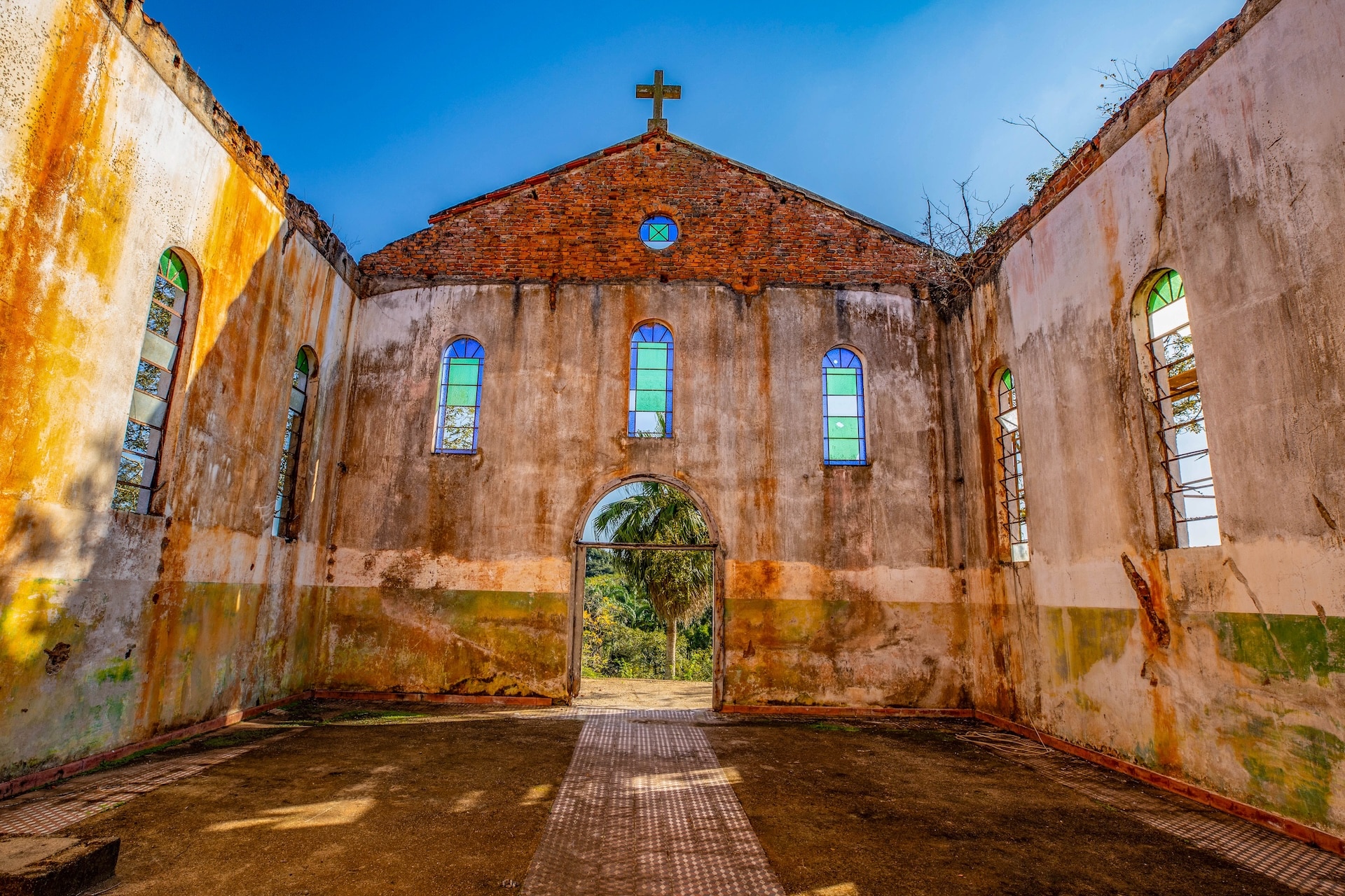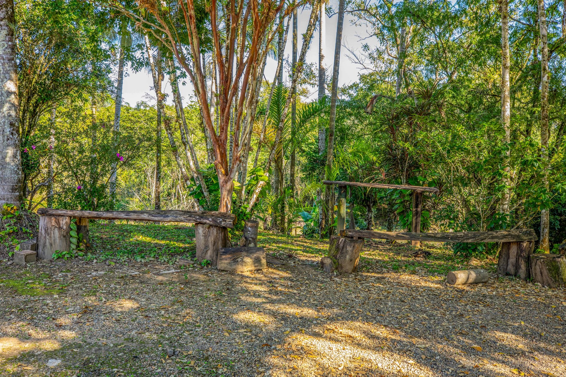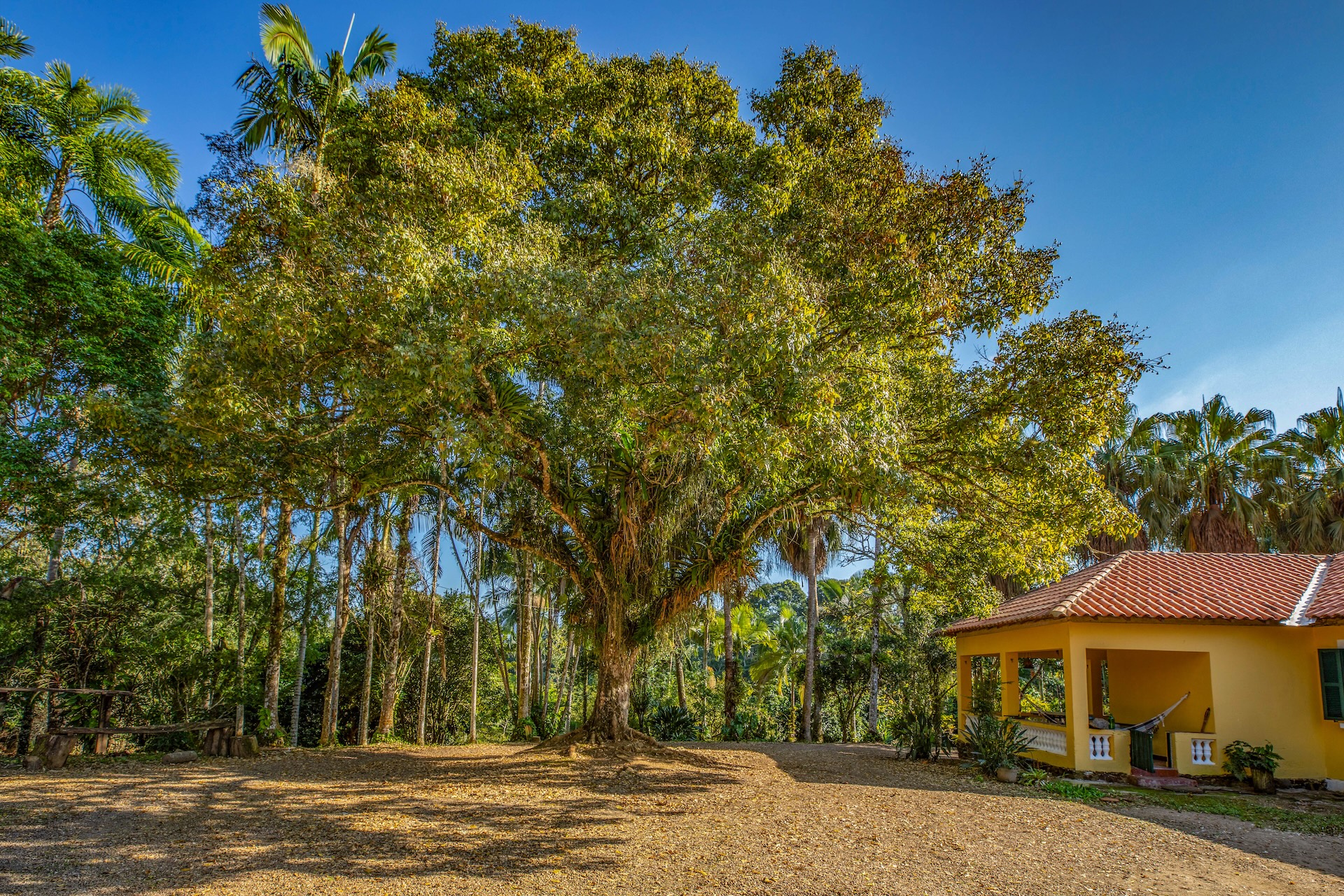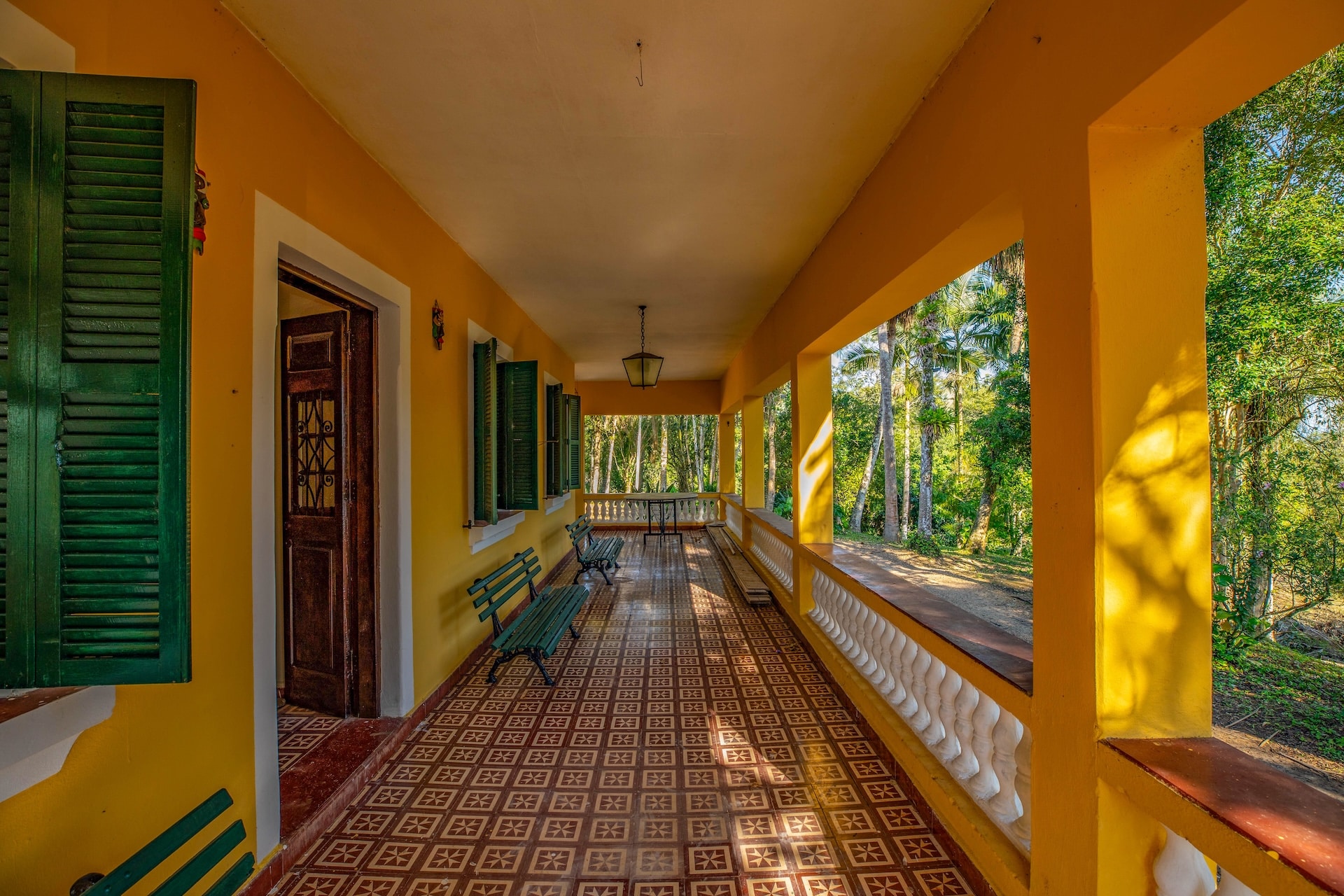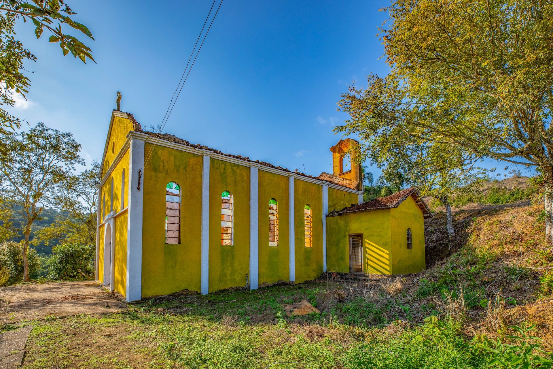 O espaço, remanescente do período colonial, reúne um imponente casarão pintado em tom amarelo com detalhes verdes e varanda que se abre para a paisagem natural. Próximo a ele, sobem as ruínas de uma antiga igreja, com fachada na mesma cor e arcos internos, destacando-se no alto de uma colina cercada por árvores. No terreno da fazenda, o lago acrescenta harmonia ao cenário.