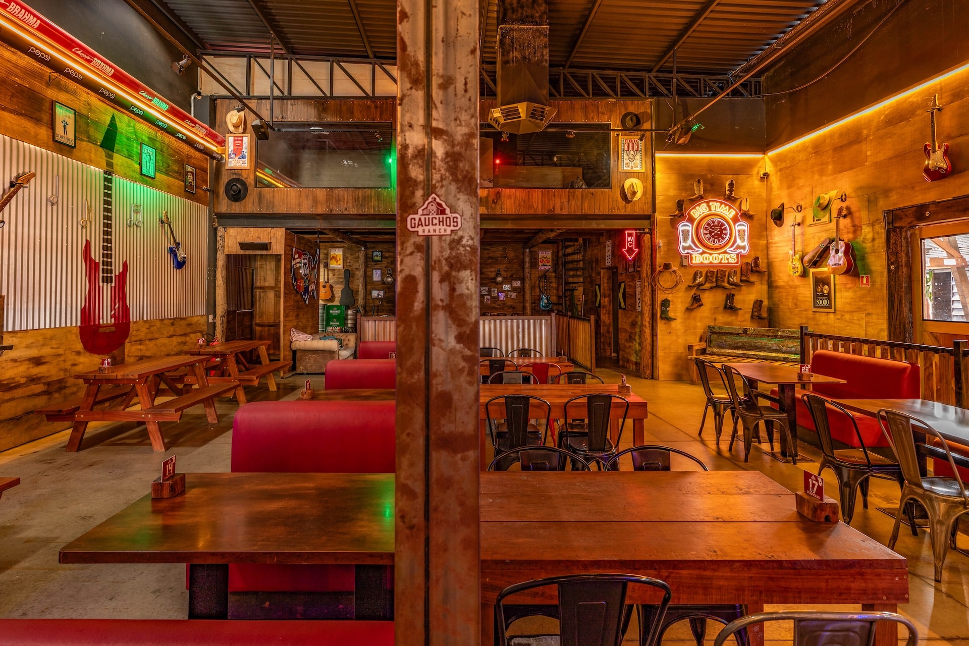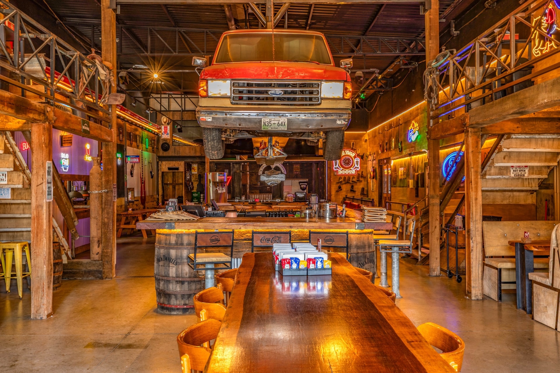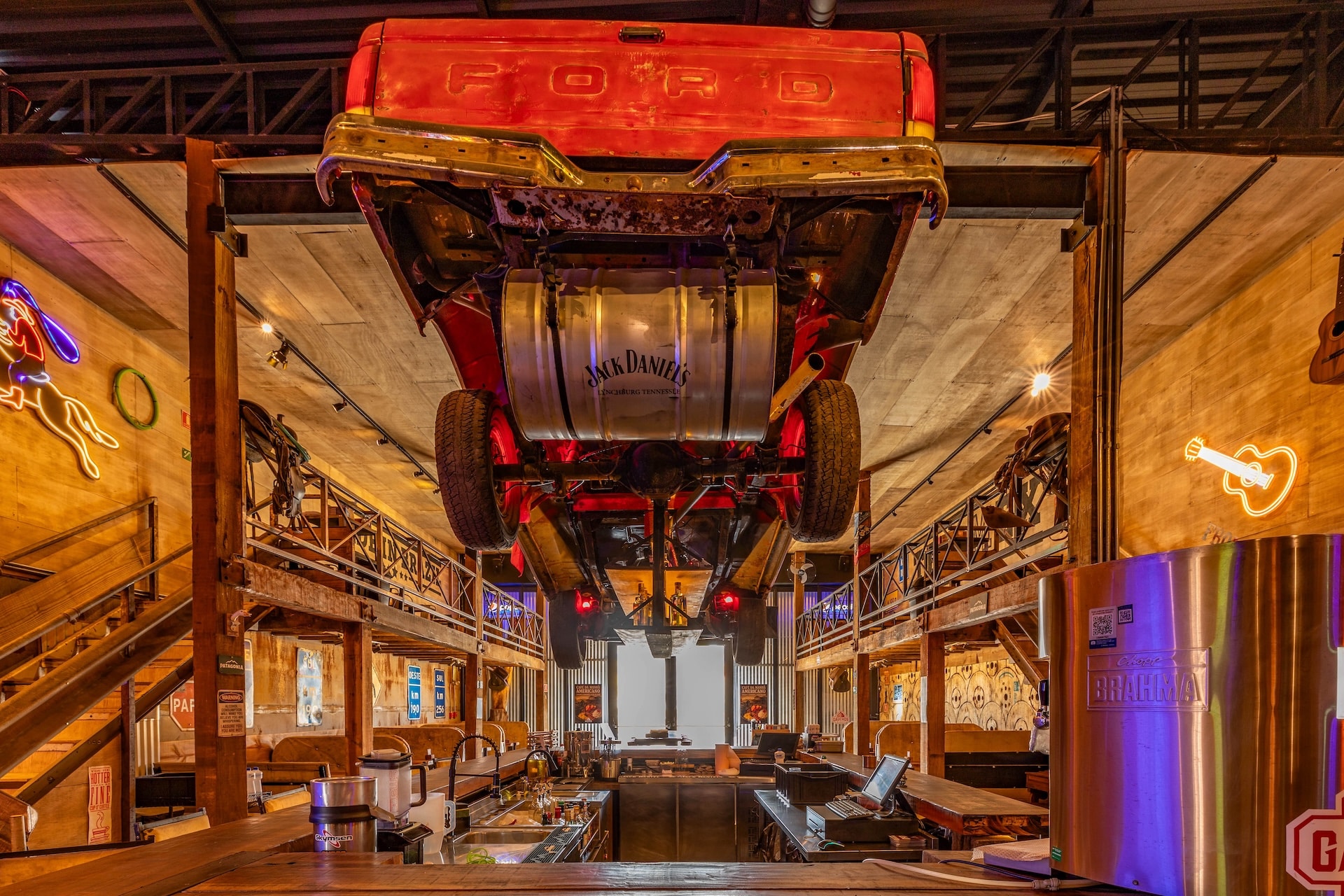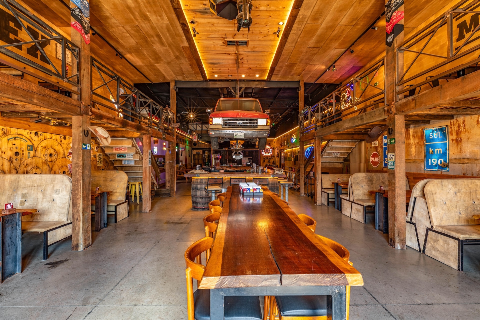 Inspirado nas hamburguerias de Nashville, o restaurante traz uma estética country predominante, com estrutura em madeira e iluminação em tom alaranjado. Elementos rústicos, como uma caminhonete suspensa, reforçam a atmosfera típica da região nos Estados Unidos.