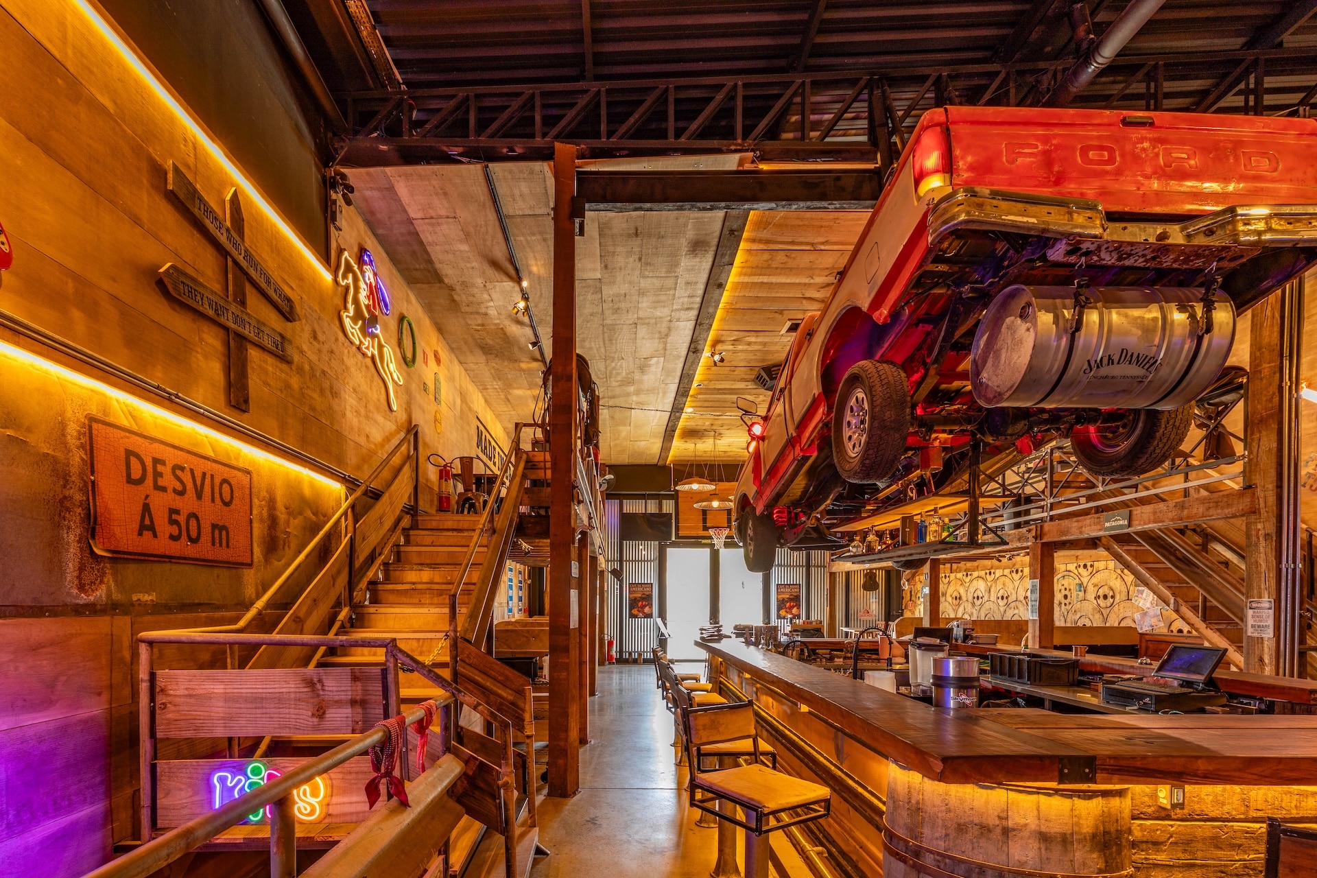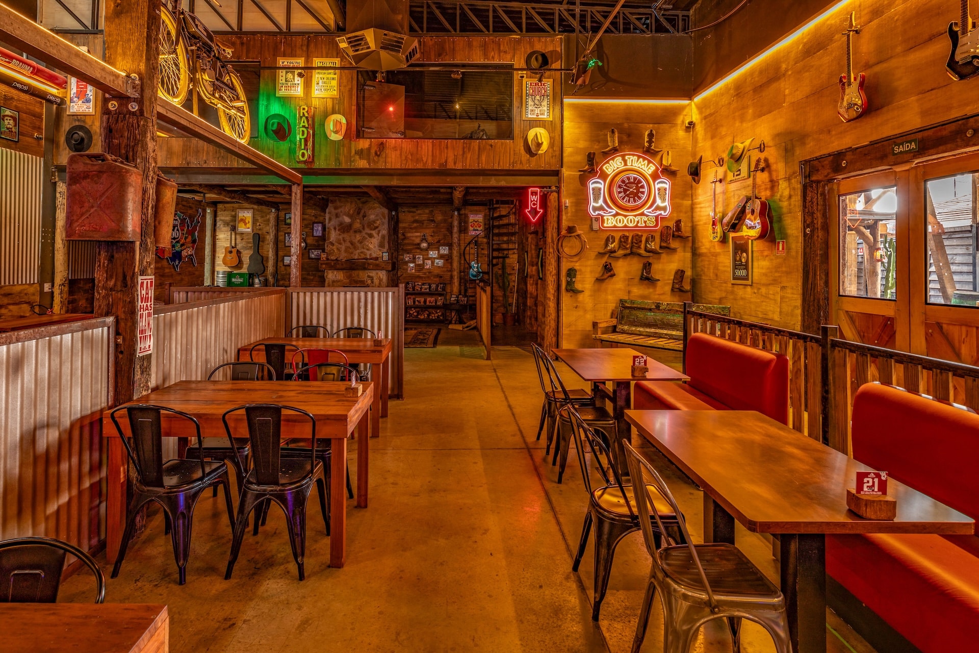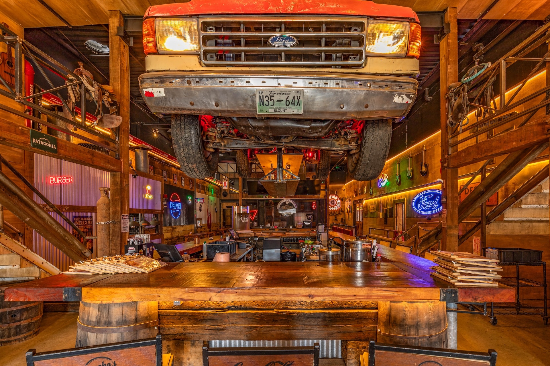 Inspirado nas hamburguerias de Nashville, o restaurante traz uma estética country predominante, com estrutura em madeira e iluminação em tom alaranjado. Elementos rústicos, como uma caminhonete suspensa, reforçam a atmosfera típica da região nos Estados Unidos.