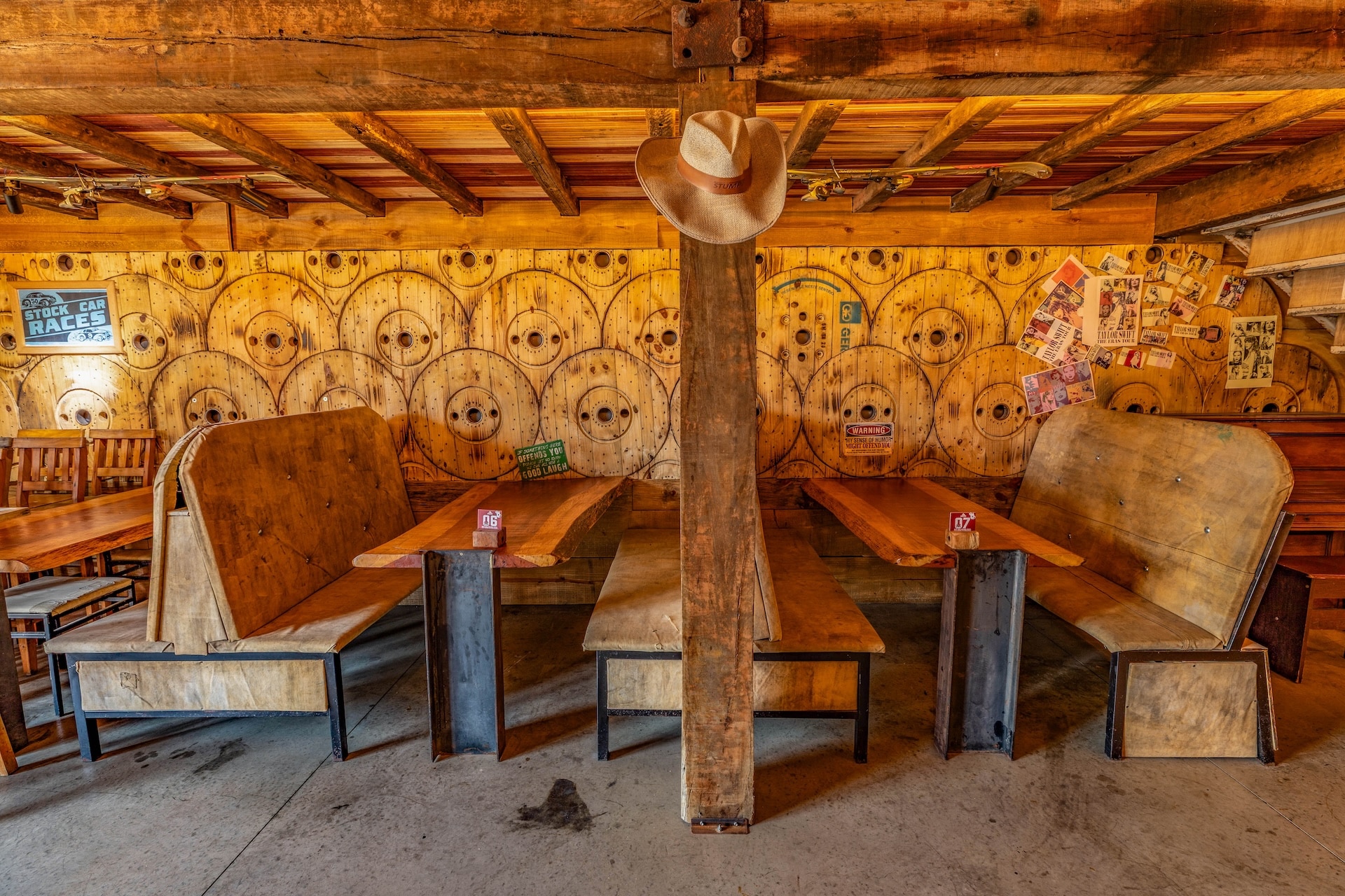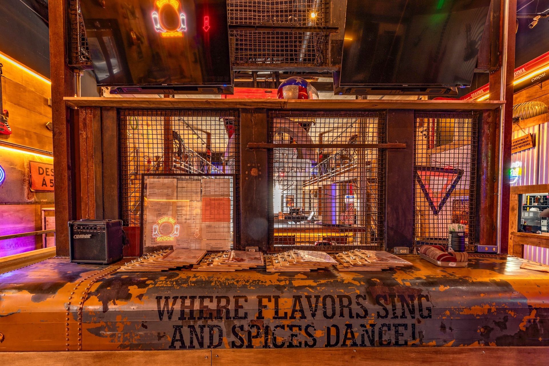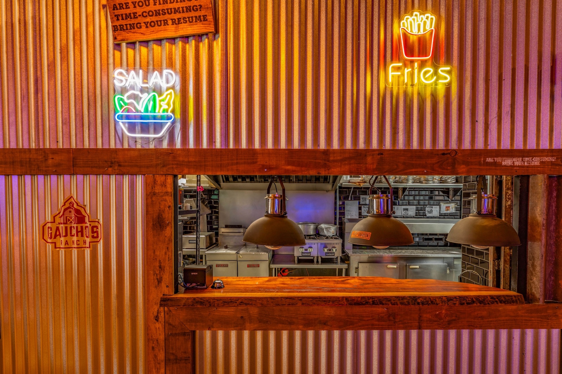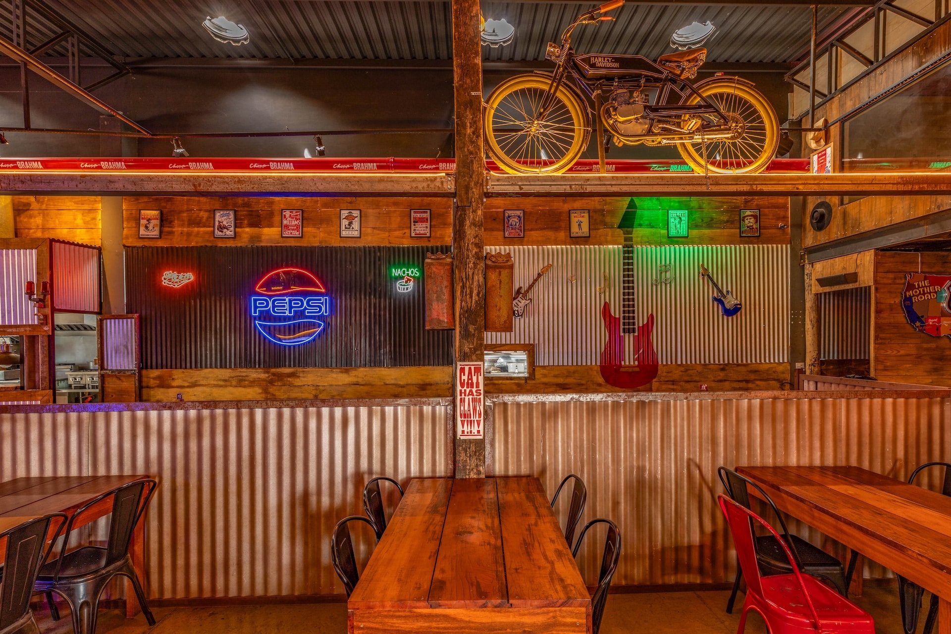 Inspirado nas hamburguerias de Nashville, o restaurante traz uma estética country predominante, com estrutura em madeira e iluminação em tom alaranjado. Elementos rústicos, como uma caminhonete suspensa, reforçam a atmosfera típica da região nos Estados Unidos.