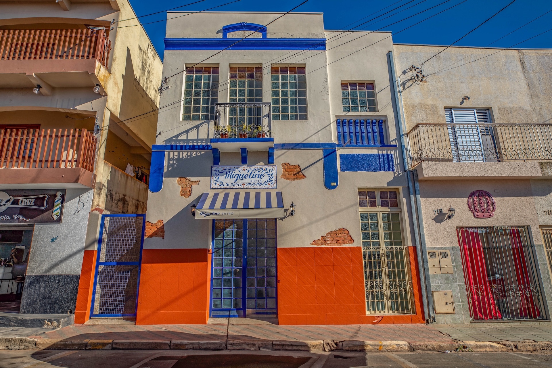 Edificação de fachada eclética, marcada por linhas retas, gradis de ferro e elementos em relevo. As cores branco e azul royal e os detalhes em tijolo aparente compõem a estética retrô.