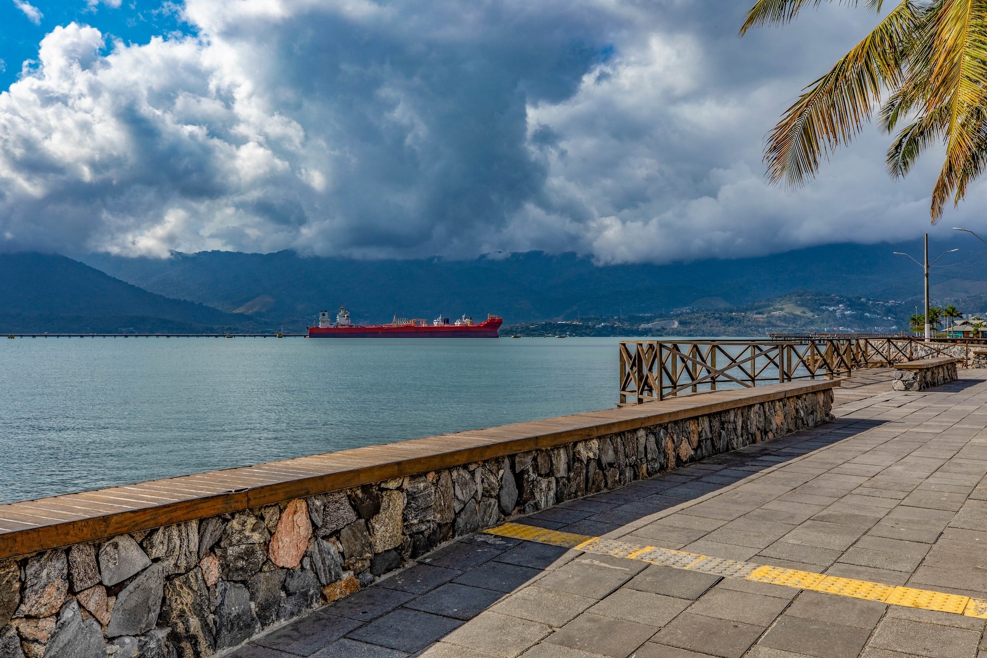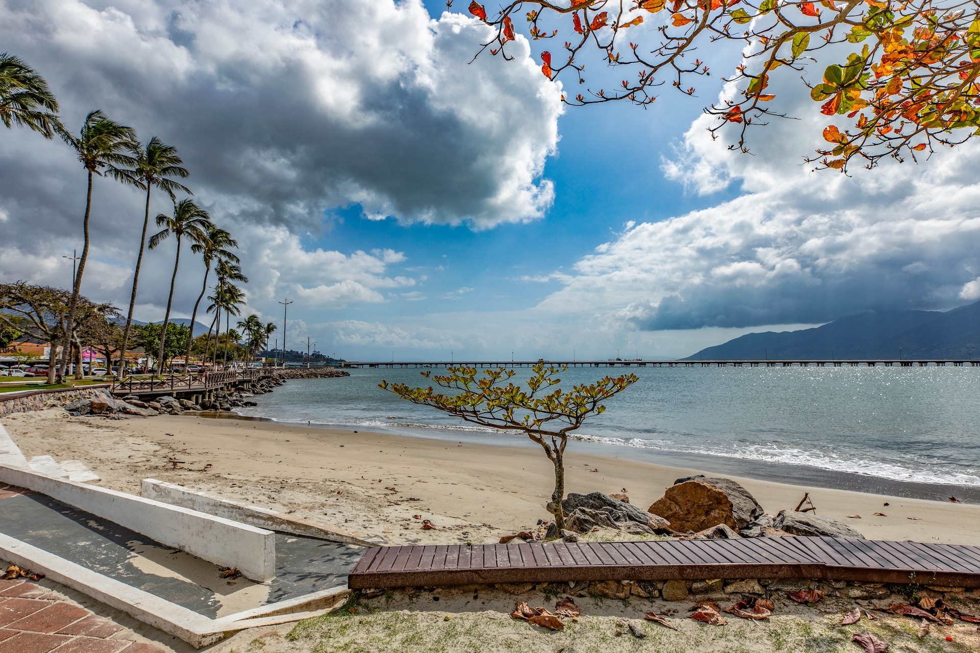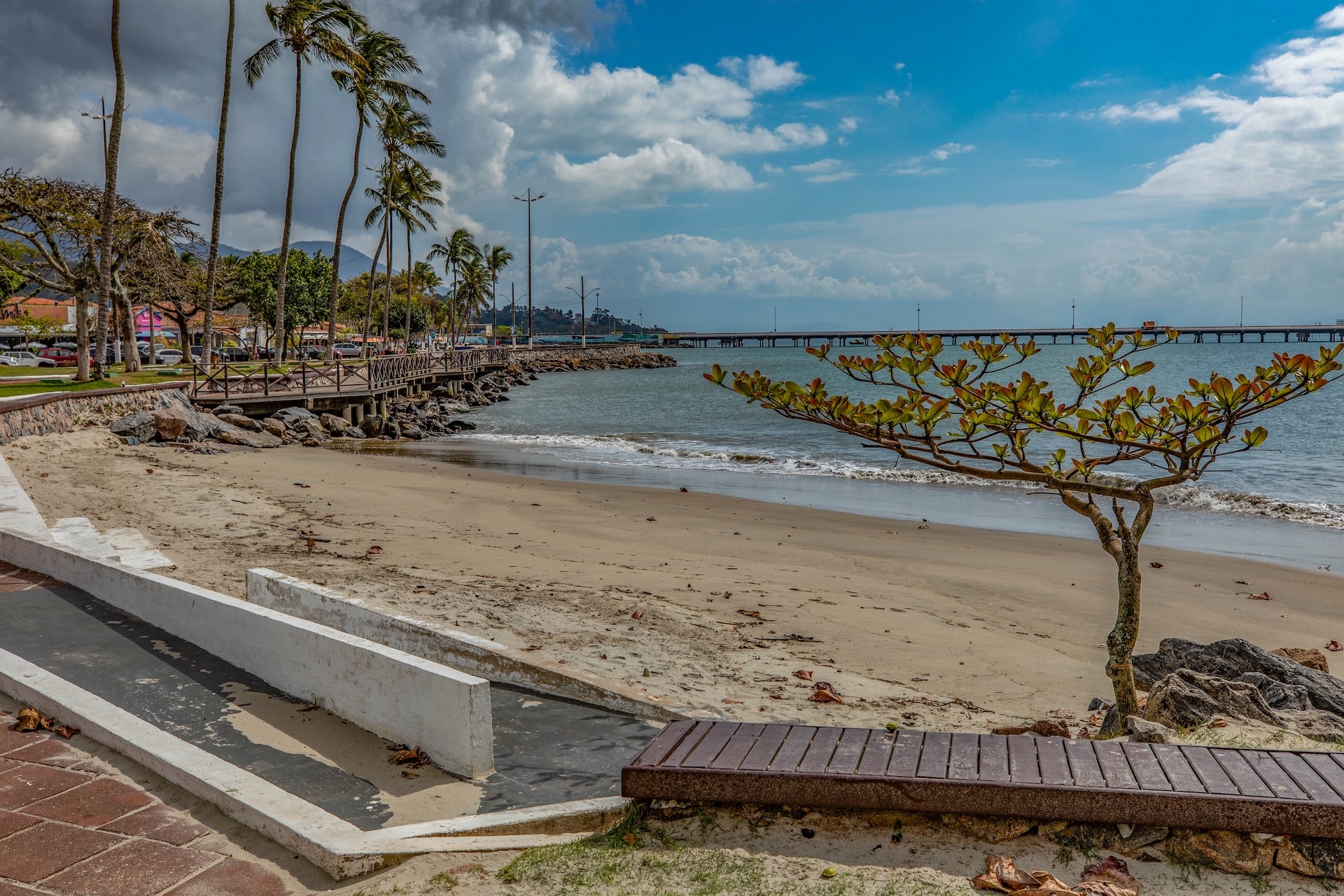 Calçadão arborizado com palmeiras com vista para o mar e píer de madeira apoiado sobre pedras.