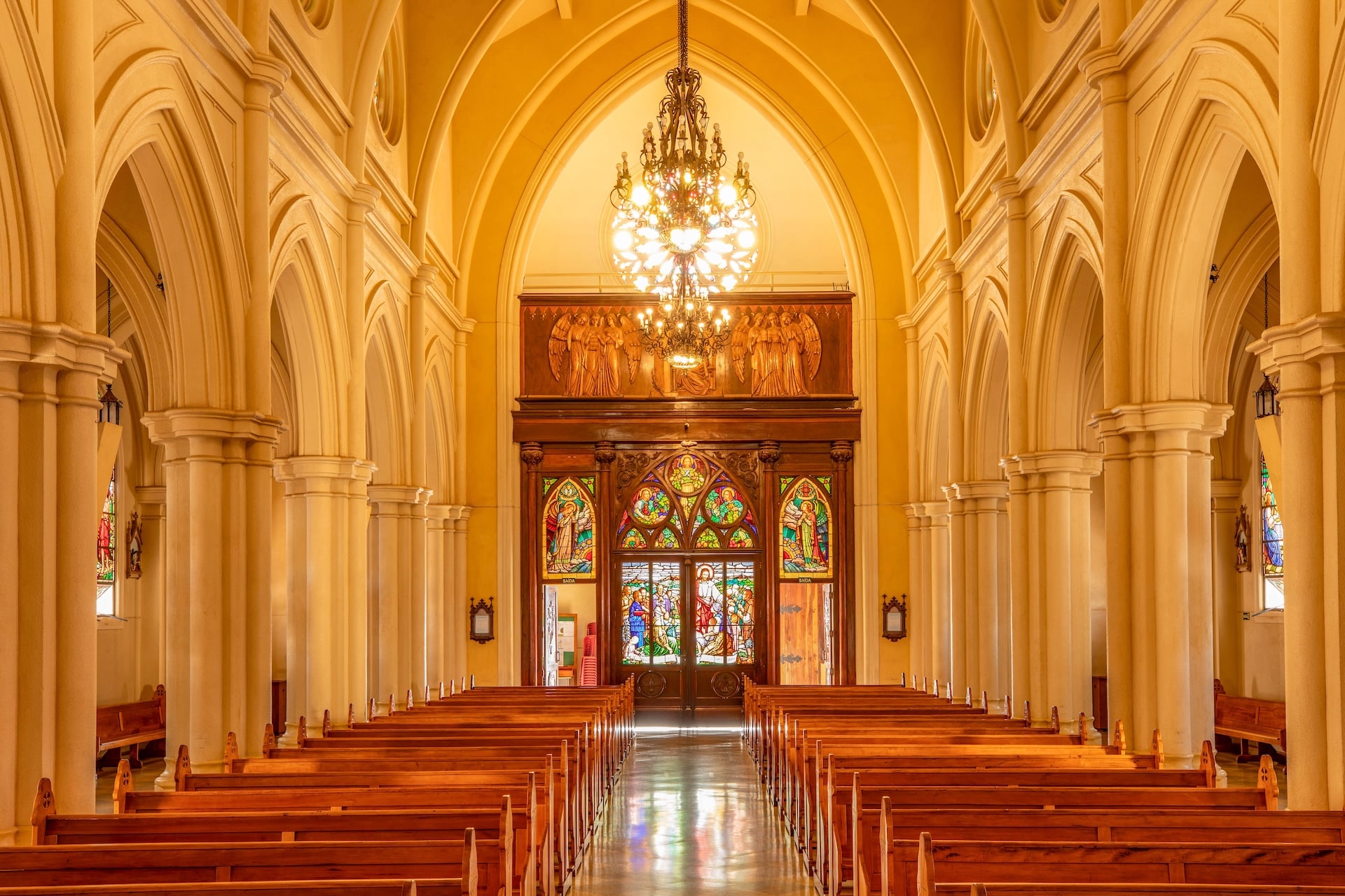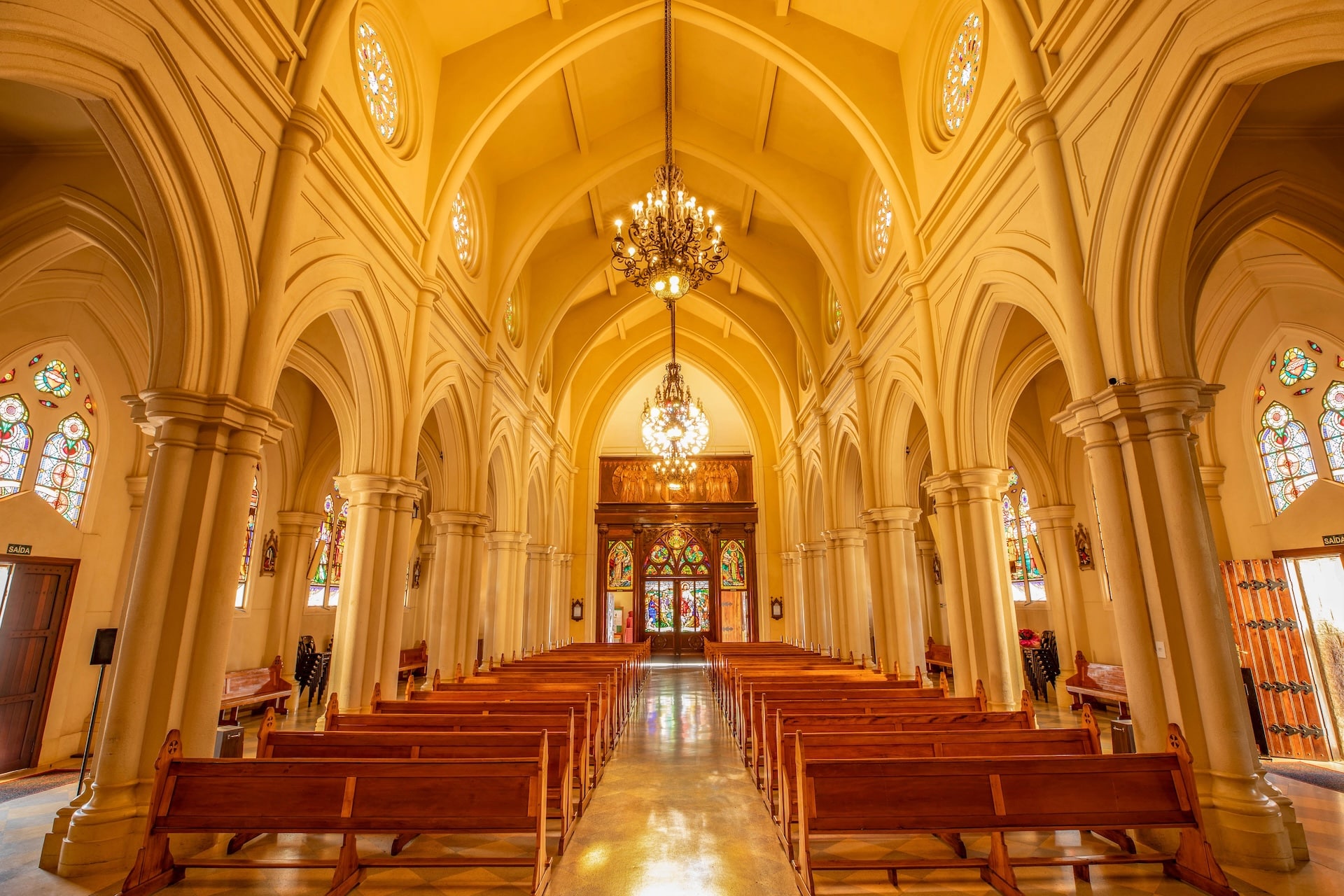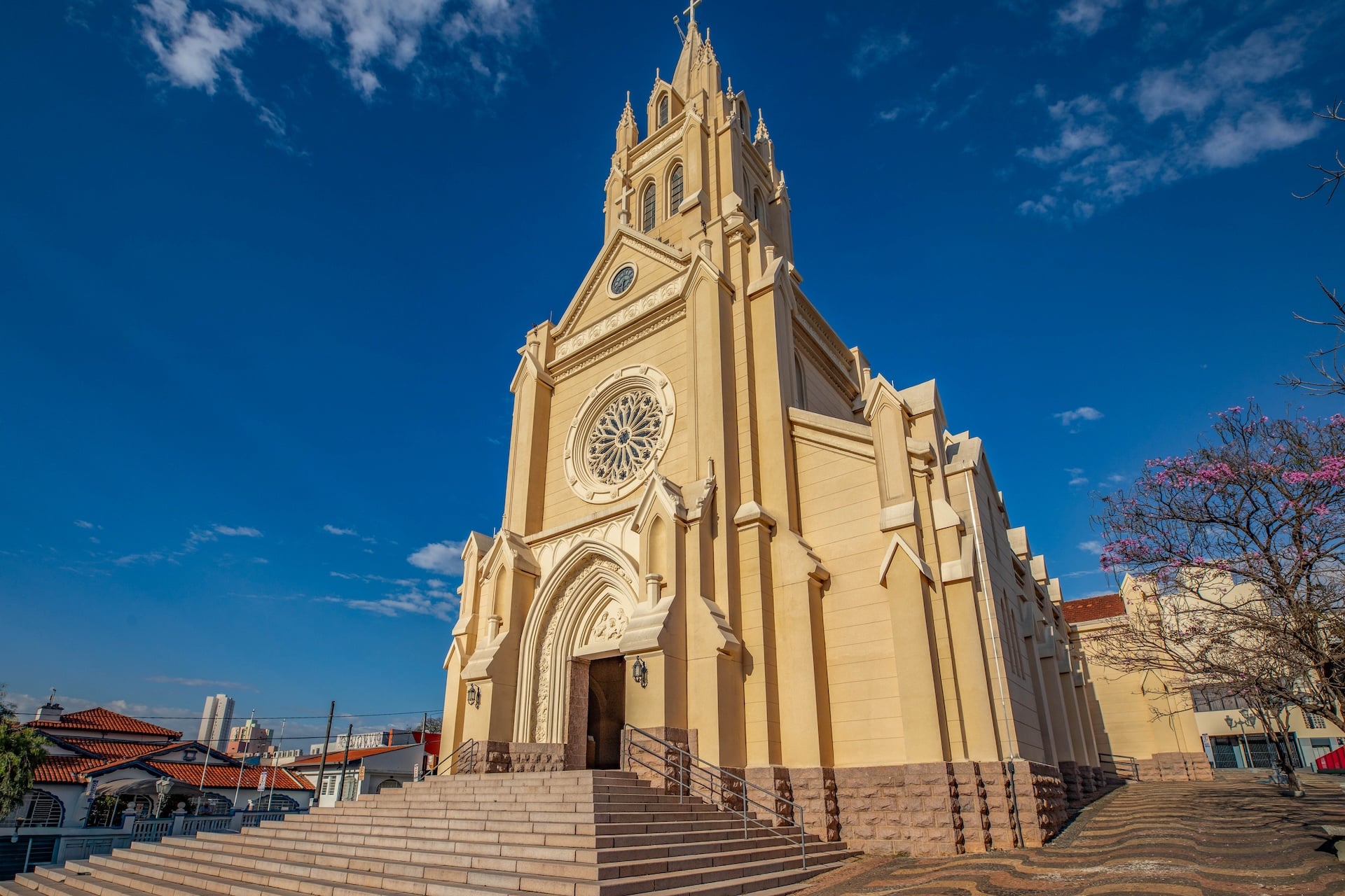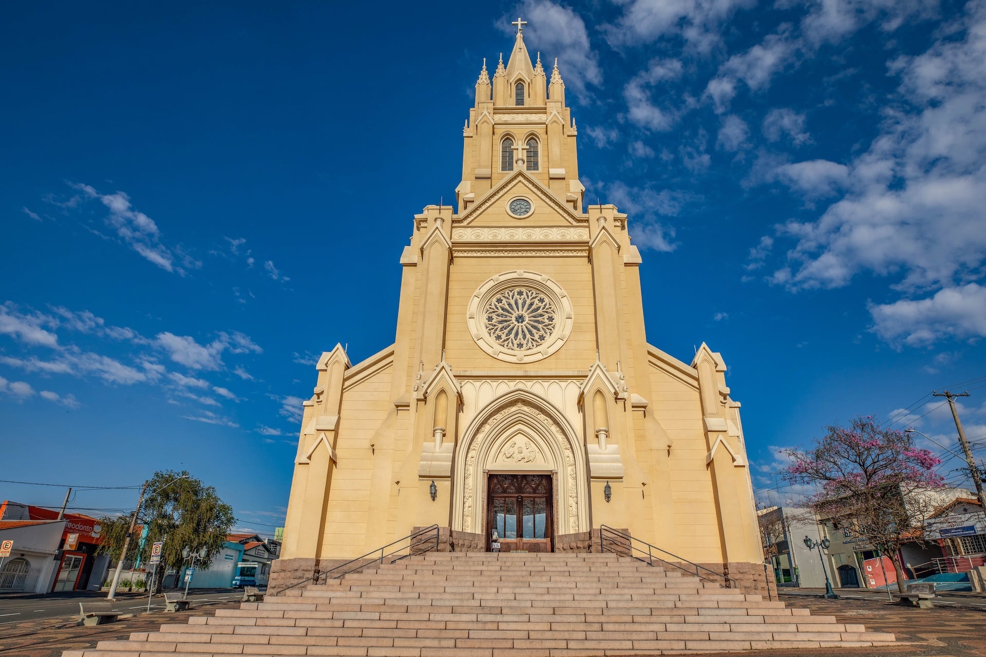 Datada de 1900 e construída no estilo arquitetônico gótico-românico, a construção foi erguida em concreto com entalhes de João Pazinatto. A fachada clara, em tom creme, destaca-se pela escadaria frontal e pela torre central imponente. No interior, o espaço é marcado pelo uso de madeira, vitrais coloridos e arcos ogivais que ressaltam a beleza e a riqueza da construção.