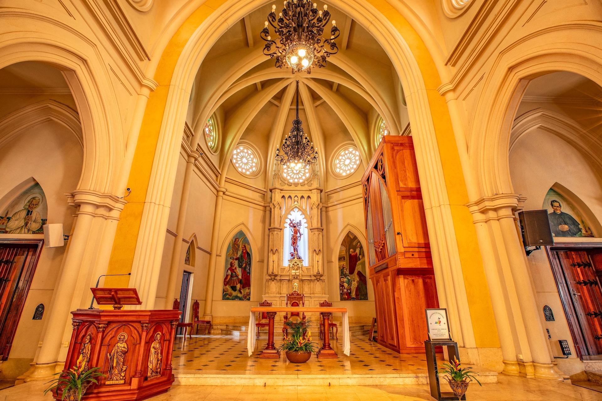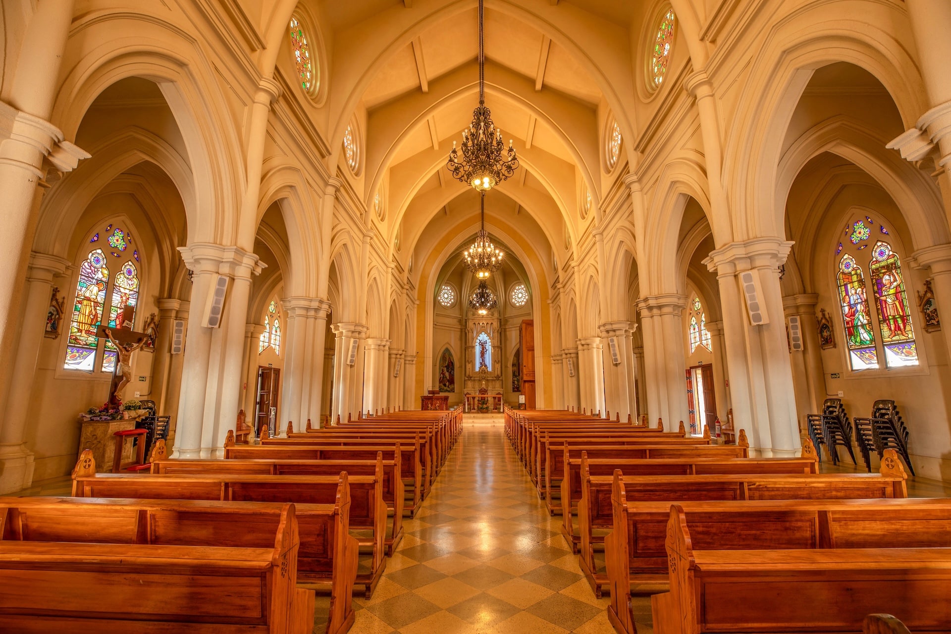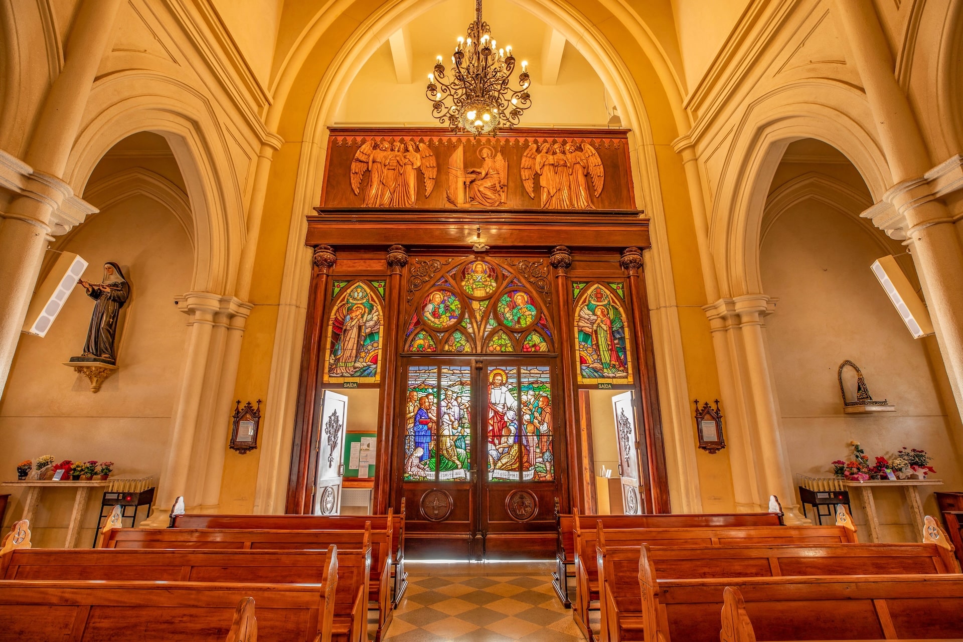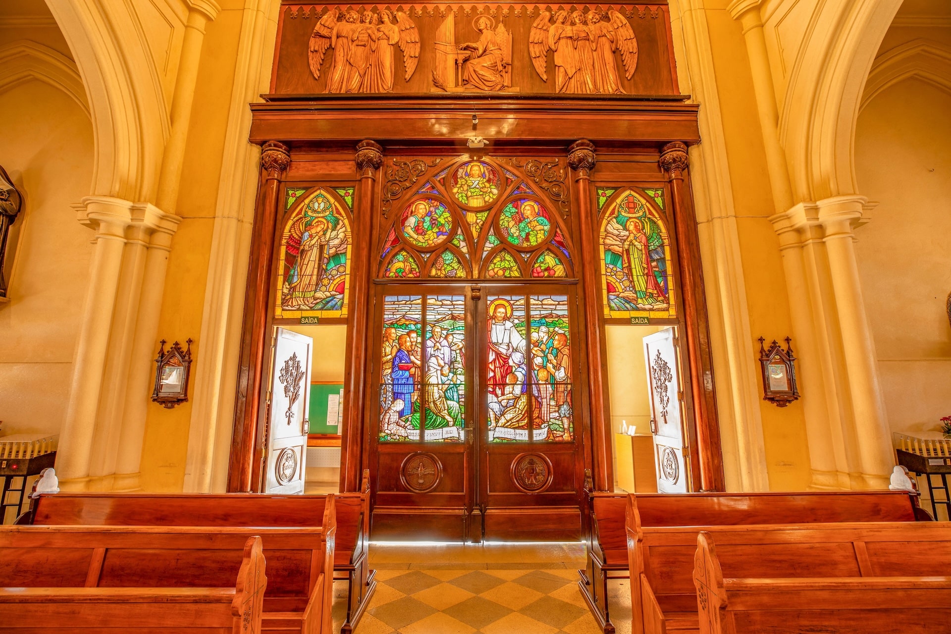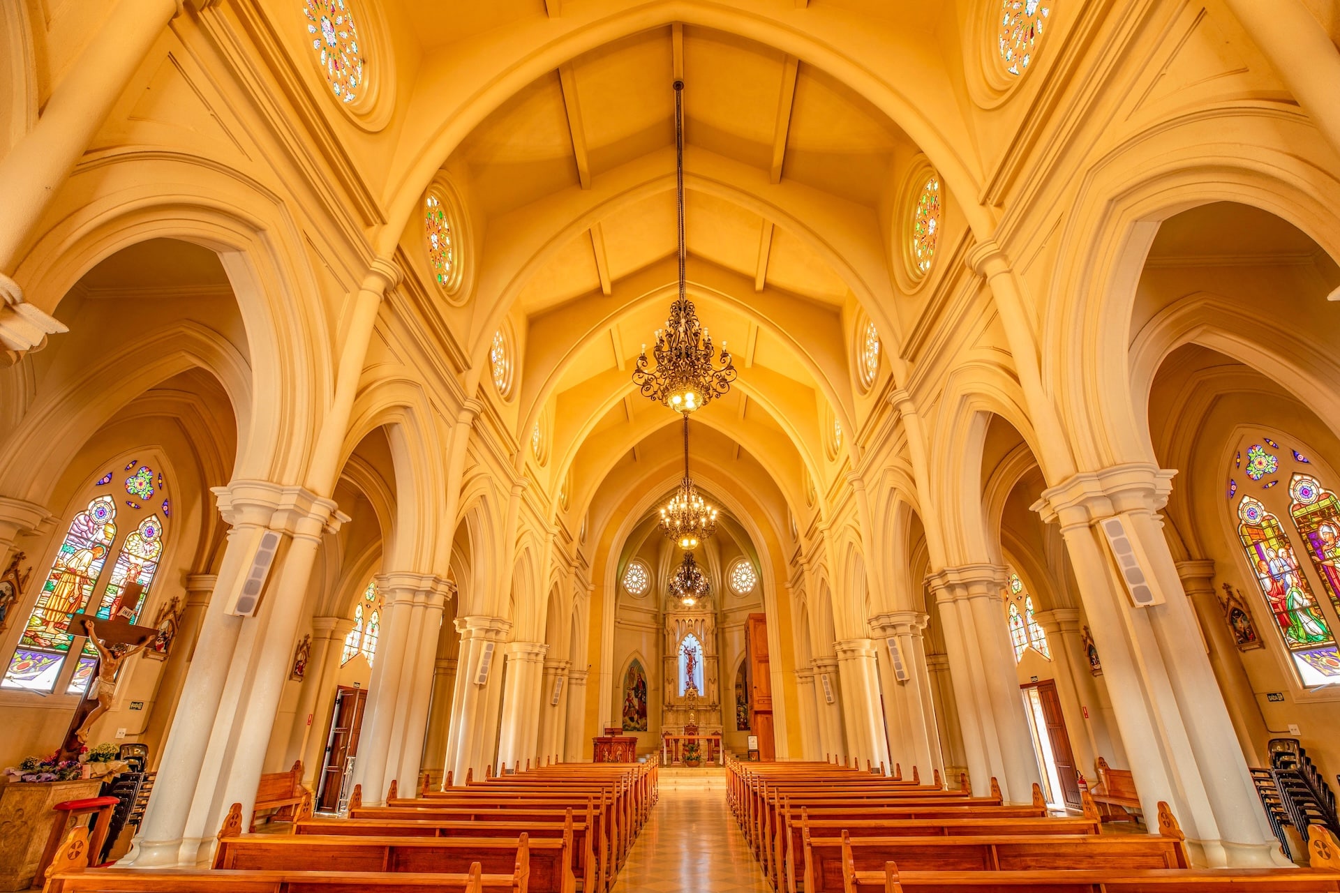 Datada de 1900 e construída no estilo arquitetônico gótico-românico, a construção foi erguida em concreto com entalhes de João Pazinatto. A fachada clara, em tom creme, destaca-se pela escadaria frontal e pela torre central imponente. No interior, o espaço é marcado pelo uso de madeira, vitrais coloridos e arcos ogivais que ressaltam a beleza e a riqueza da construção.