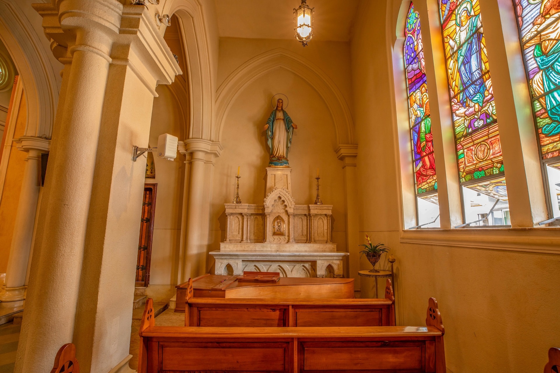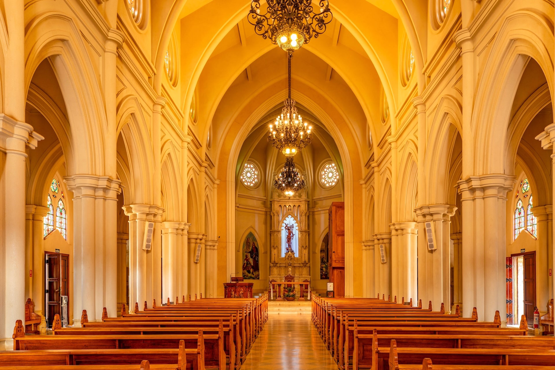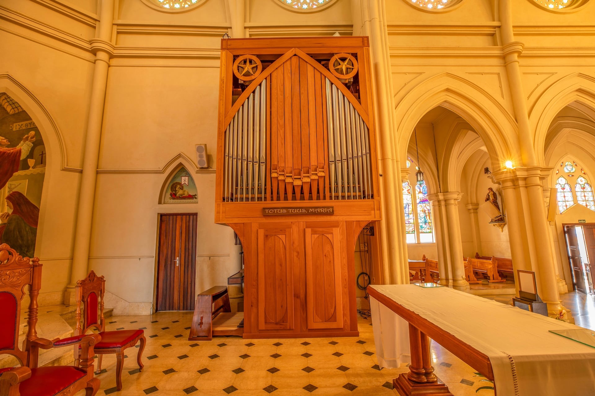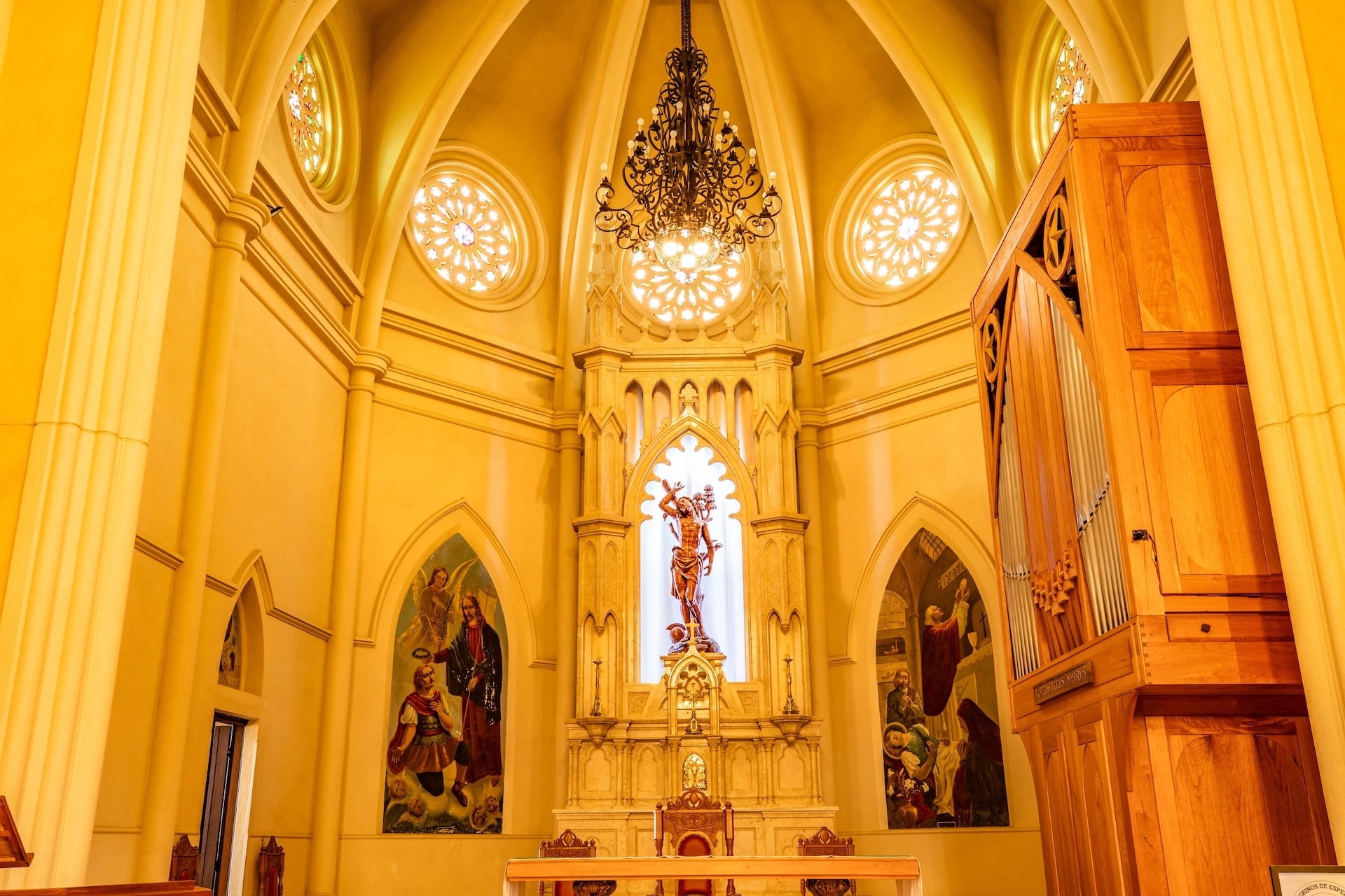 Datada de 1900 e construída no estilo arquitetônico gótico-românico, a construção foi erguida em concreto com entalhes de João Pazinatto. A fachada clara, em tom creme, destaca-se pela escadaria frontal e pela torre central imponente. No interior, o espaço é marcado pelo uso de madeira, vitrais coloridos e arcos ogivais que ressaltam a beleza e a riqueza da construção.