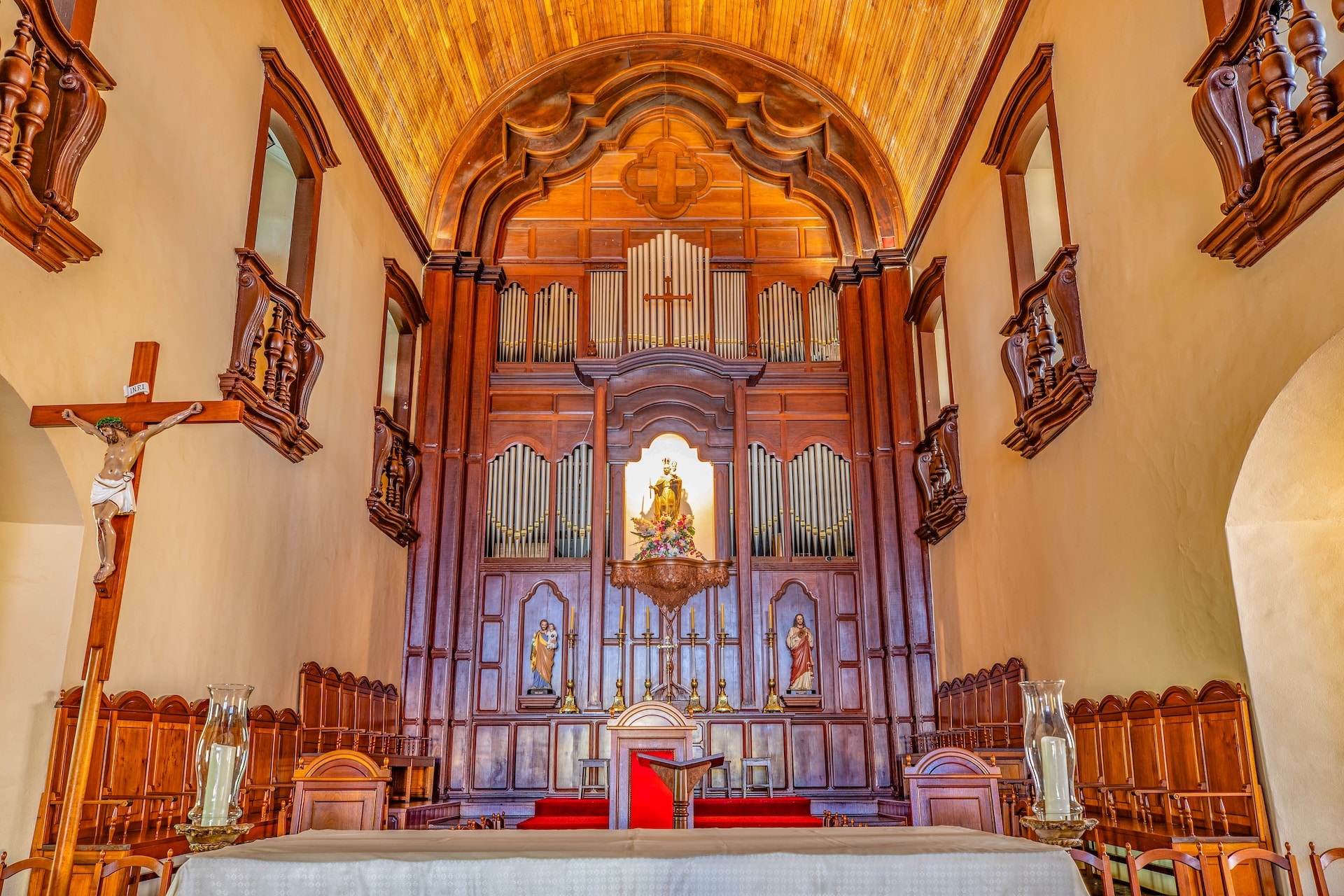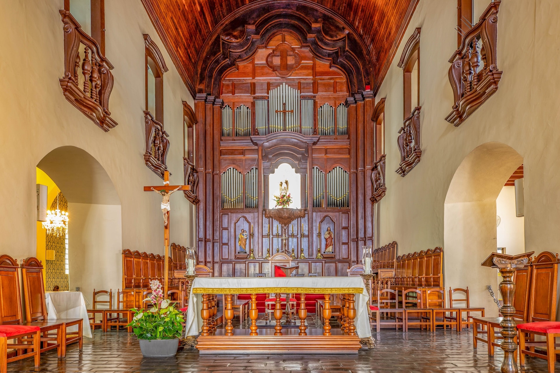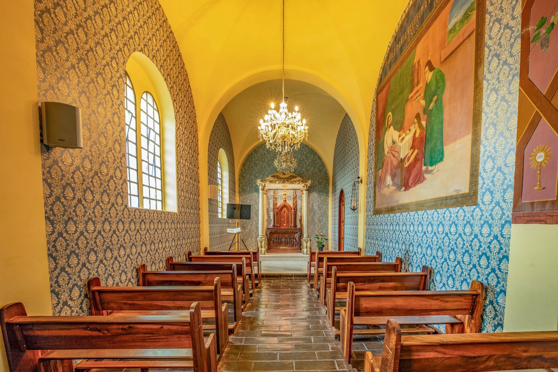 Construída em taipa de pilão no século 19, a edificação possui fachada em tom amarelo e nave com 9,84 metros de largura e 23,3 metros de comprimento, enquanto o altar é entalhado em madeira. As paredes longitudinais duplas são separadas por galerias que conectam os ambientes, mantendo o estilo e a técnica tradicionais da época.