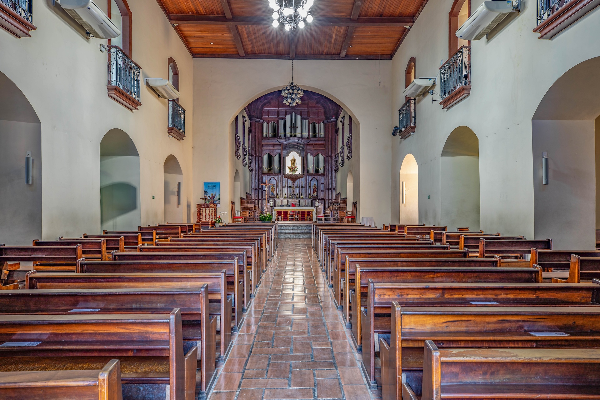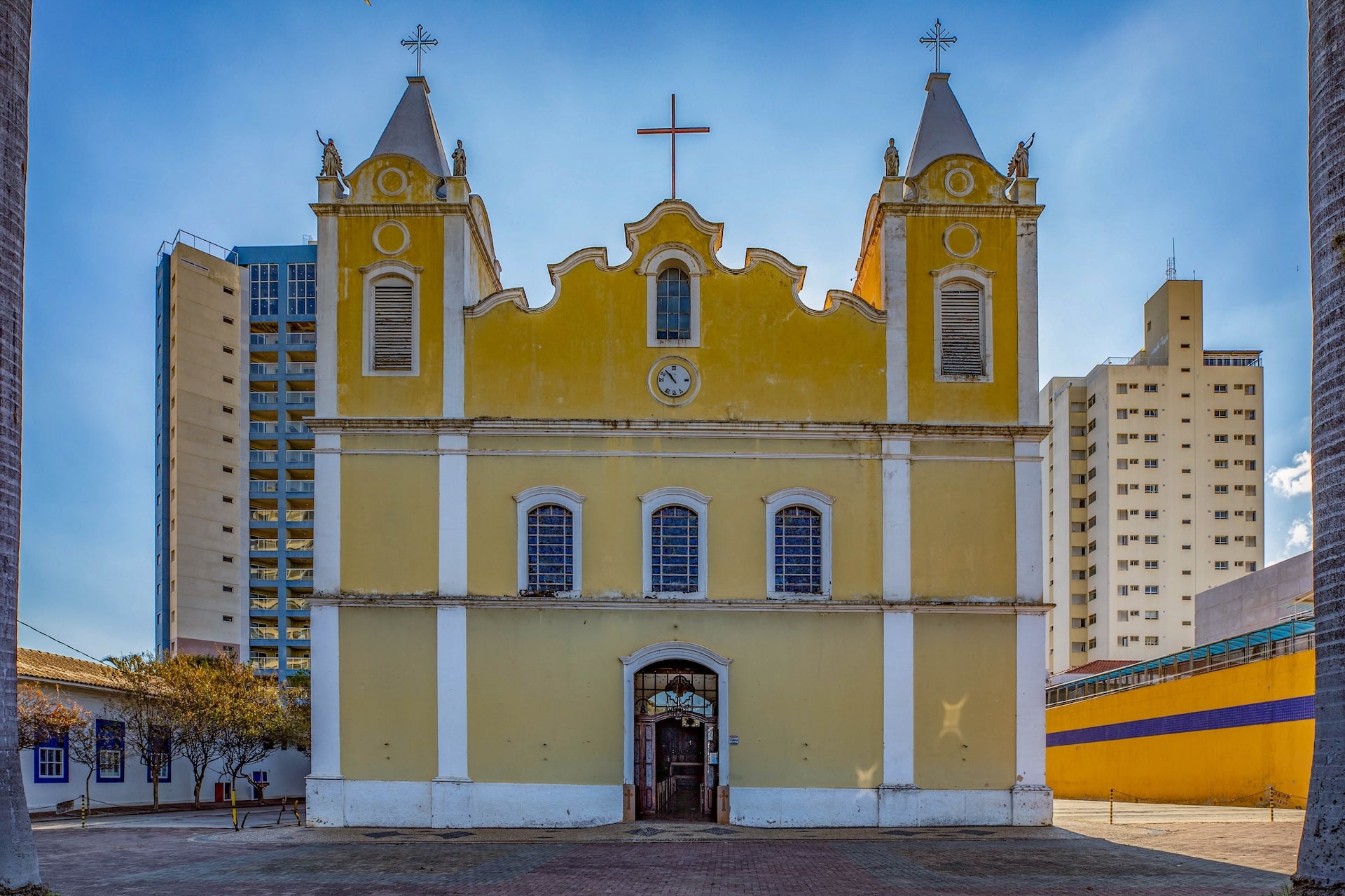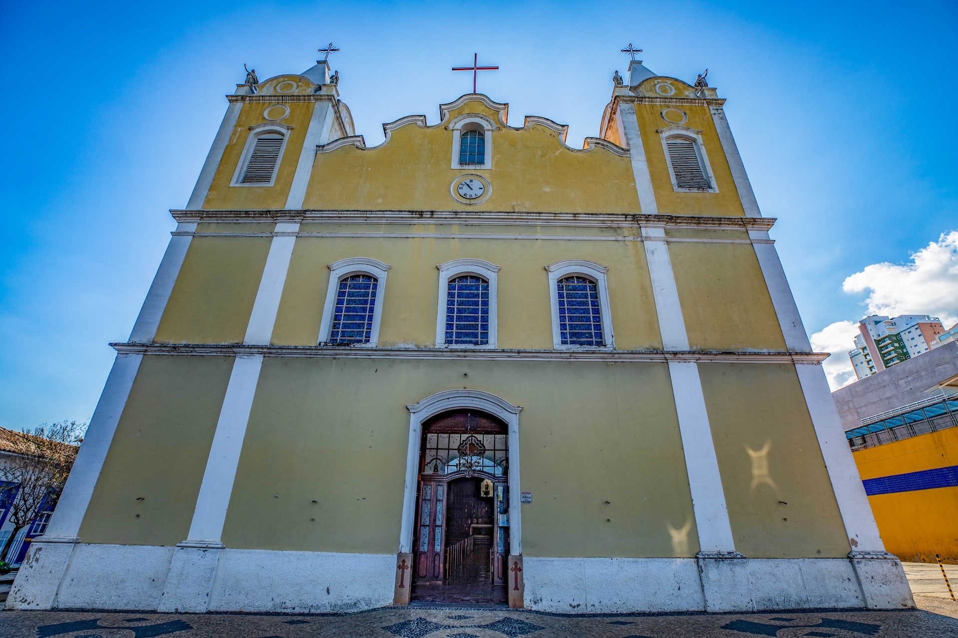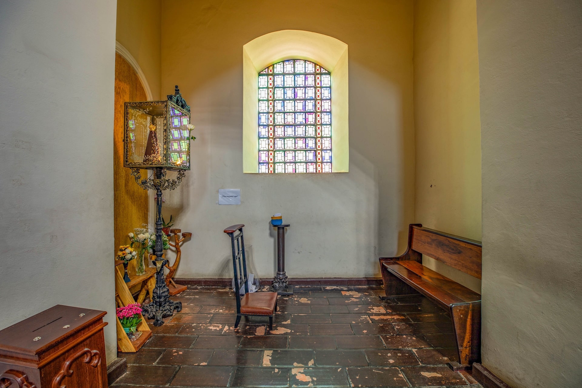 Construída em taipa de pilão no século 19, a edificação possui fachada em tom amarelo e nave com 9,84 metros de largura e 23,3 metros de comprimento, enquanto o altar é entalhado em madeira. As paredes longitudinais duplas são separadas por galerias que conectam os ambientes, mantendo o estilo e a técnica tradicionais da época.