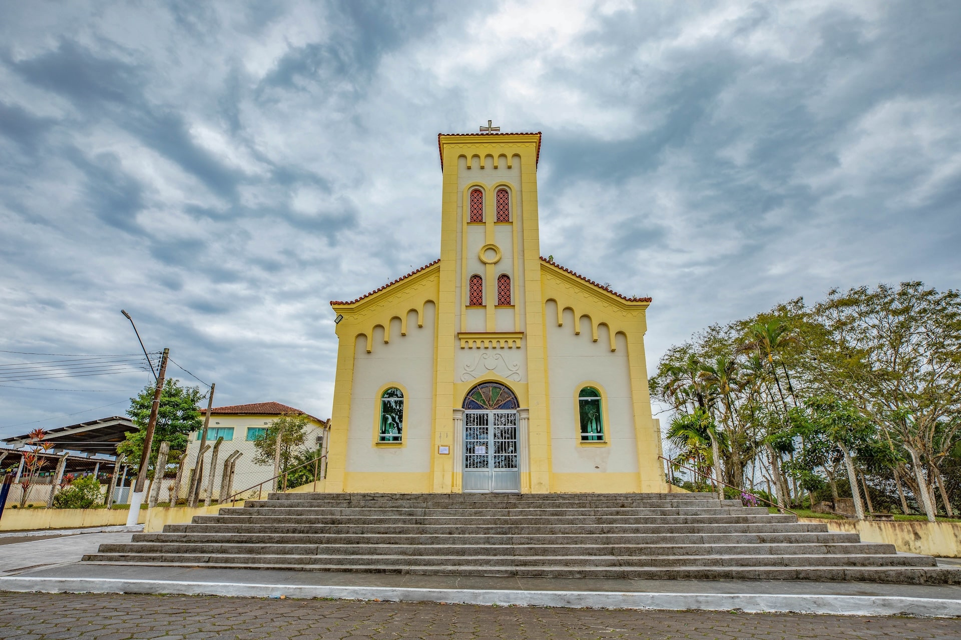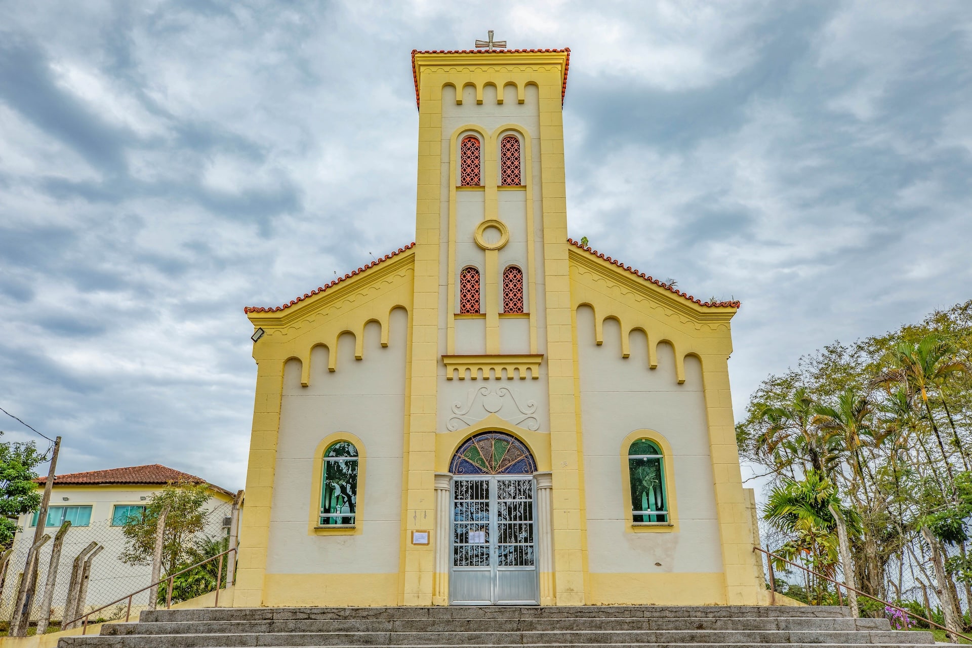 A edificação possui influências do estilo neorromântico, com fachada simétrica e torre central robusta marcada por pequenos vãos verticais. Sua ornamentação inclui detalhes em relevo, vitrais coloridos e escadaria frontal que conduz à porta metálica na entrada.