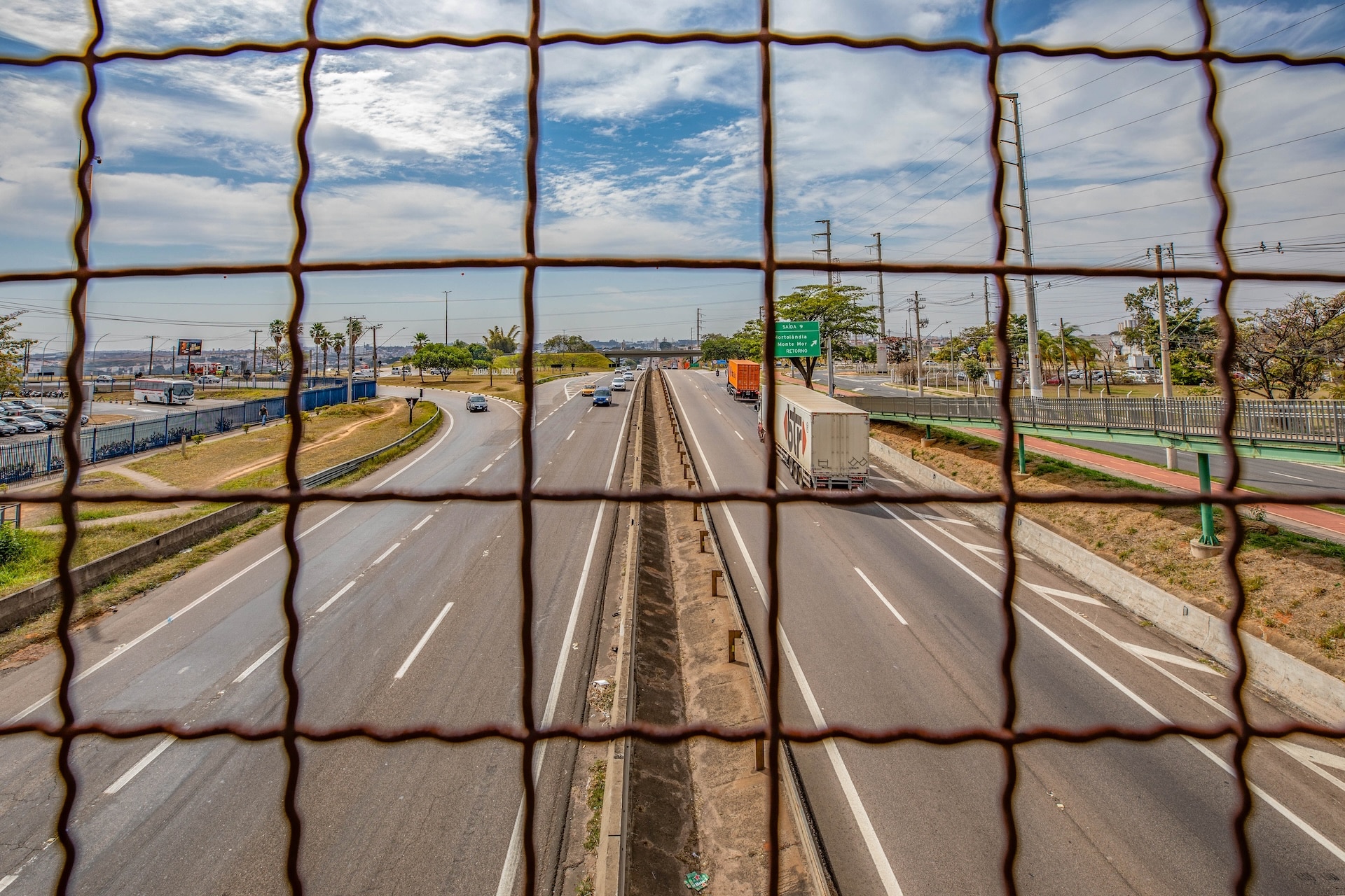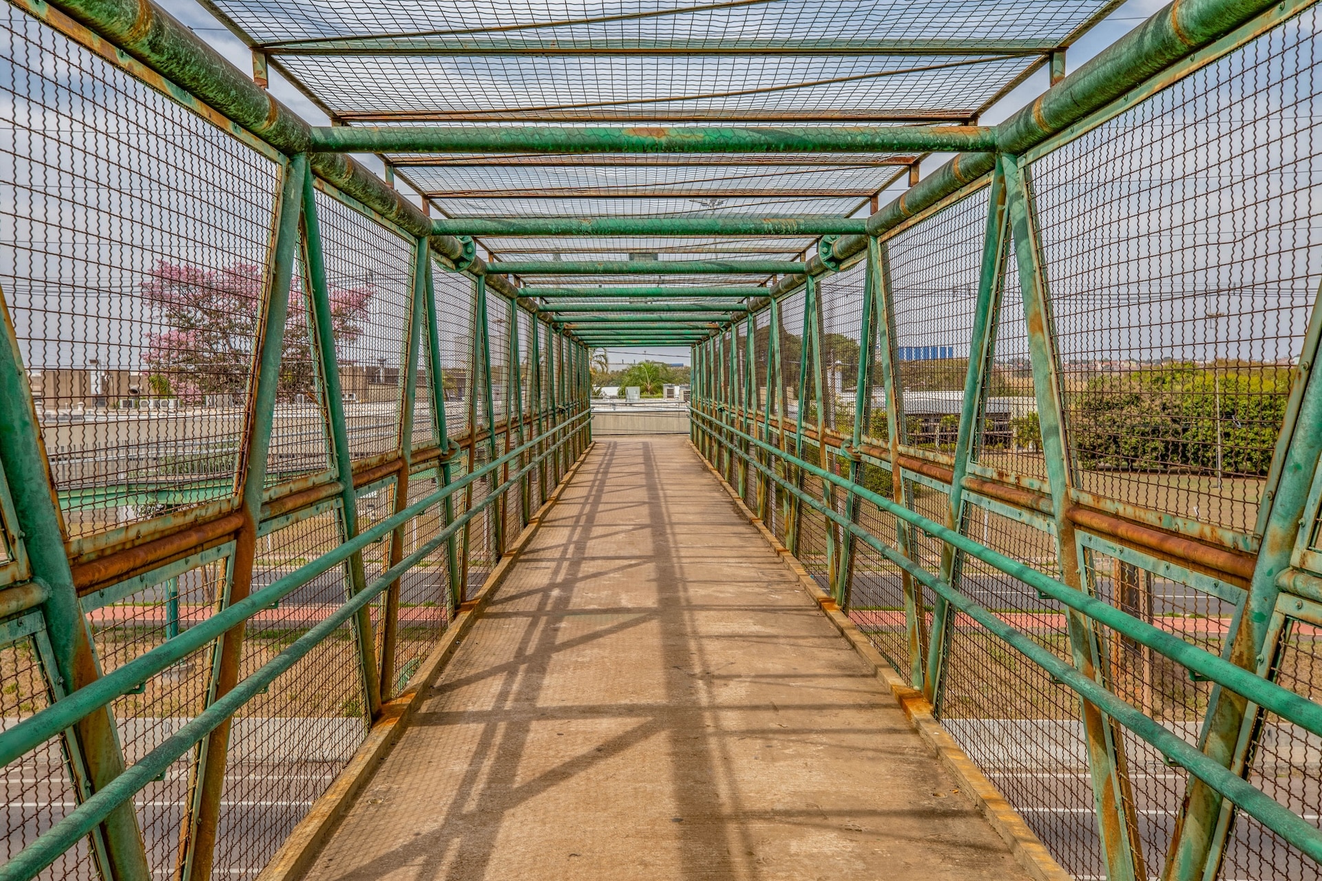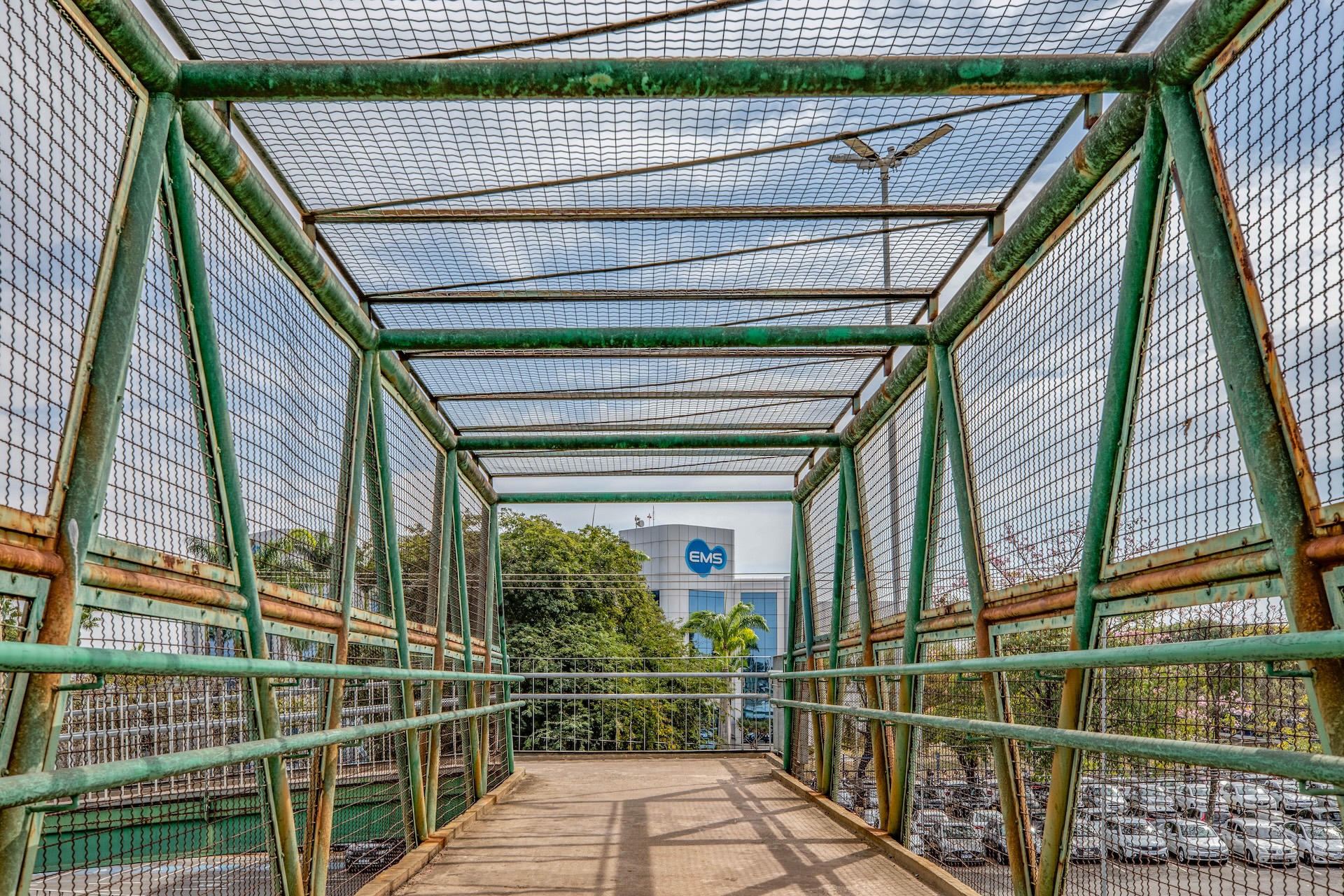 Estrutura metálica na cor verde que se destaca sobre a rodovia, permitindo a travessia de pedestres.