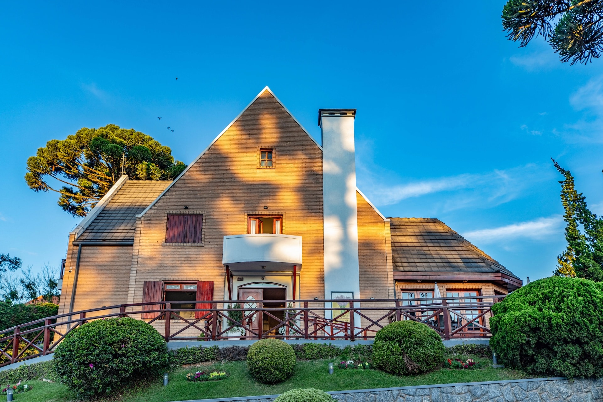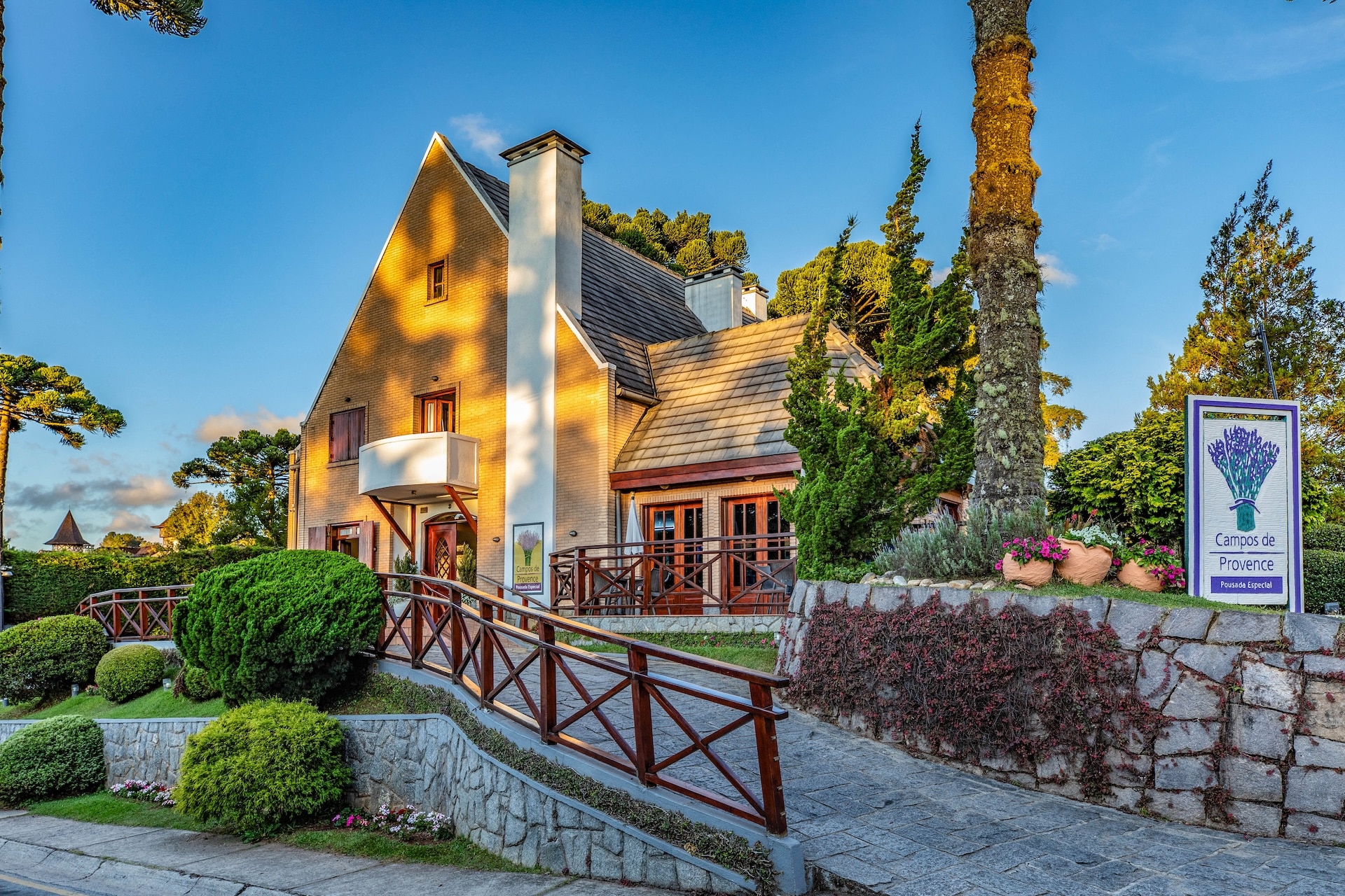 Com arquitetura inspirada no estilo europeu, a construção apresenta telhado inclinado, fachada em tons claros e elementos em madeira que remetem ao campo. O paisagismo, com jardim frontal, complementa o visual, reforçando a integração com o ambiente natural.