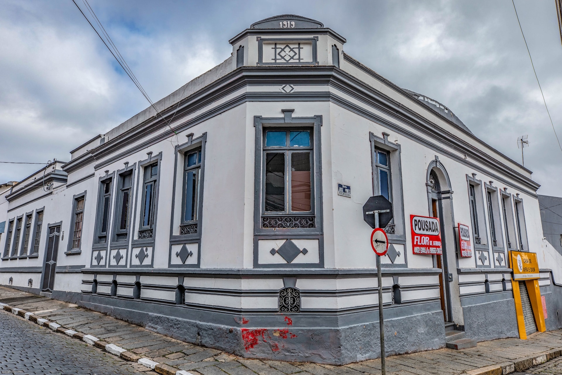 Fachada datada de 1919, com elementos decorativos geométricos que adornam a parede branca com detalhes em cinza. As janelas são altas e reforçam a simetria marcante da construção.