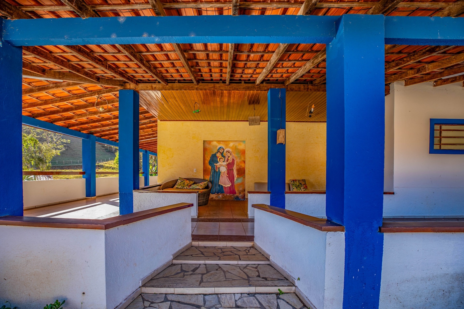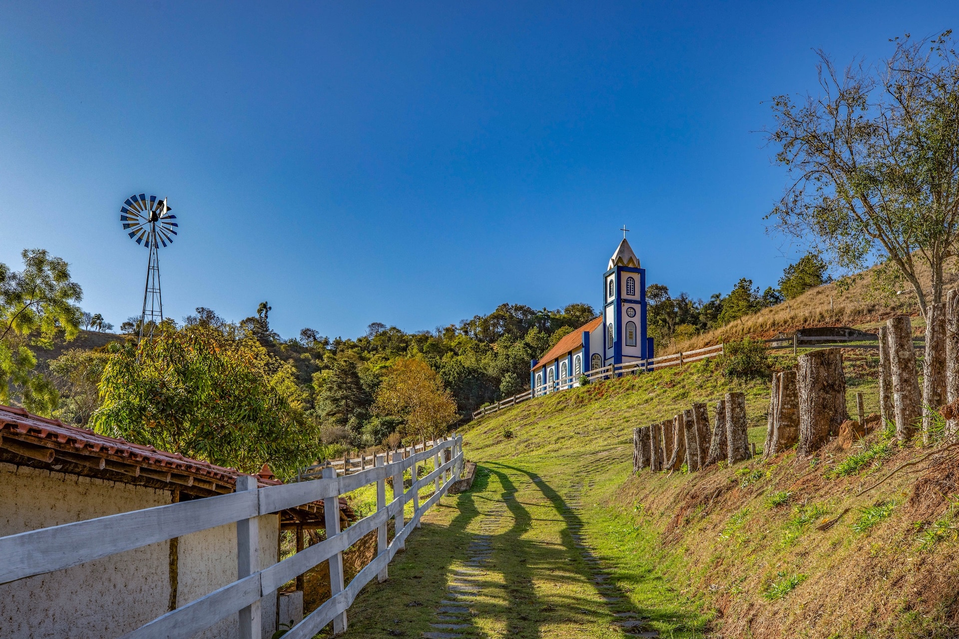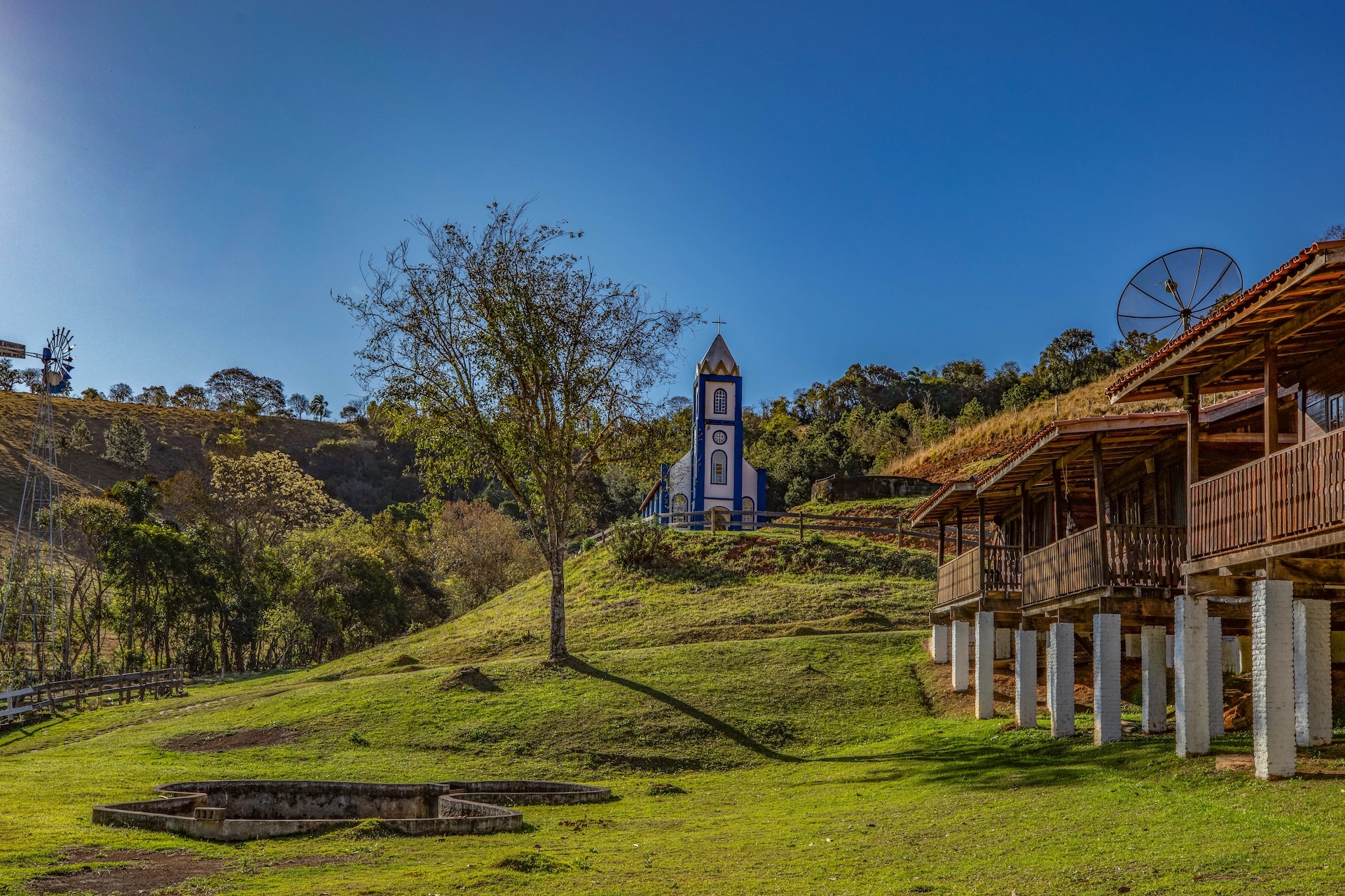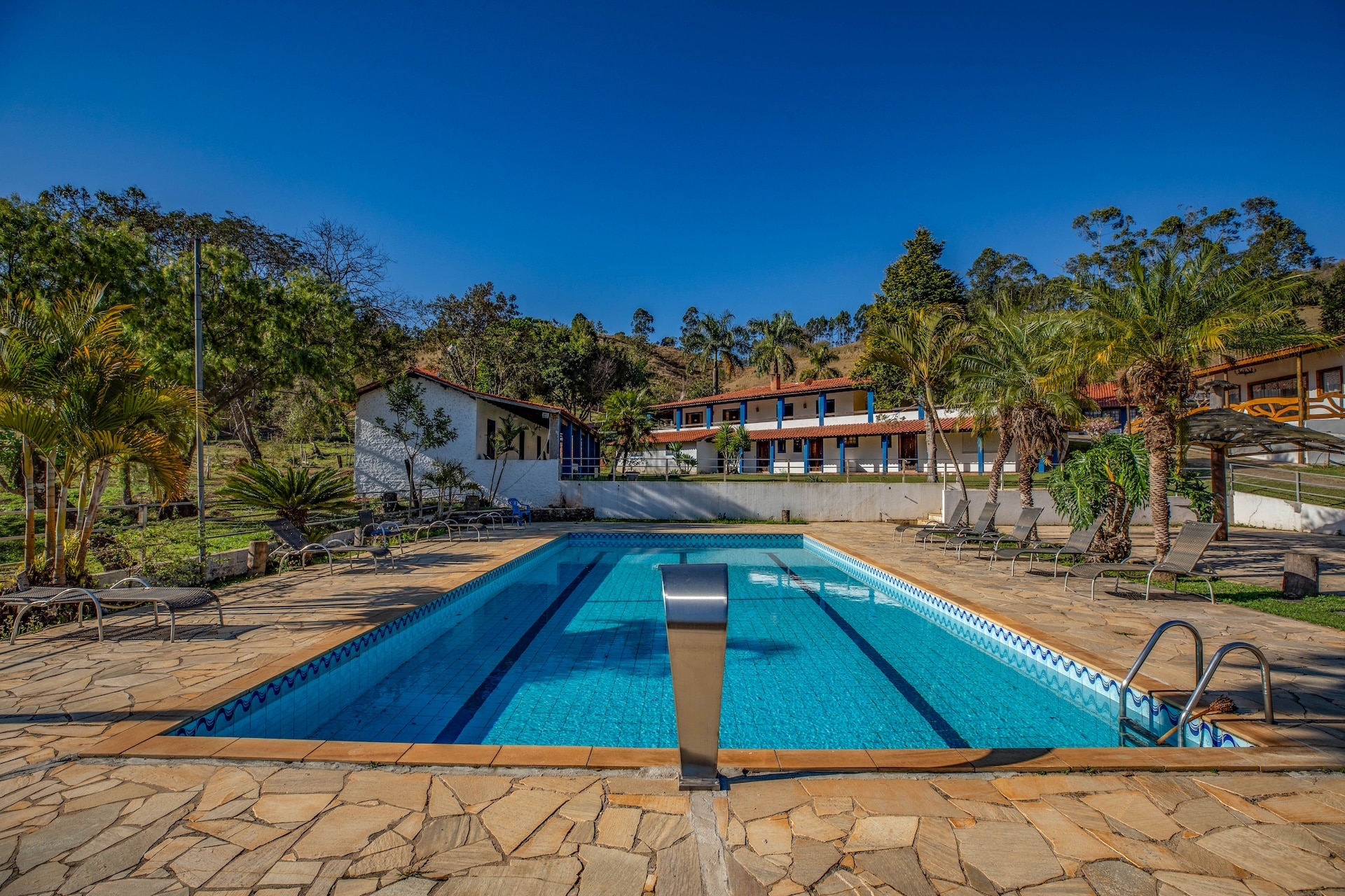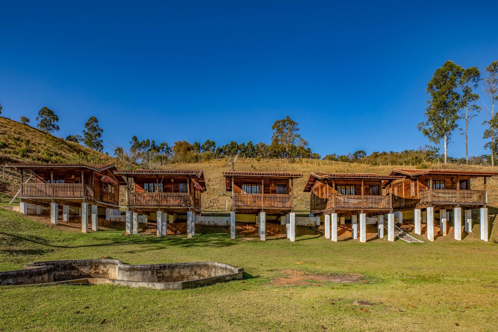 Em meio às montanhas da Serra da Mantiqueira, o espaço oferece piscina, sauna, academia, salão de jogos, restaurante, bar e área infantil. A pousada conta com chalés de madeira que possuem sacadas com vista para a imponente capela no terreno, cuja torre central, nas cores branco e azul, contrasta com a vegetação ao redor.