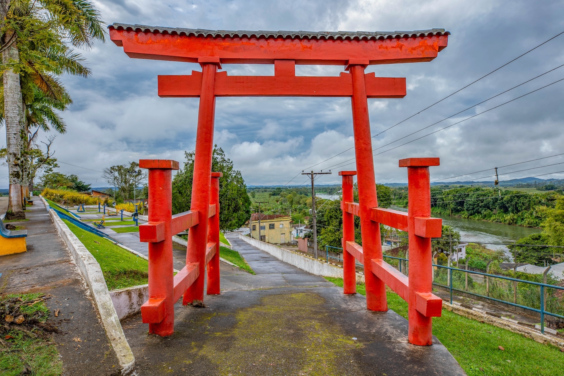 O local apresenta um tori vermelho, tradicional portal da cultura japonesa, que conduz à praça com vista para parte da cidade.