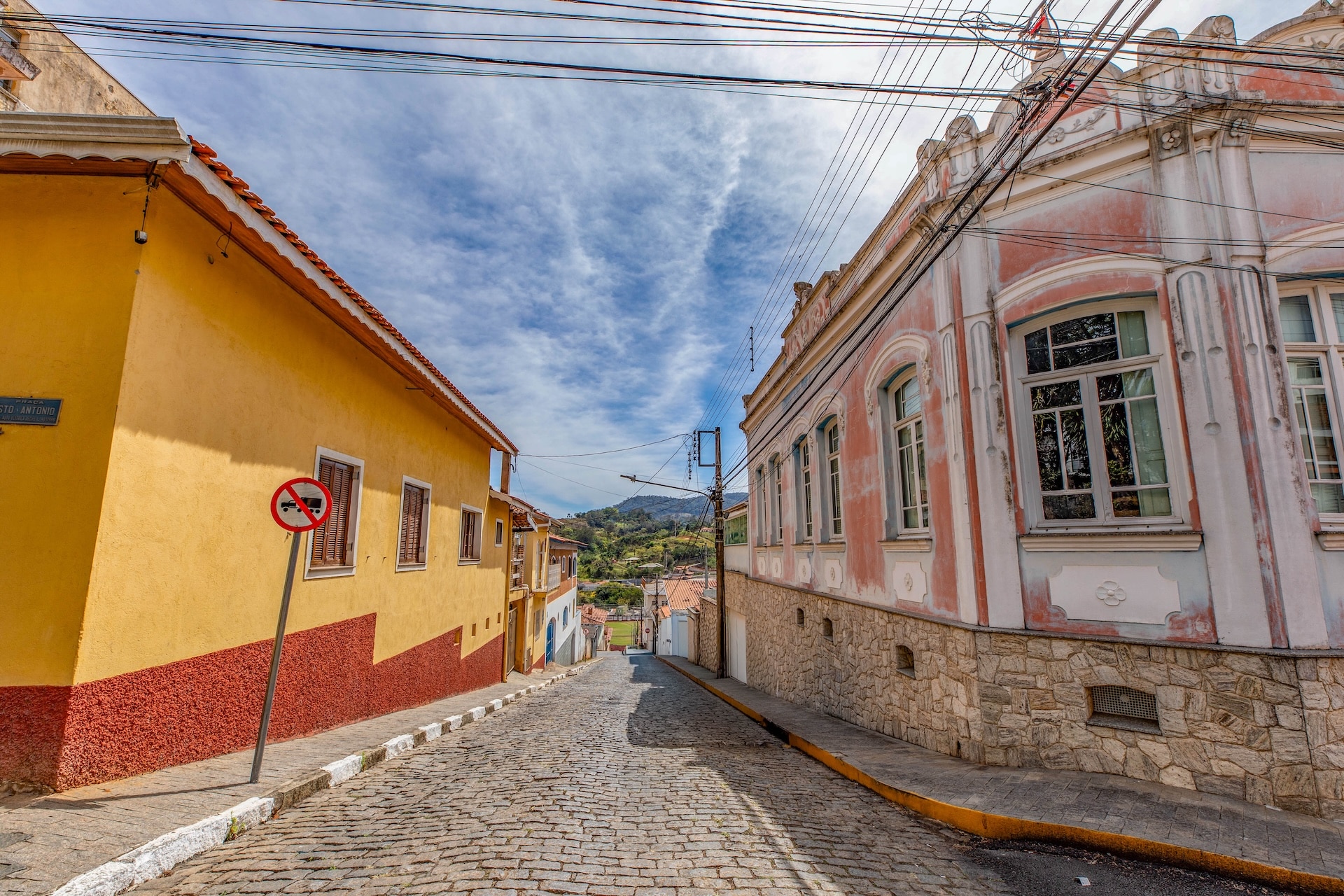 Espaço arborizado com vista para ruas de paralelepípedo entre construções históricas com fachadas preservadas.