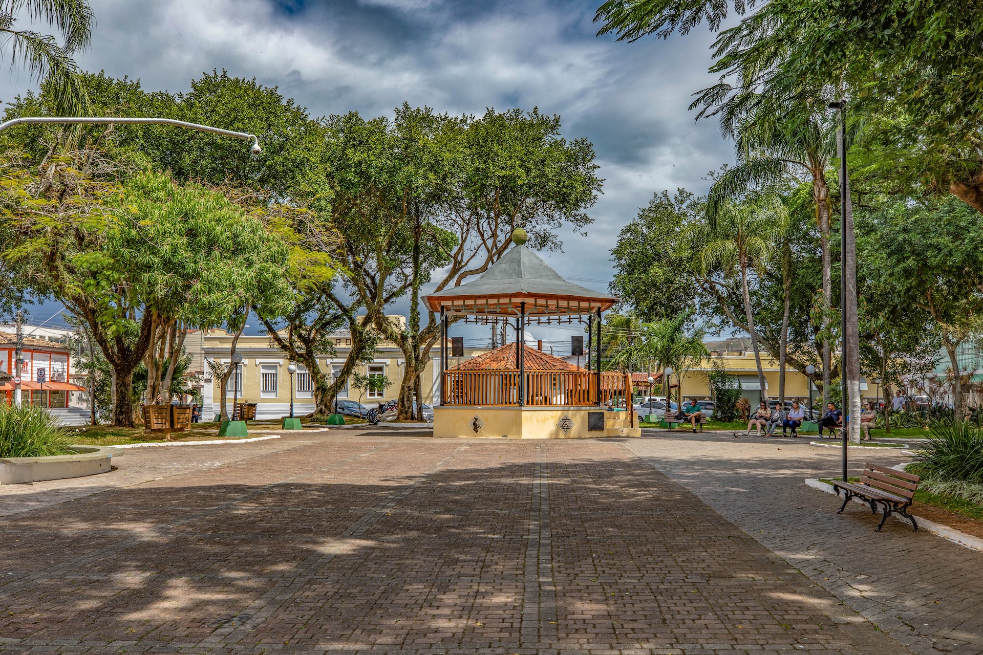Marcada pela presença de um coreto central, com base amarela e estrutura em madeira, a área é sombreada por diversas árvores e harmoniza elementos simples e históricos.