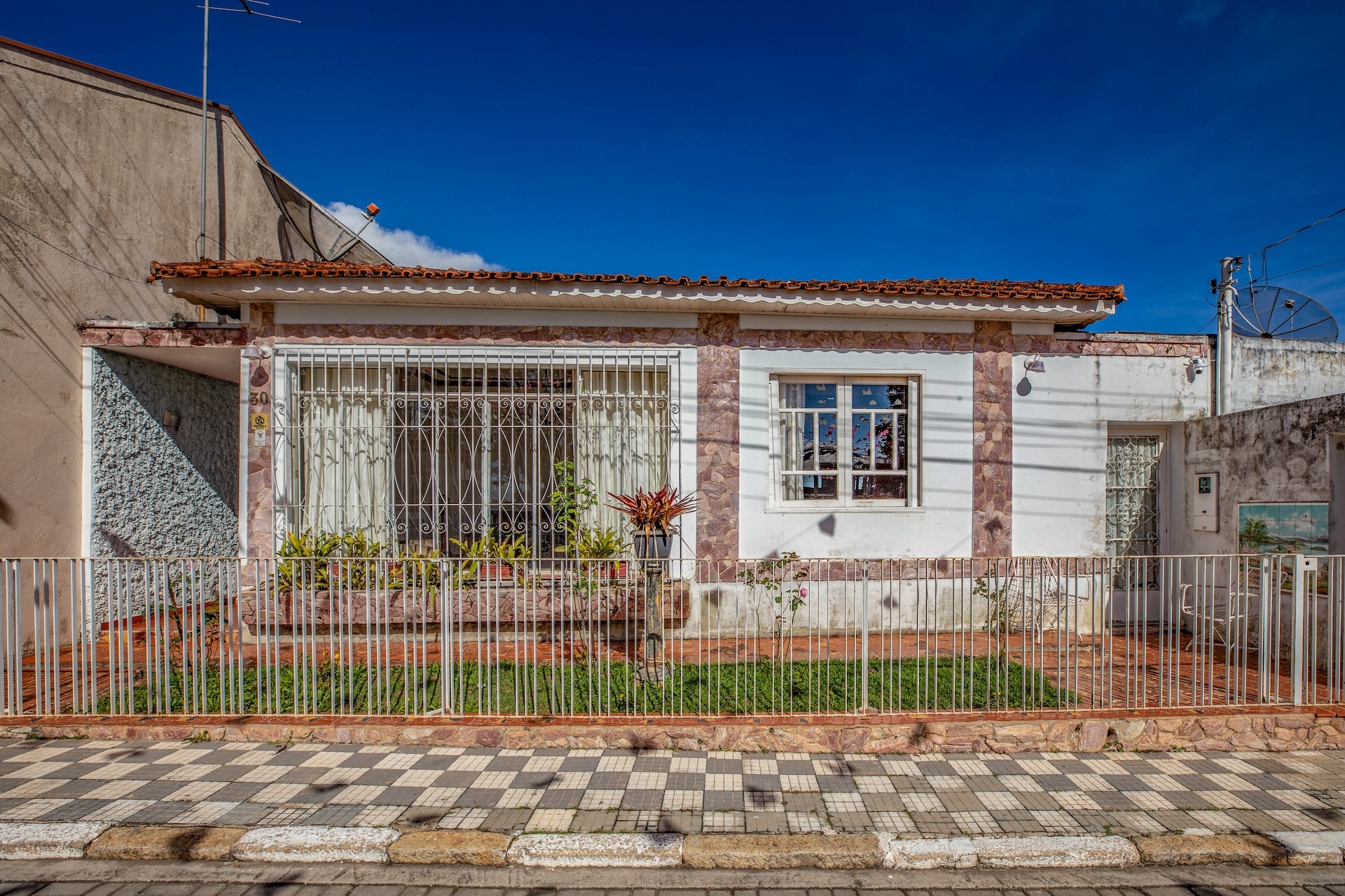 Residência térrea com fachada simples e detalhes em pedras rosadas que contornam as janelas. O imóvel é cercado por uma grade pintada de branco e um jardim à frente. A calçada externa é revestida com ladrilhos em padrão xadrez nas cores preto e branco, compondo o visual.