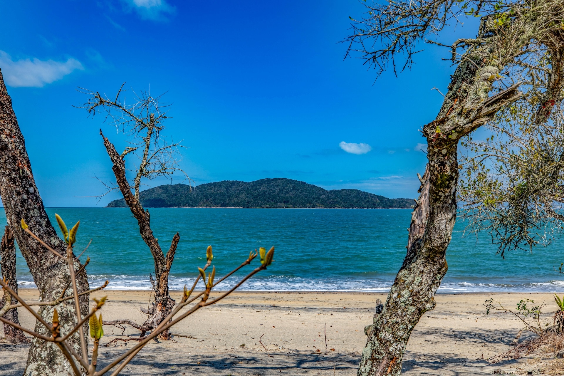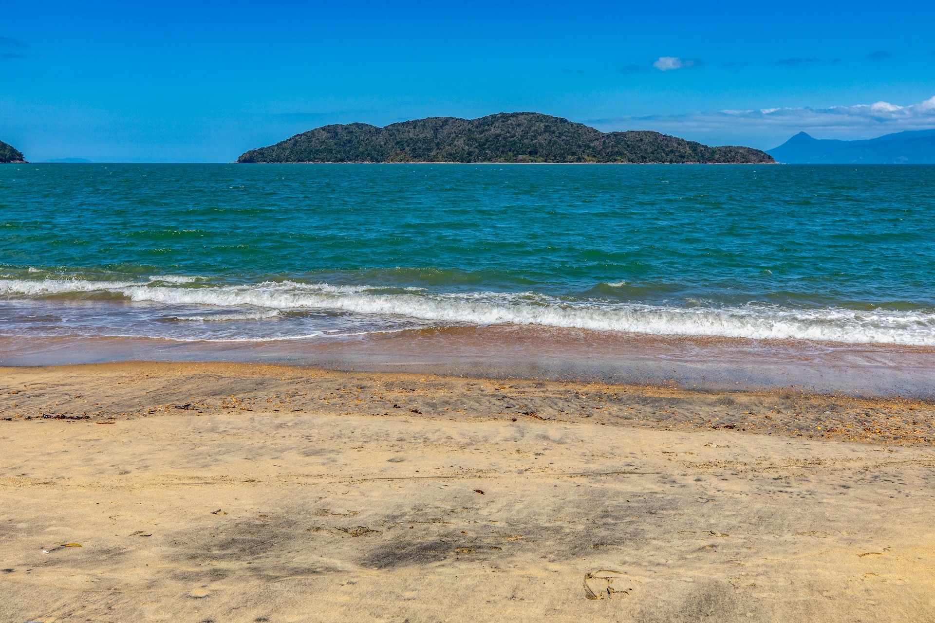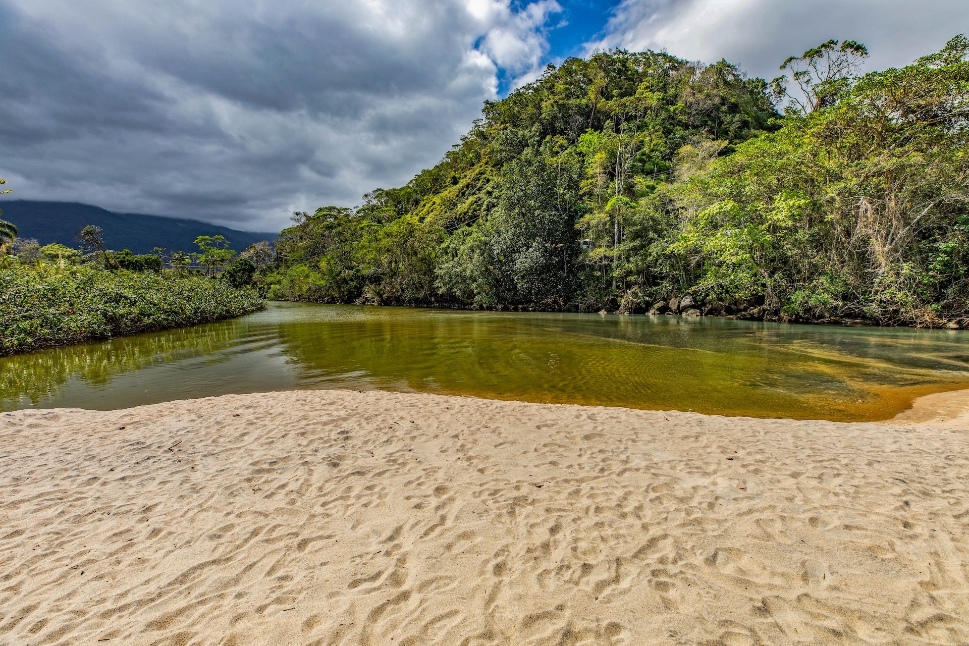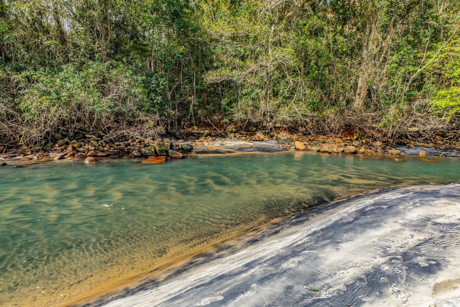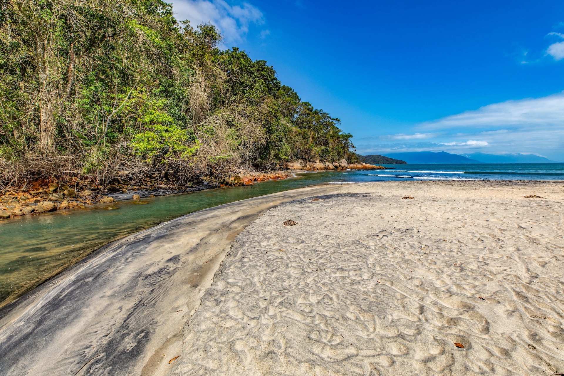Com costões rochosos e vegetação de restinga, no canto esquerdo, o Rio Mococa deságua no mar, onde contrasta o encontro das águas doces e salgadas.