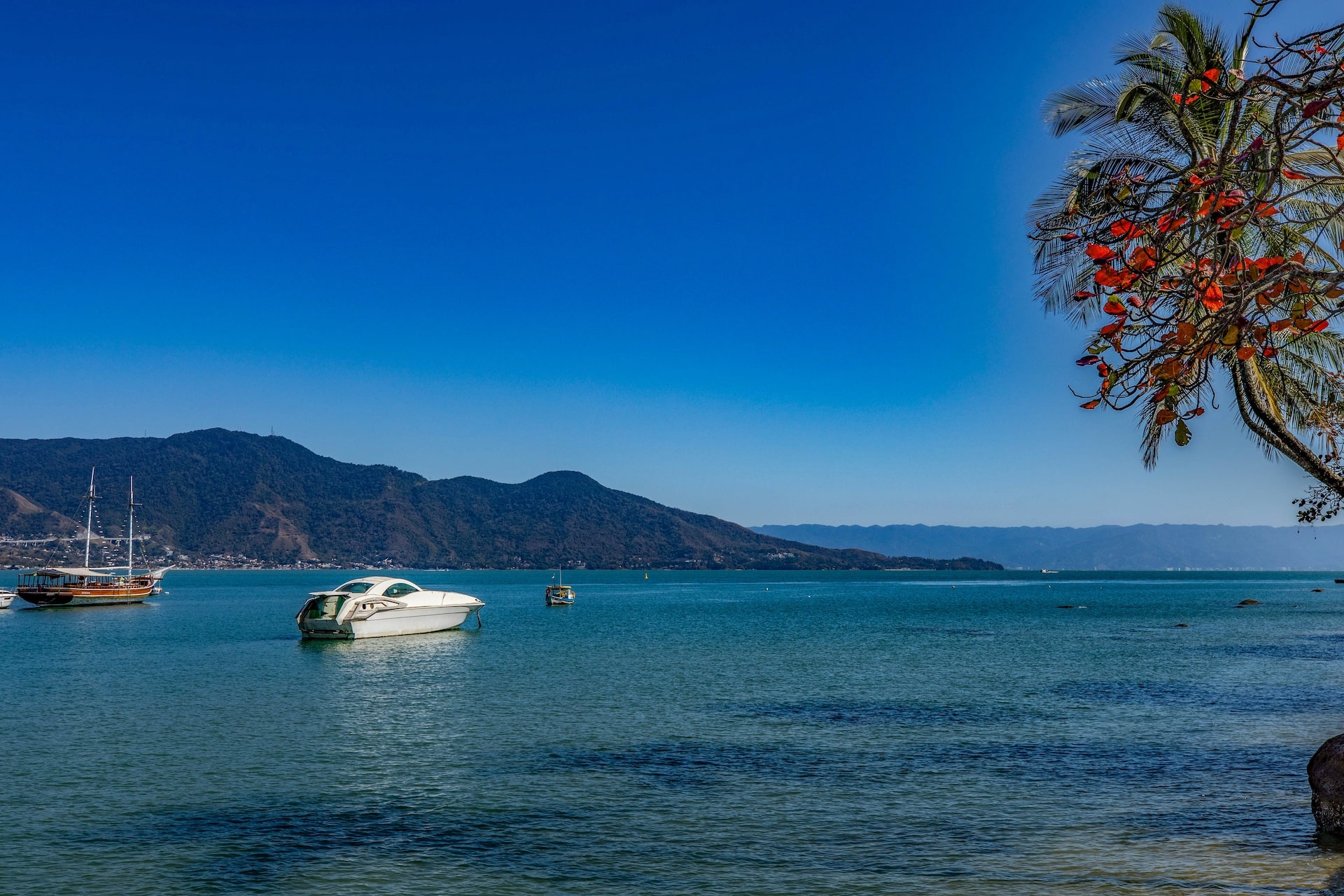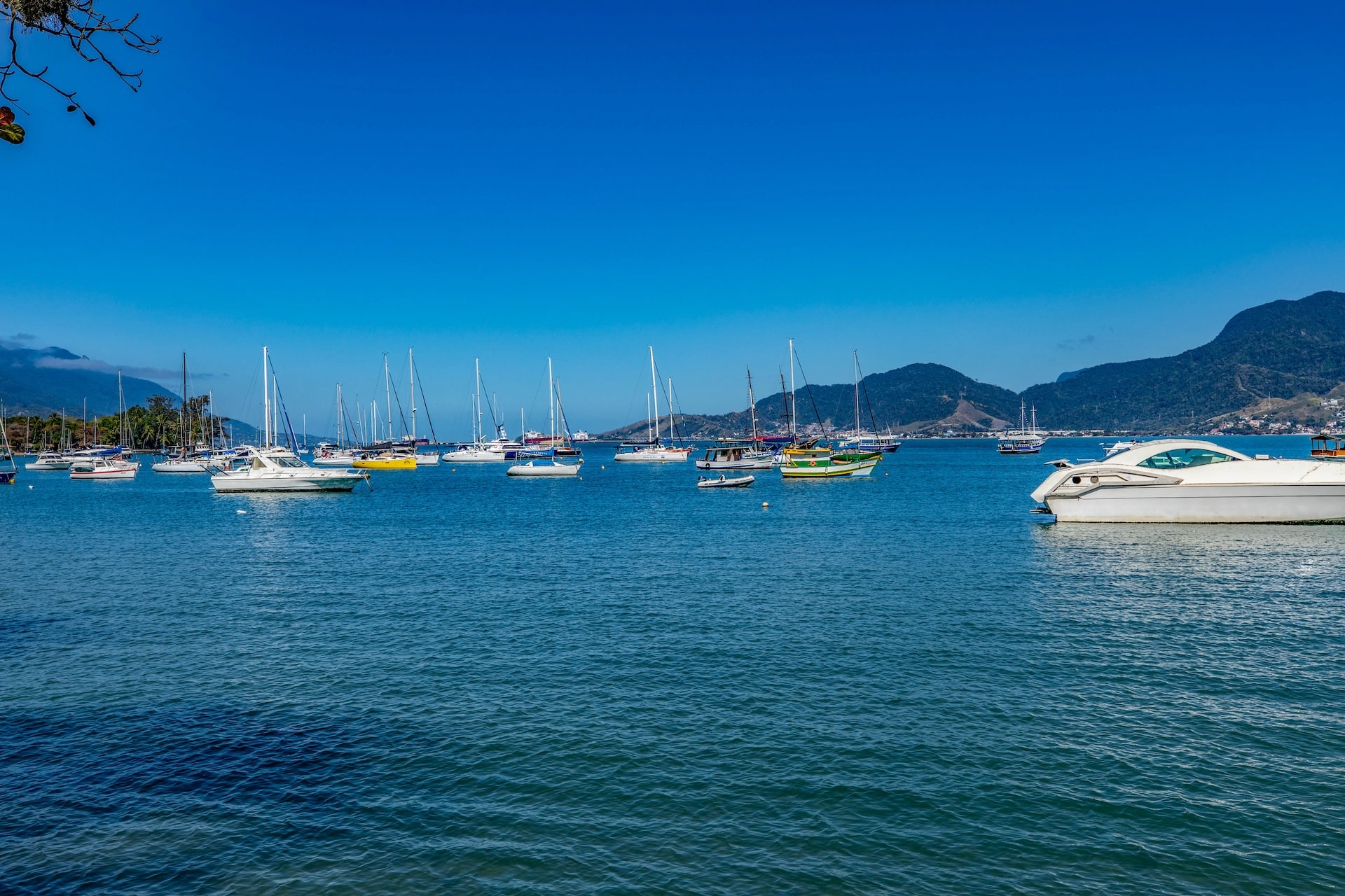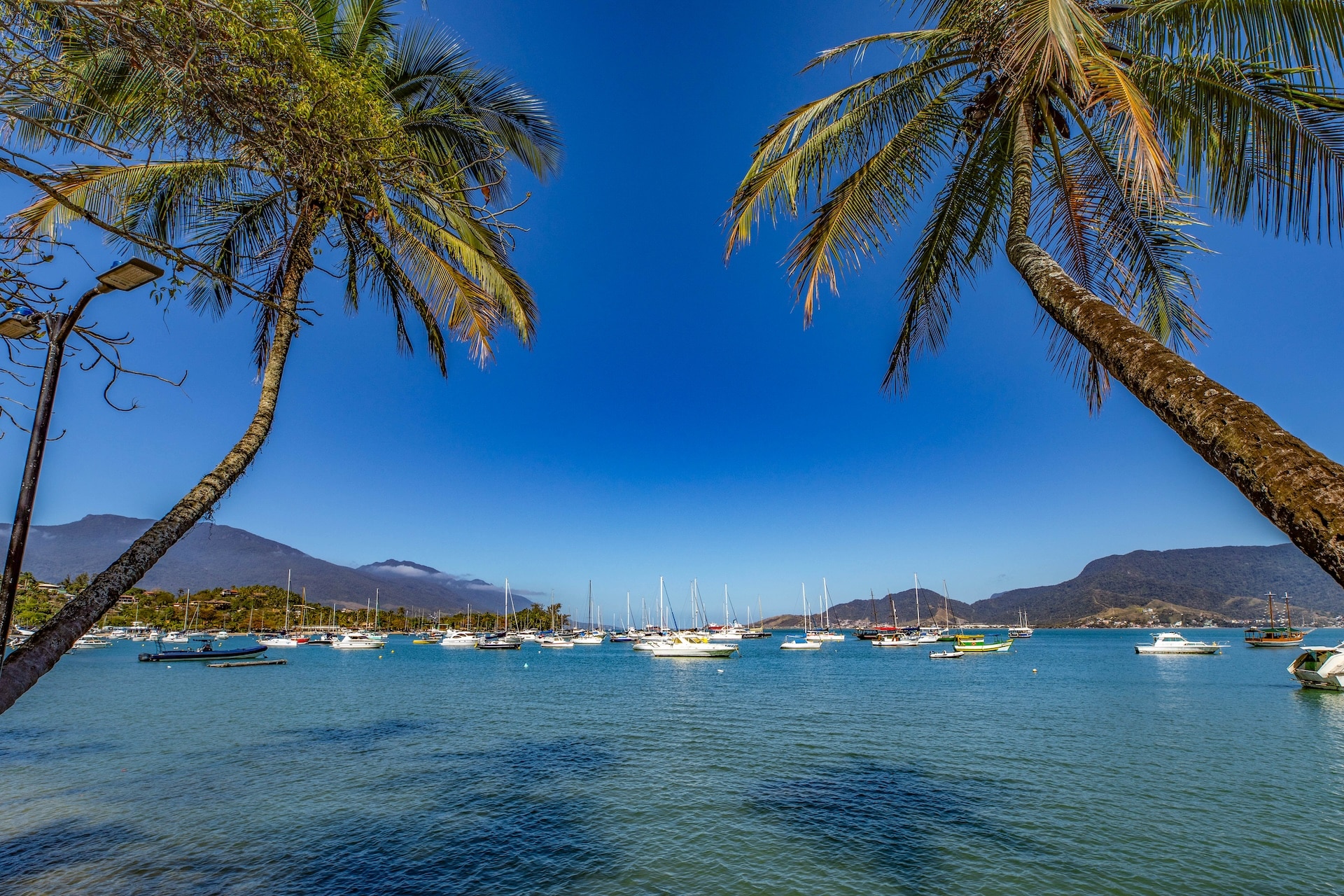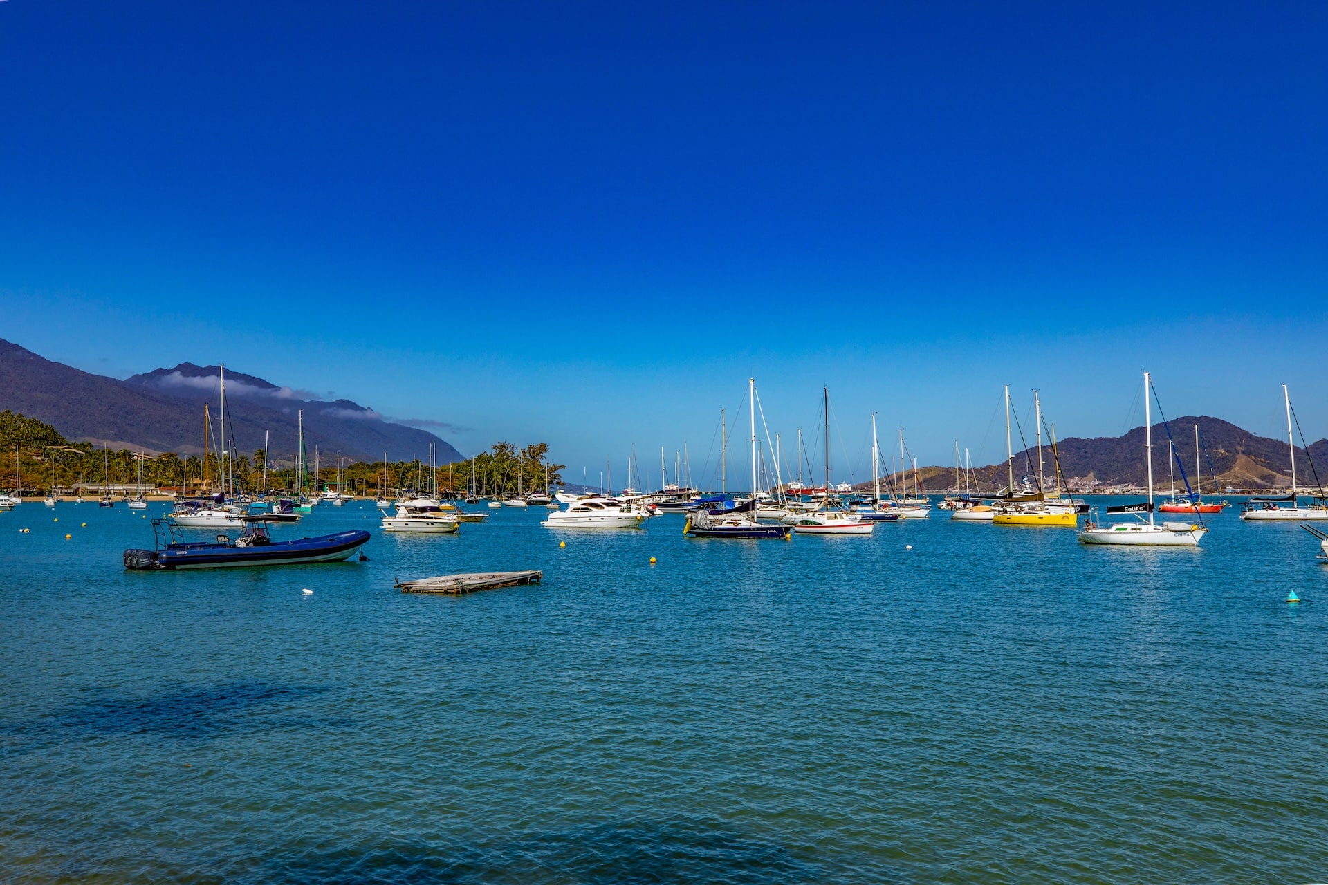Repleta de veleiros e lanchas, destaca-se pelas águas em tom de azul e pelas palmeiras na orla, compondo um cenário típico do litoral paulista.