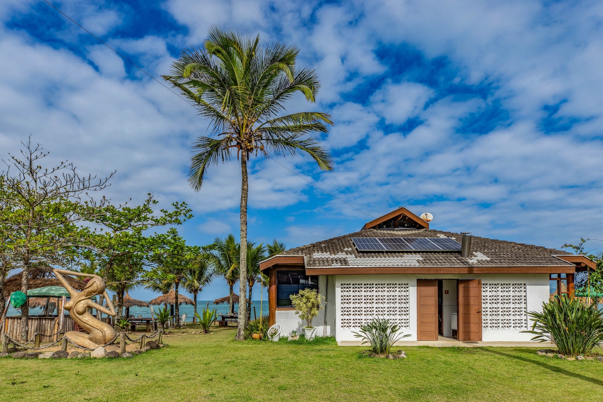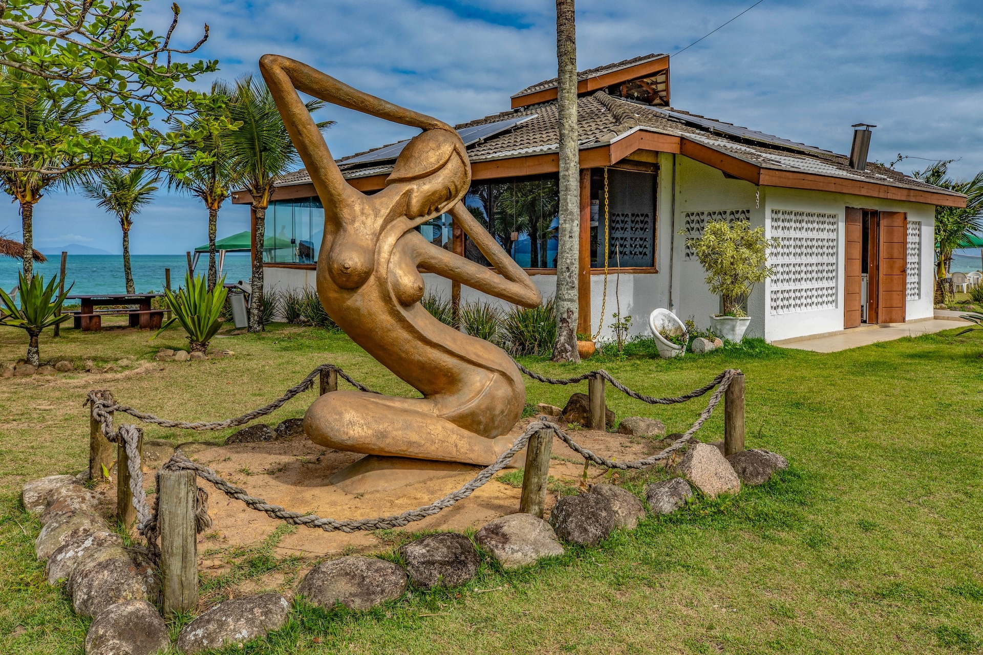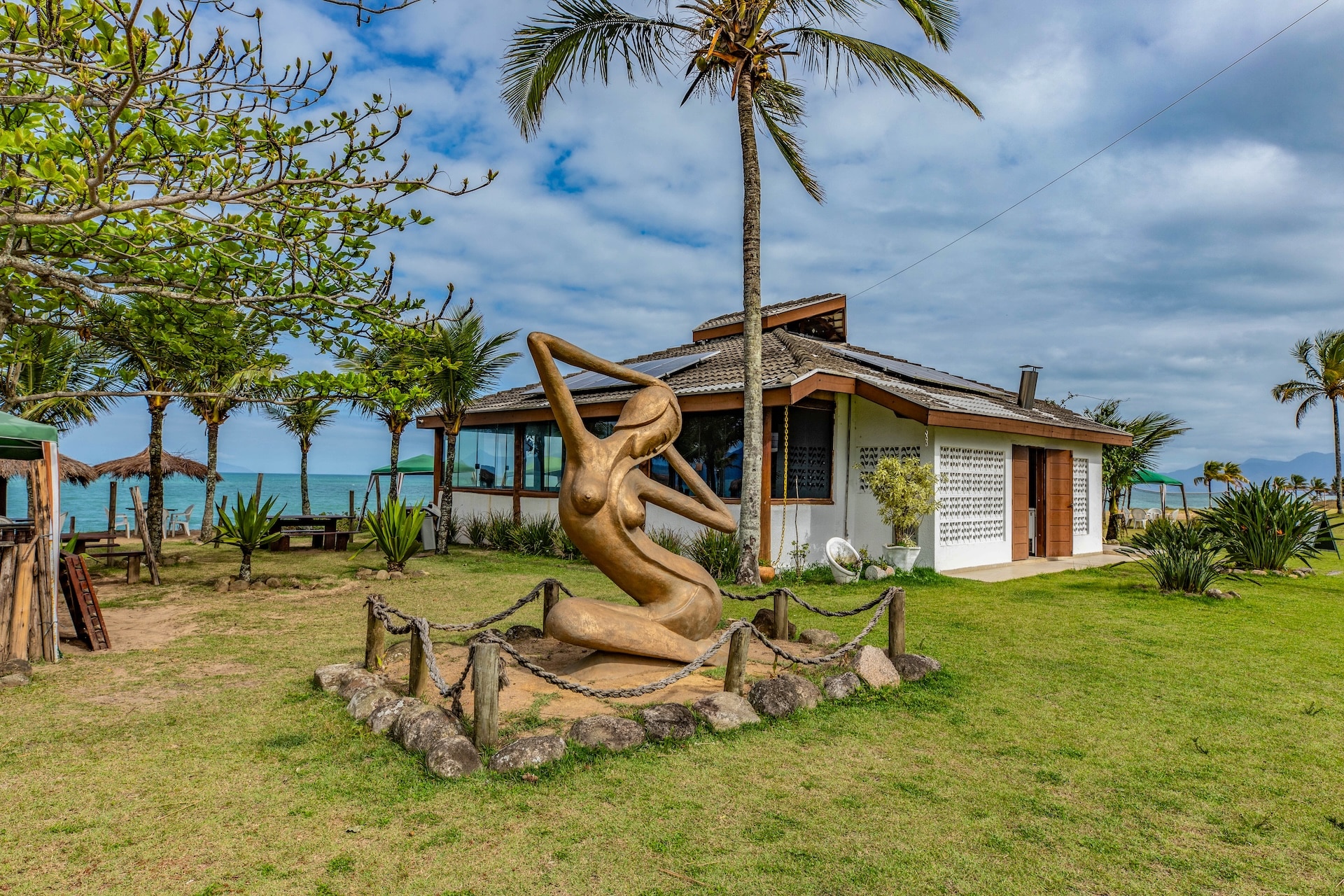 Apresenta estrutura simples, com vista para o mar e vegetação tropical, marcado por uma escultura de sereia na entrada.
