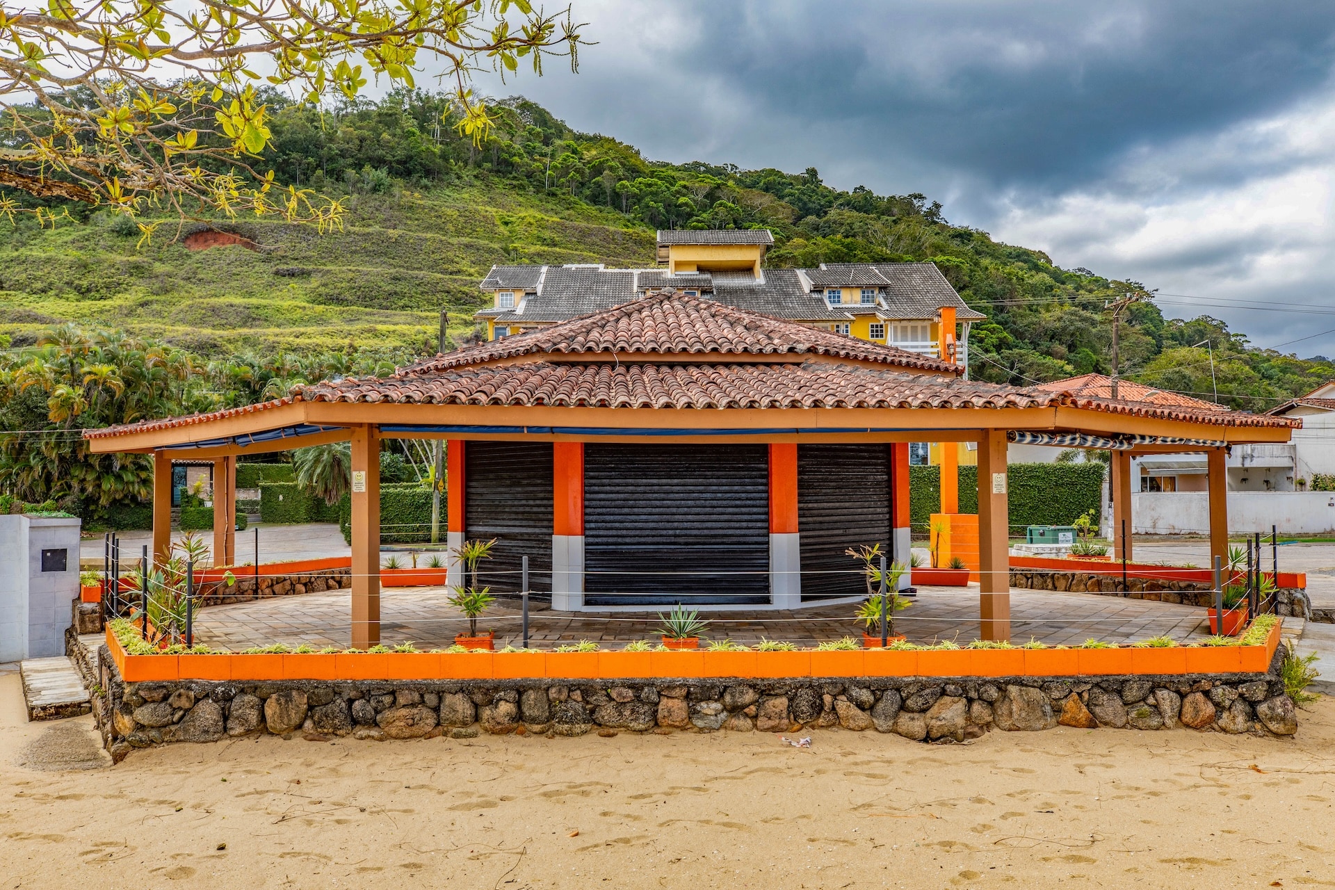 Estrutura em tom laranja, com pedras aparentes na base, contrastando com a paisagem natural ao redor.
