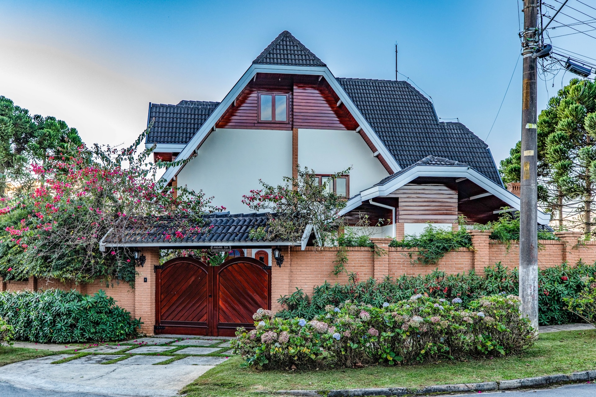A casa apresenta características da arquitetura alpina europeia, com telhado inclinado e telhas escuras. As paredes claras contrastam com os detalhes em madeira e a vegetação ornamental no muro.