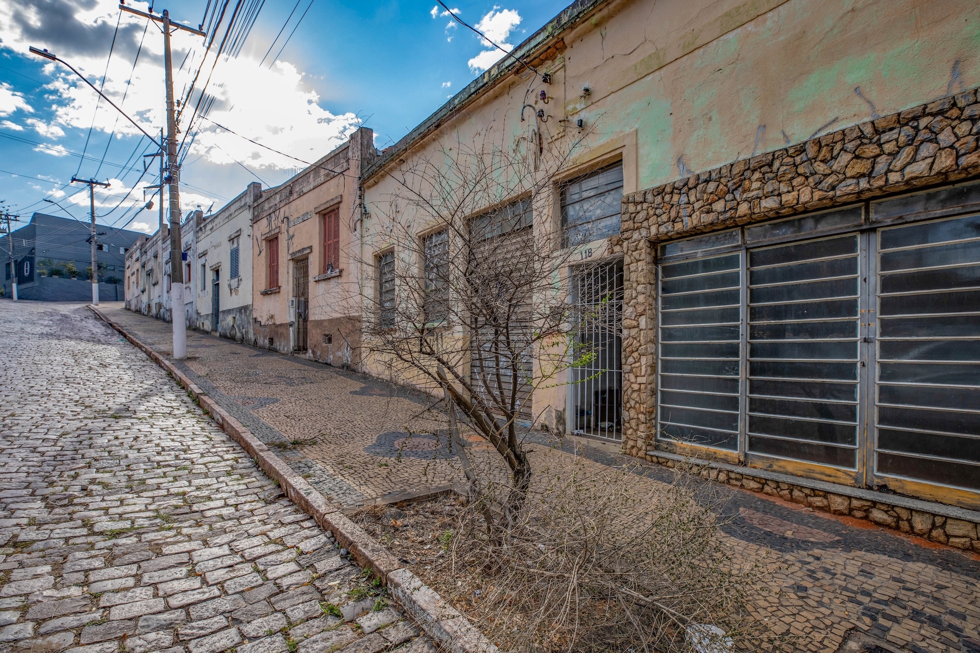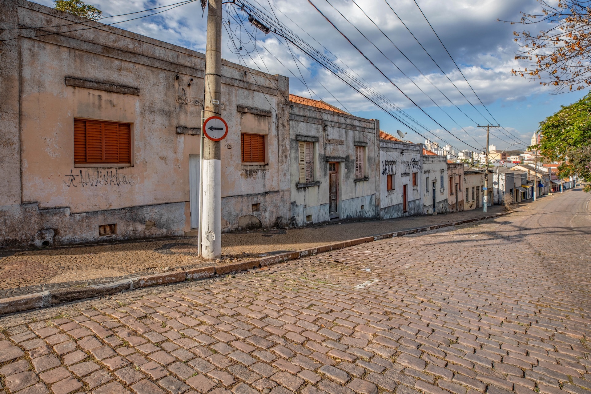 Rua de paralelepípedo ladeada por um conjunto de fachadas de casas.