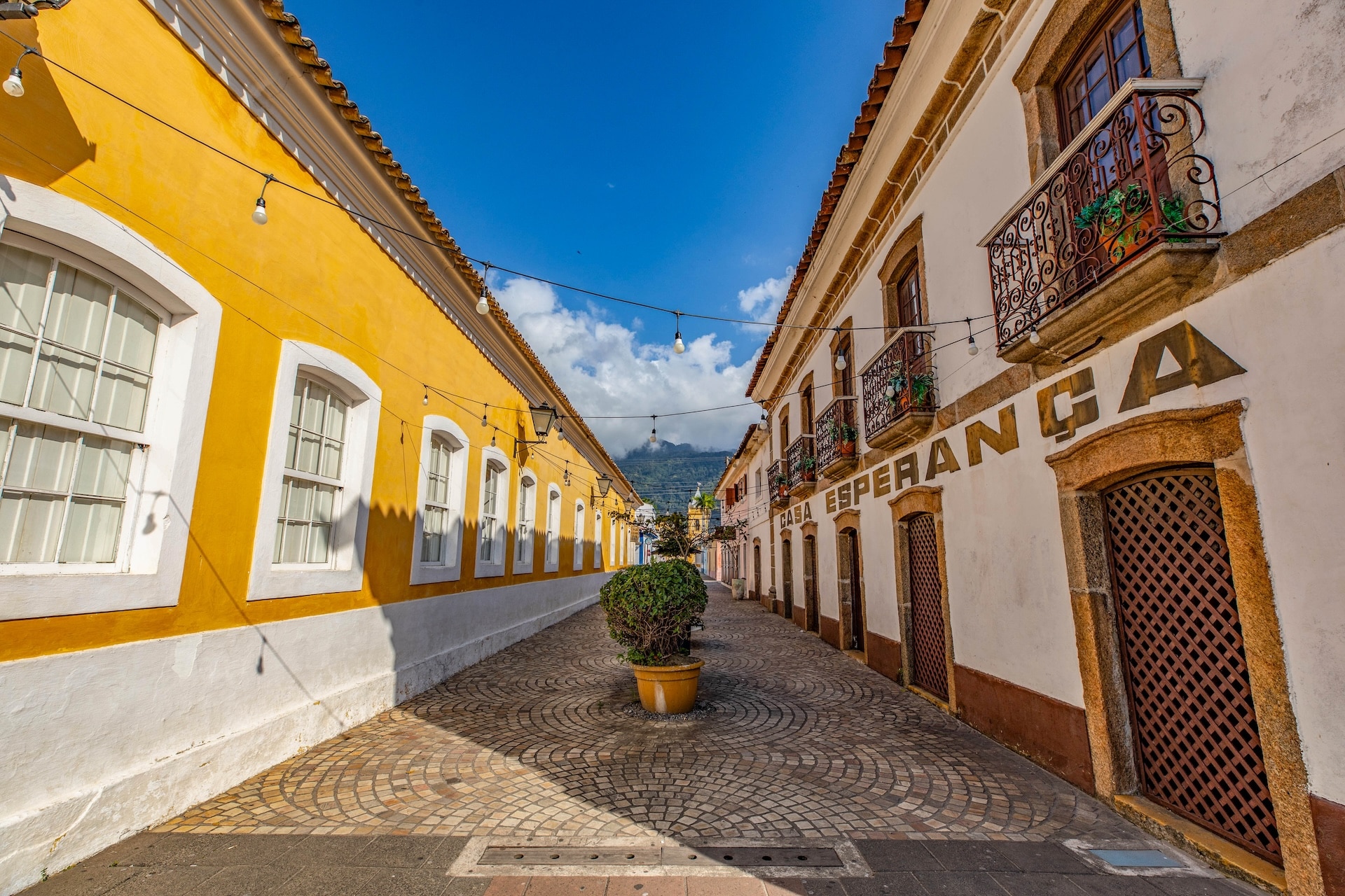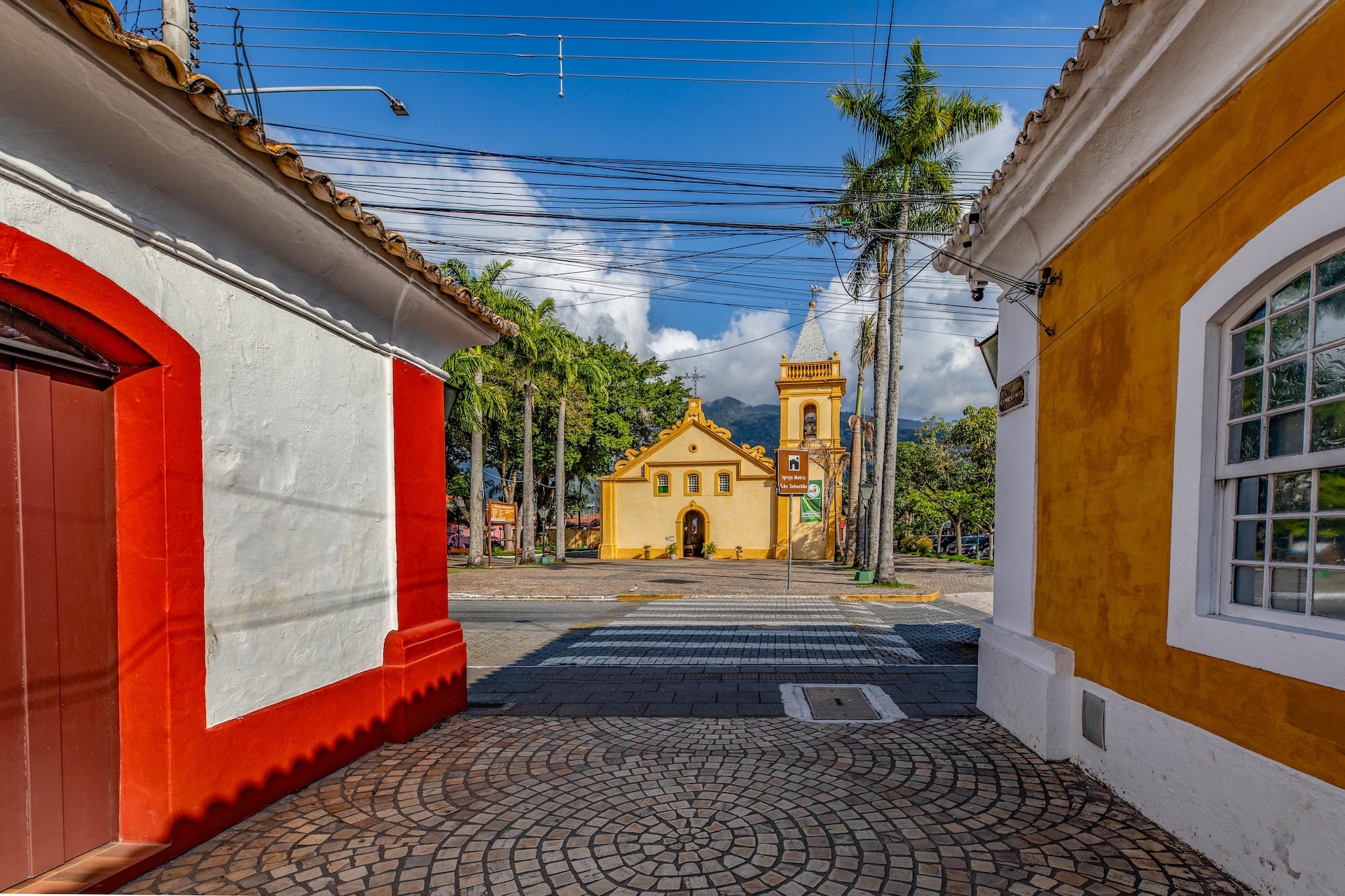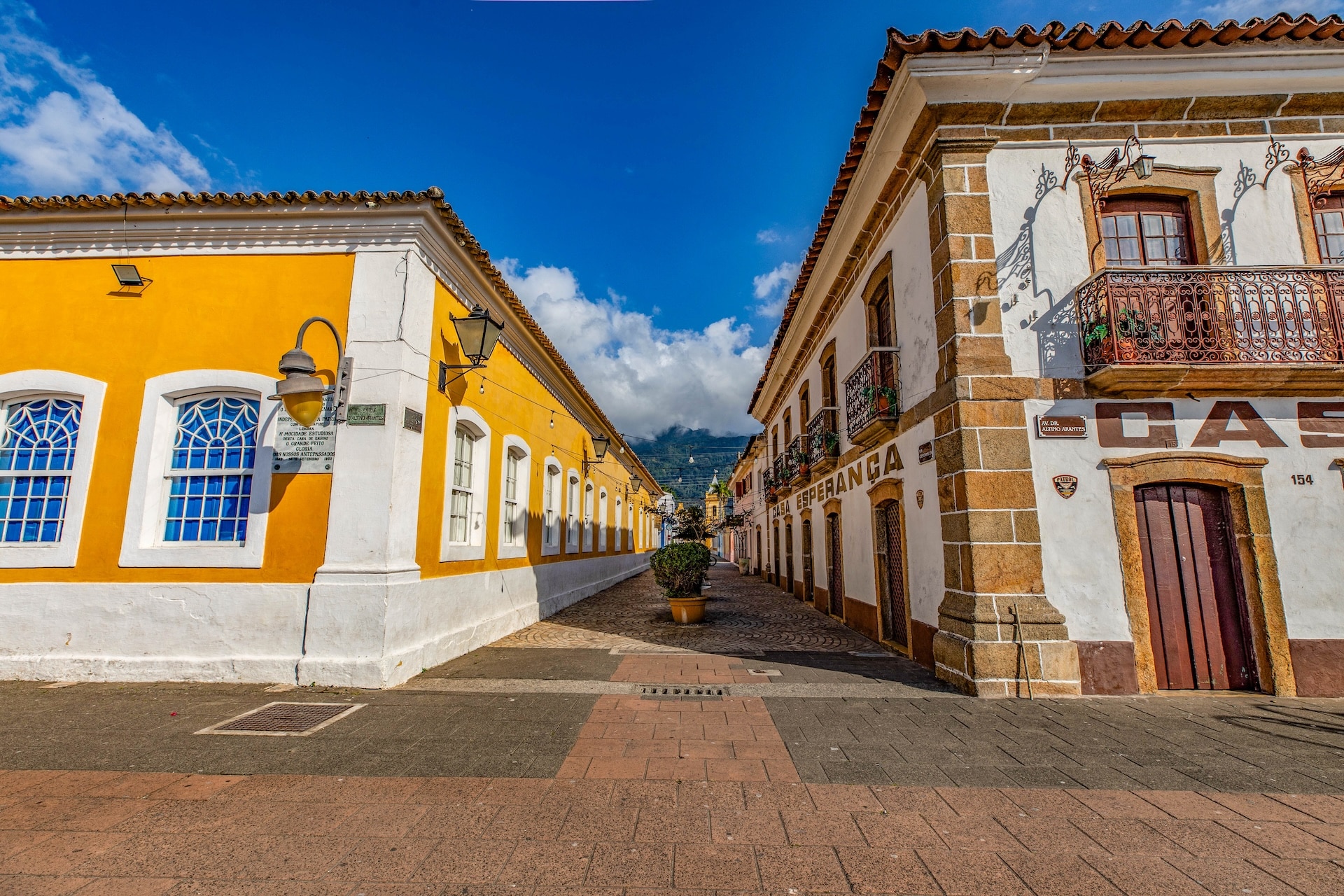 Via composta por casas históricas de estilo colonial no centro da cidade, com vista para a Igreja Matriz. O chão é revestido com ladrilhos circulares de cerâmica, formando padrão repetitivo.