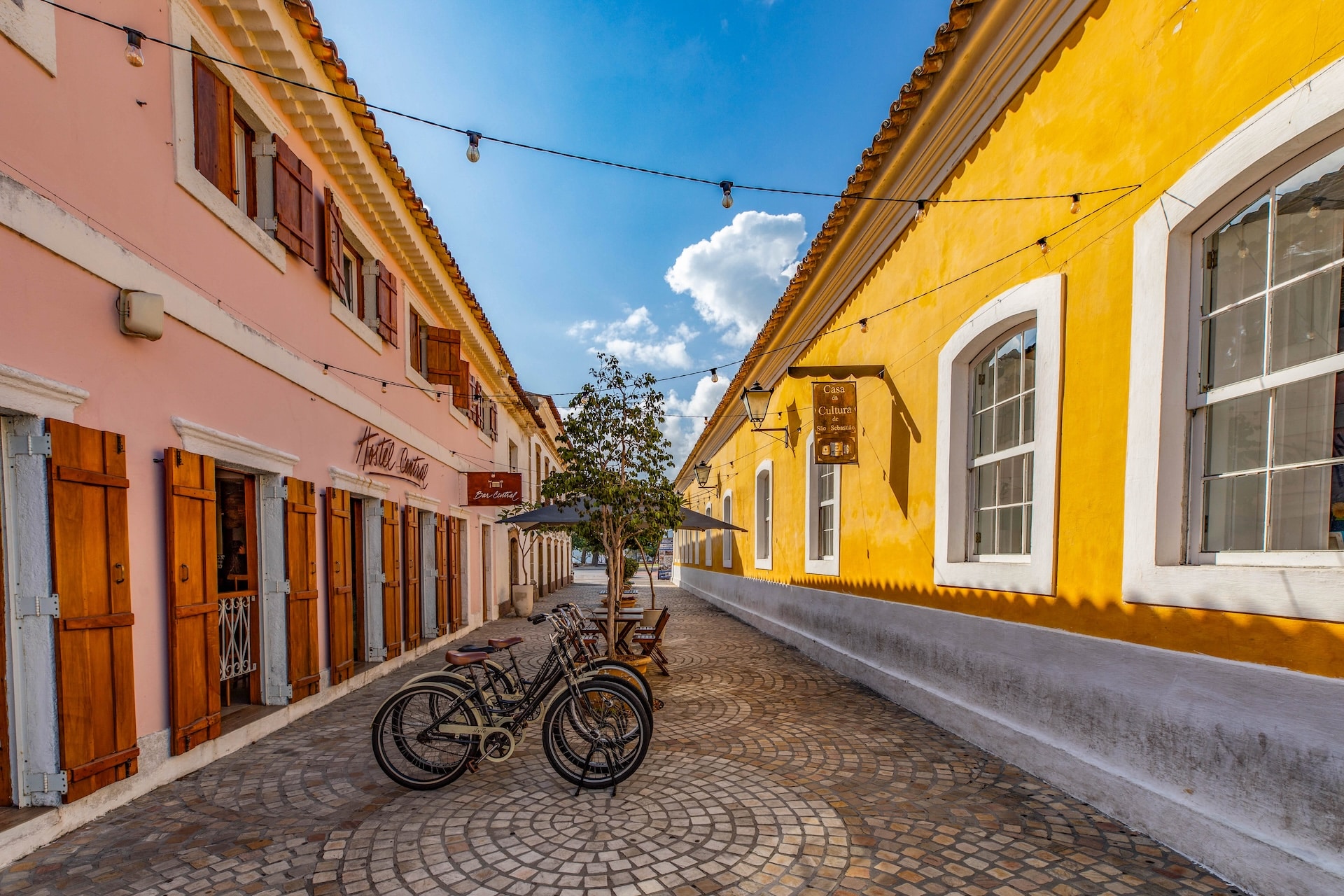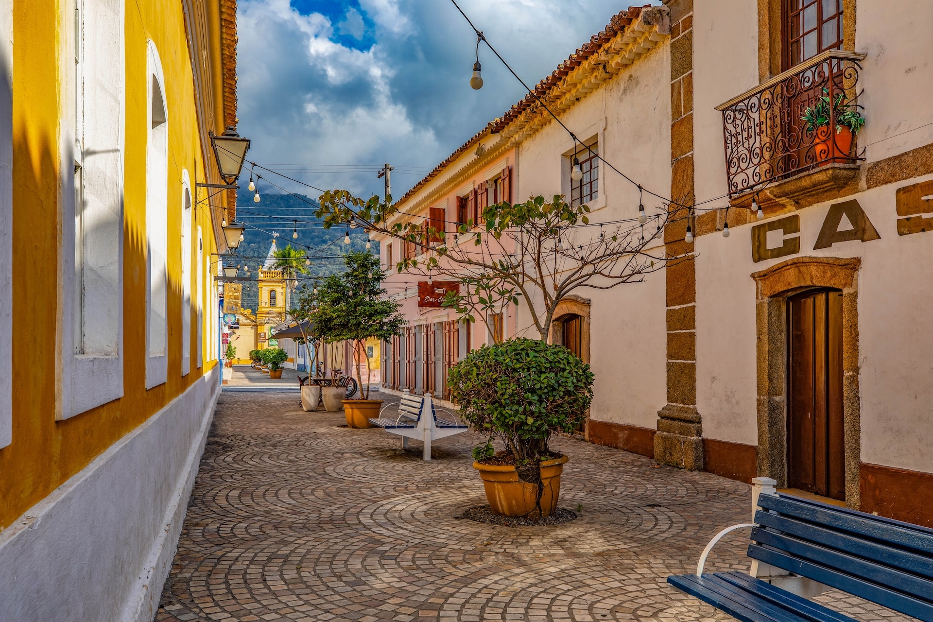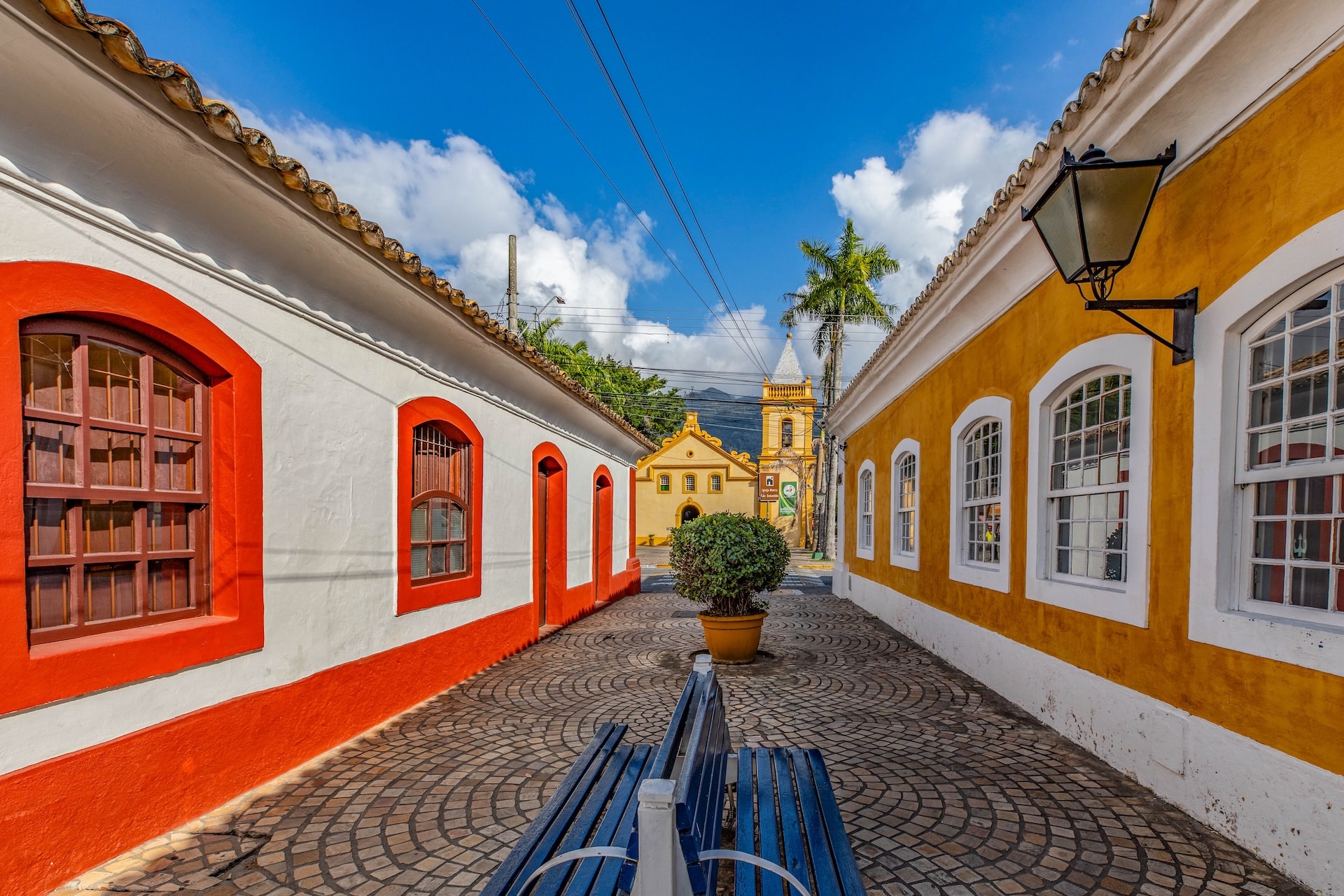 Via composta por casas históricas de estilo colonial no centro da cidade, com vista para a Igreja Matriz. O chão é revestido com ladrilhos circulares de cerâmica, formando padrão repetitivo.