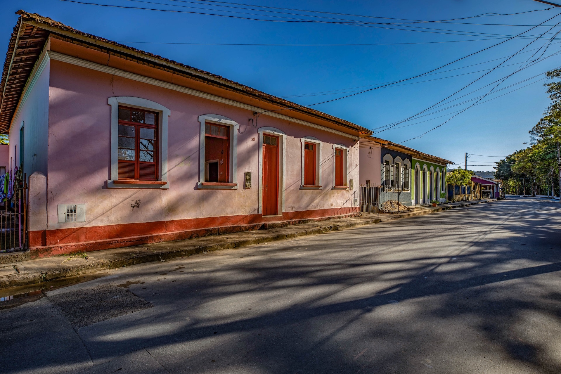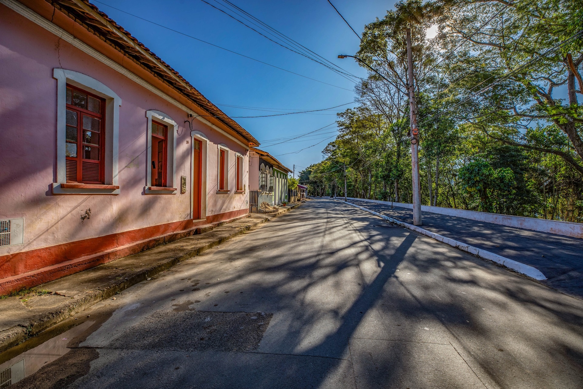 Vista da rua com casas coloniais de frente para o lago.