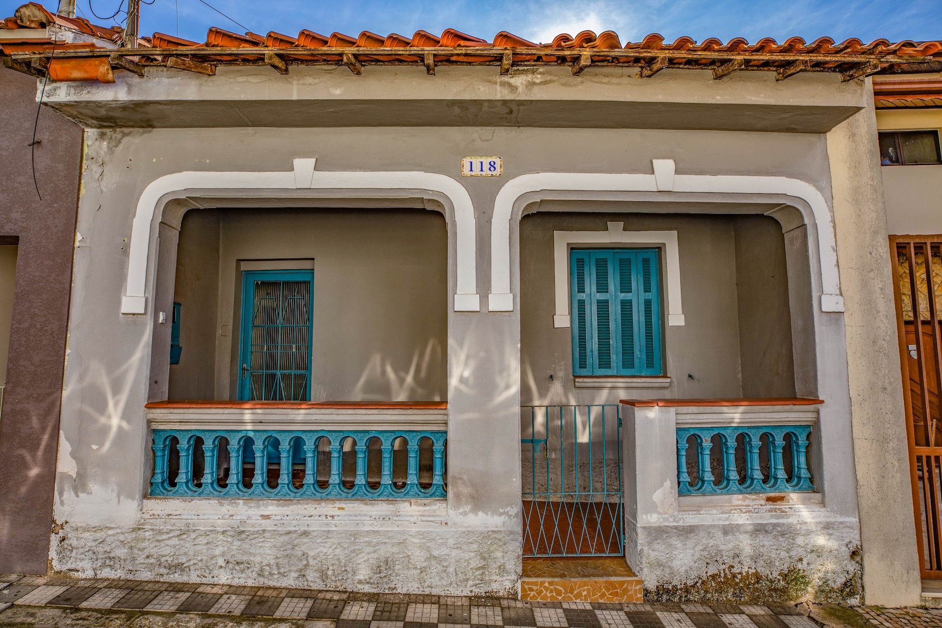 A fachada apresenta a estética típica das casas urbanas do século 20, marcada por dois vãos em arco reto, pilares e molduras brancas que contrastam com o tom cinza das paredes.