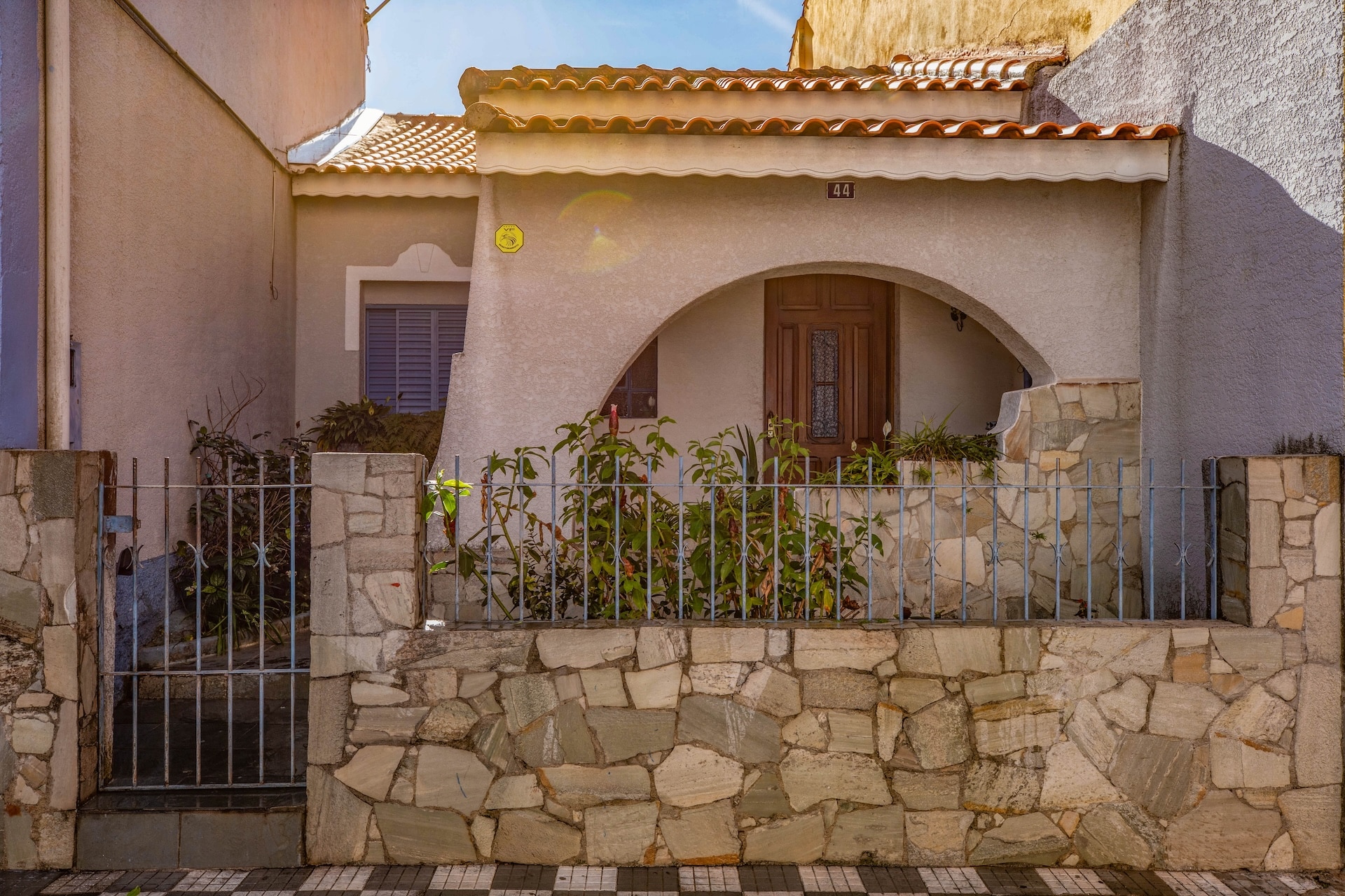 A casa, influenciada pelo estilo neocolonial, é marcada por elementos curvos, como o arco amplo na varanda, enquanto o muro e as bases da fachada apresentam pedras irregulares, conferindo uma atmosfera rústica ao local.