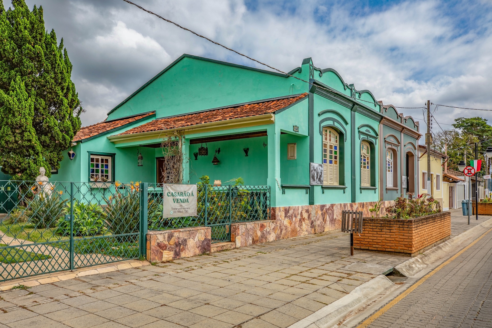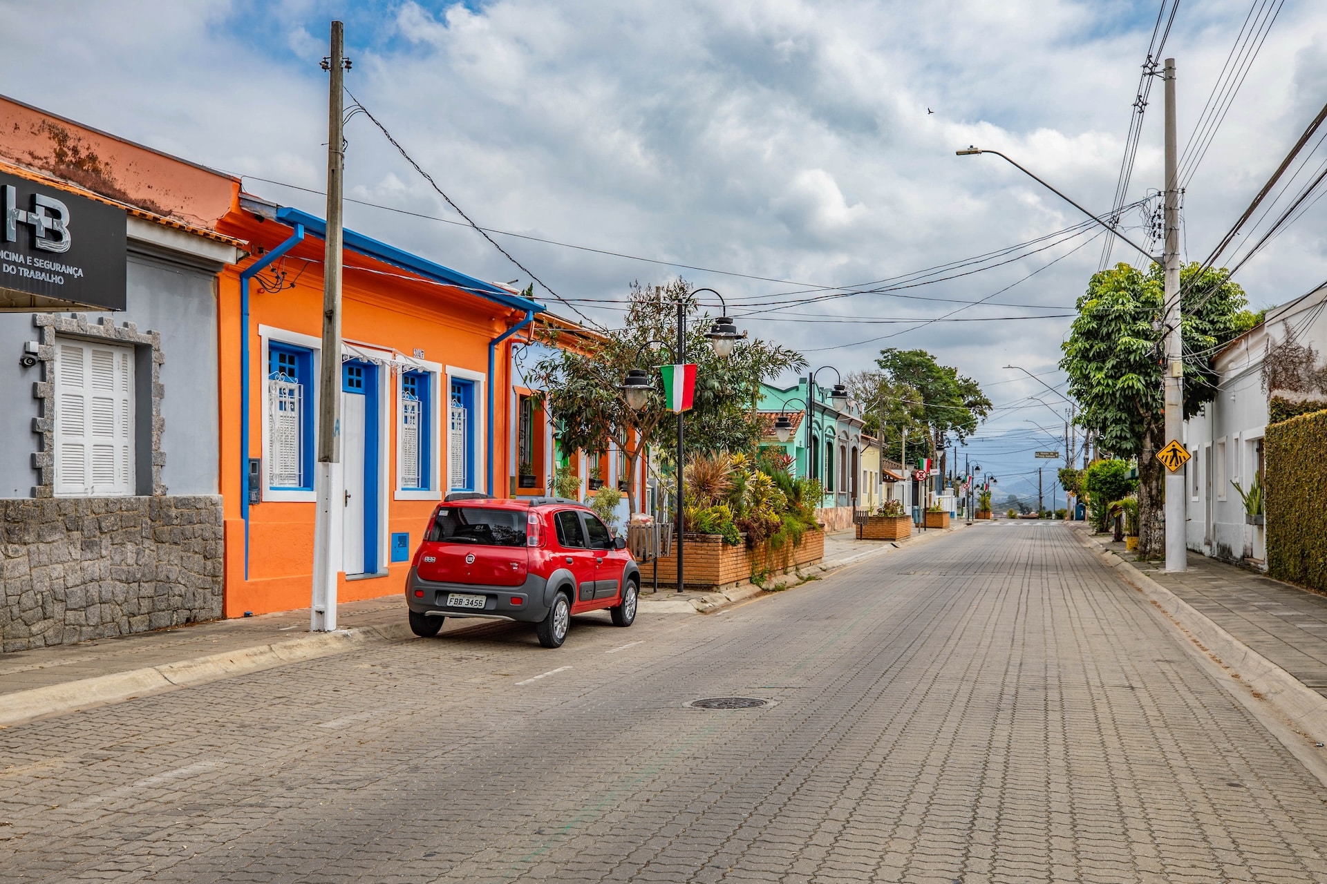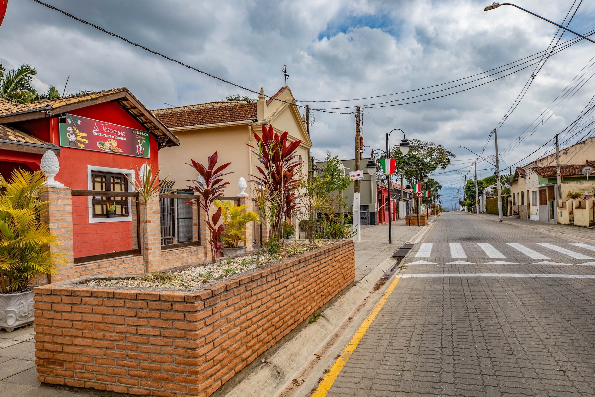 Vista panorâmica da rua com casas em estilo colonial, marcada pelas fotos das famílias imigrantes italianas e suas gerações exibidas nas fachadas.