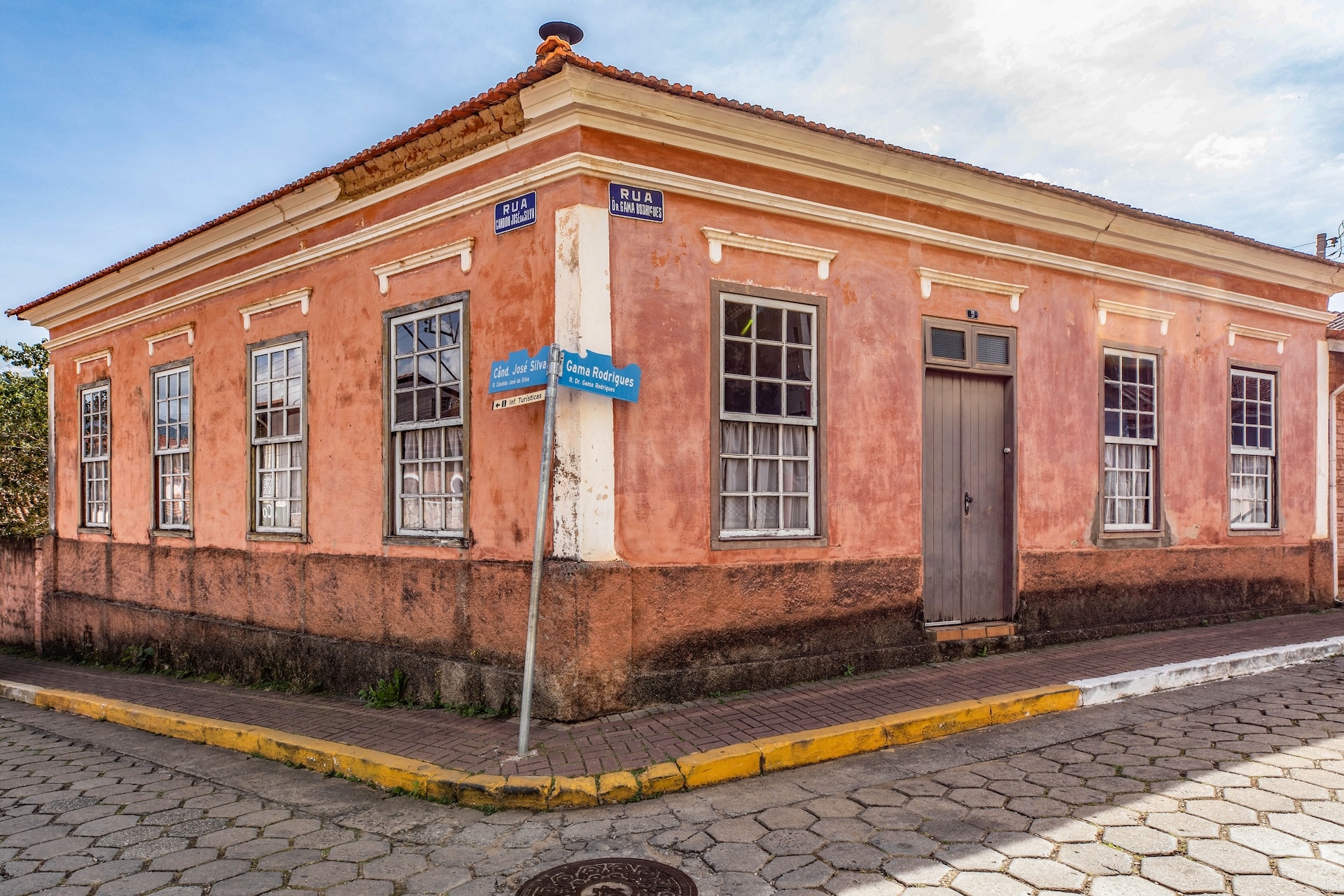 Casa de esquina em estilo colonial, marcada pela implantação junto à calçada e pela simetria das aberturas. As paredes descascadas em tom rosado evidenciam o desgaste natural pelo tempo.